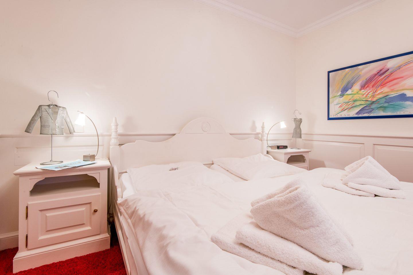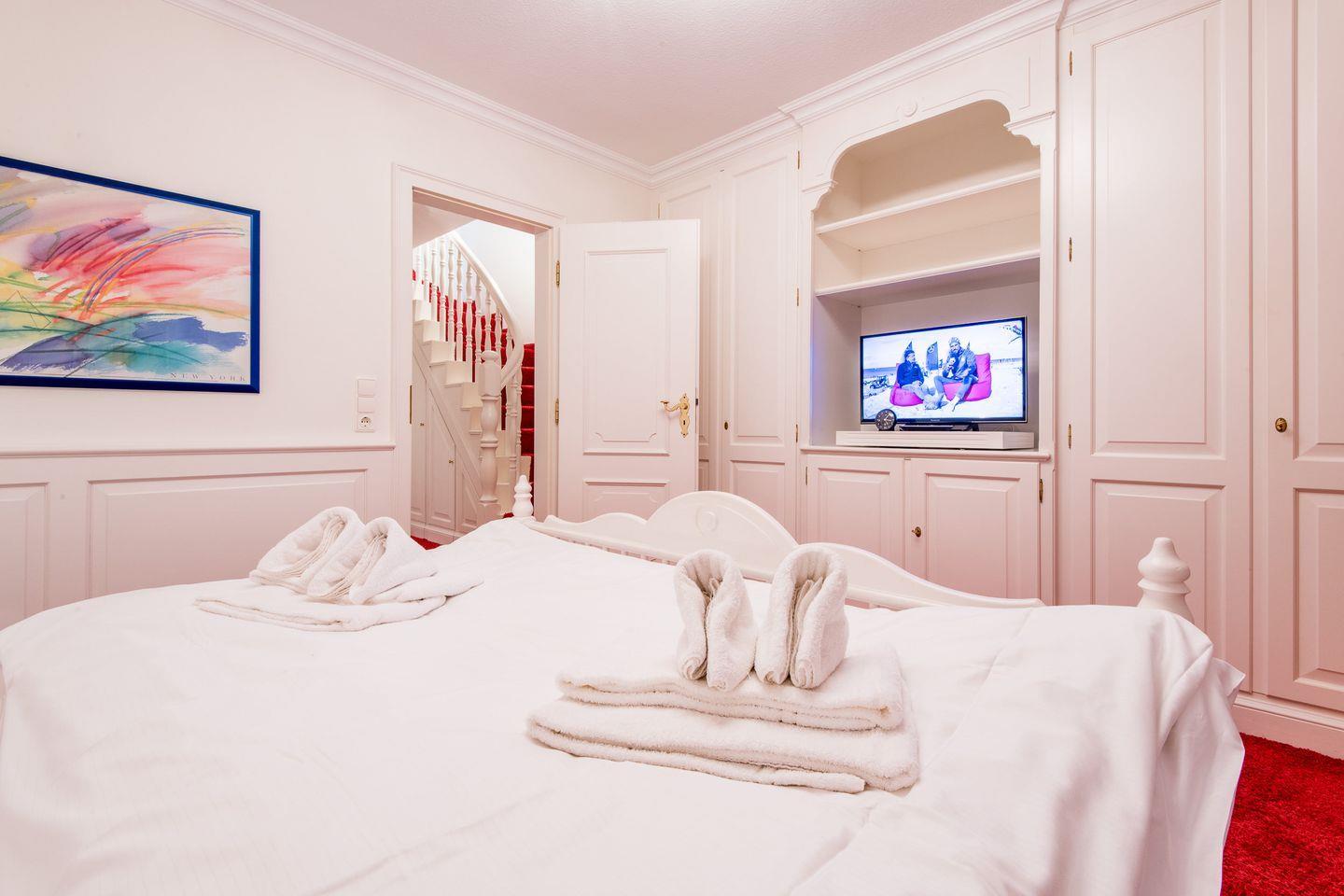 Das einladende Schlafzimmer im Untergeschoss ist mit einem komfortablen Doppelbett (2x 90x200 cm), einem Kleiderschrank und einem zusätzlichen TV ausgestattet. Hier finden Sie erholsamen Schlaf und eine angenehme Rückzugsmöglichkeit nach einem Tag voller Insel-Erlebnisse.