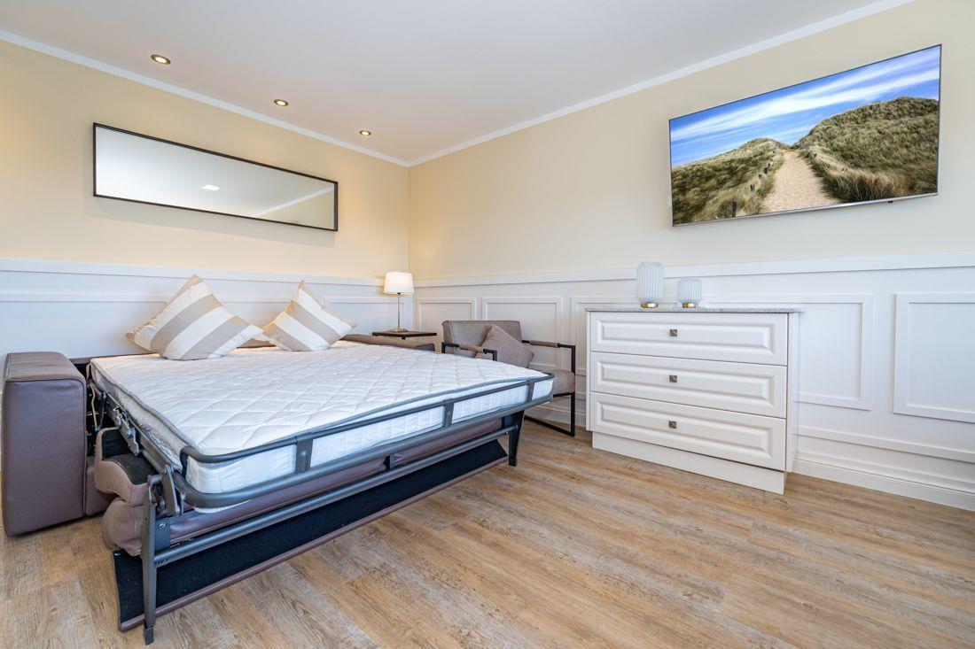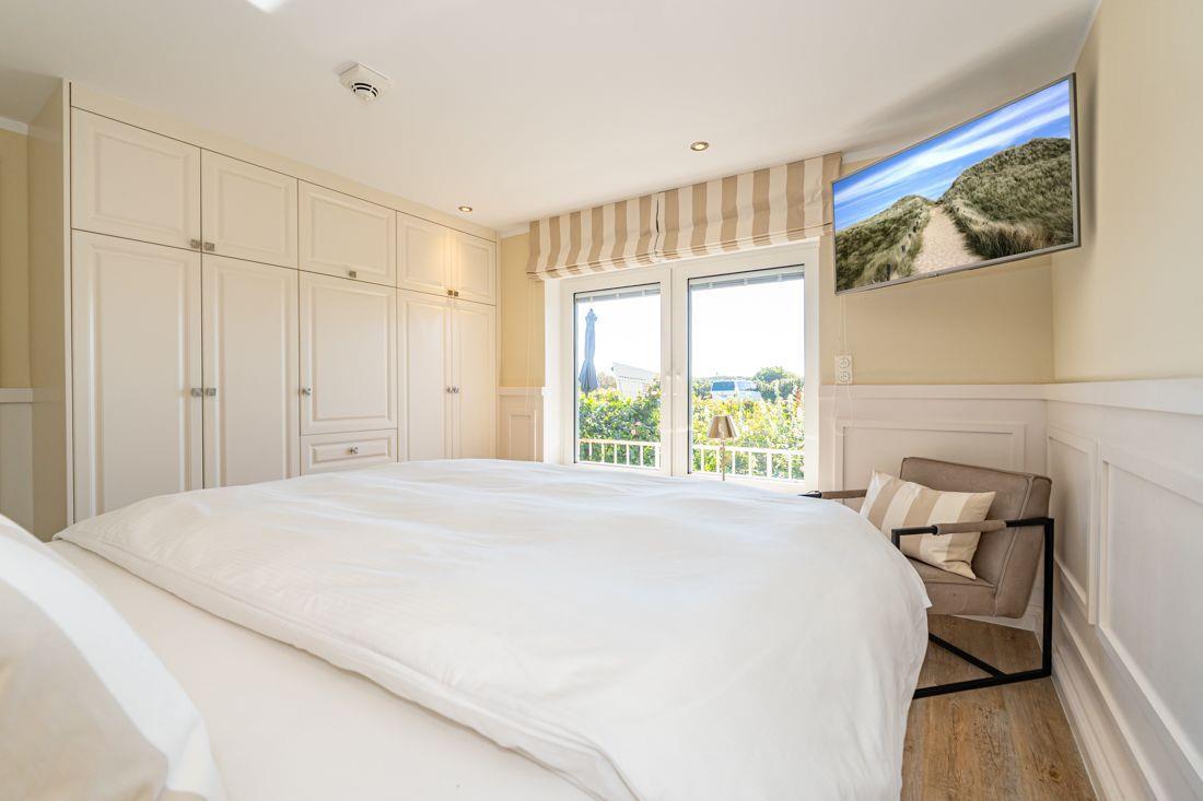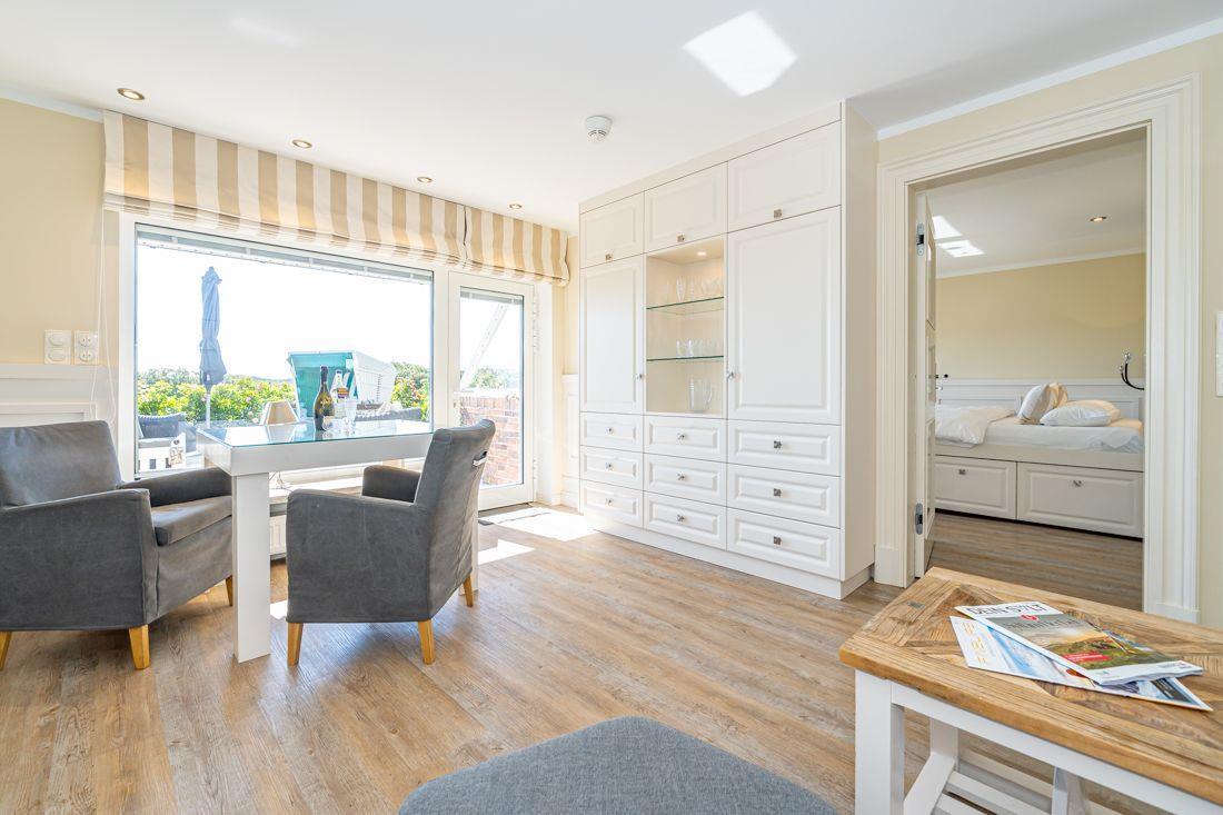 Luxus pur in Kampen auf Sylt! Buchungen ab 2 Übernachtungen! Genießen Sie von Ihrer Ferienwohnung den schönen, weiten Blick auf die Dünen. Das Wohnzimmer mit neuer, moderner, elektrischer Schlafcouch und gemütlicher Essecke verfügt über einen Flatscreen TV. Die angrenzende, offene Küche mit Ceran-Kochfeld, Mikrowelle, Geschirrspüler, WMF Kaffeefiltermaschine, Espressomaschine (Nespresso), Wasserkocher und Toaster sind selbstverständlich. Das Doppelschlafzimmer (160 x 200cm) verfügt über hochwertige Tischlereinbauten mit großzügigem Stauraum für Ihre Garderobe und verfügt über einen Flatscreen-TV. Das Bad ist ausgestattet mit Dusche, WC, Waschtisch und Fön. 2 Sonos Boxen mit dem Smartphone bedienbar stehen Ihnen zur Verfügung. Auf der angrenzenden Terrasse befindet sich ein Strandkorb und eine Gartengarnitur(nur saisonal verfügbar), hier können Sie den Tag bei einem Glas Wein und unverbaubaren Blick auf die Dünen (Südausrichtung) gemütlich ausklingen lassen. Eine Waschmaschine befindet sich im Bad. Das Rauchen in diesem Objekt nicht gestattet. Ein guterzogener Hund ist nach vorheriger Anmeldung gestattet (10,- € pro Tier/Tag).
