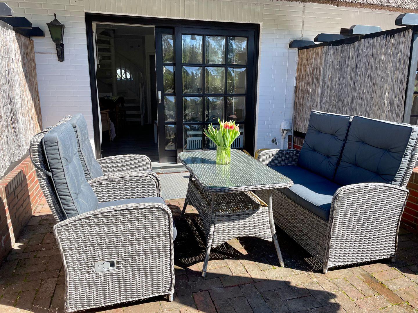 Zum Hausteil Robin Hood gehört eine schöne Terrasse, welche vom Wohnraum der Unterkunft begangen werden kann. Eingefriedet durch eine begrünte Natursteinmauer können Sie hier auf den vorhandenen Gartenmöbeln herrlich entspannen. Die Sitzgruppe mit Tische bietet zudem die Möglichkeit bei gutem Wetter das Urlaubsfrühstück ins Freie zu verlegen.