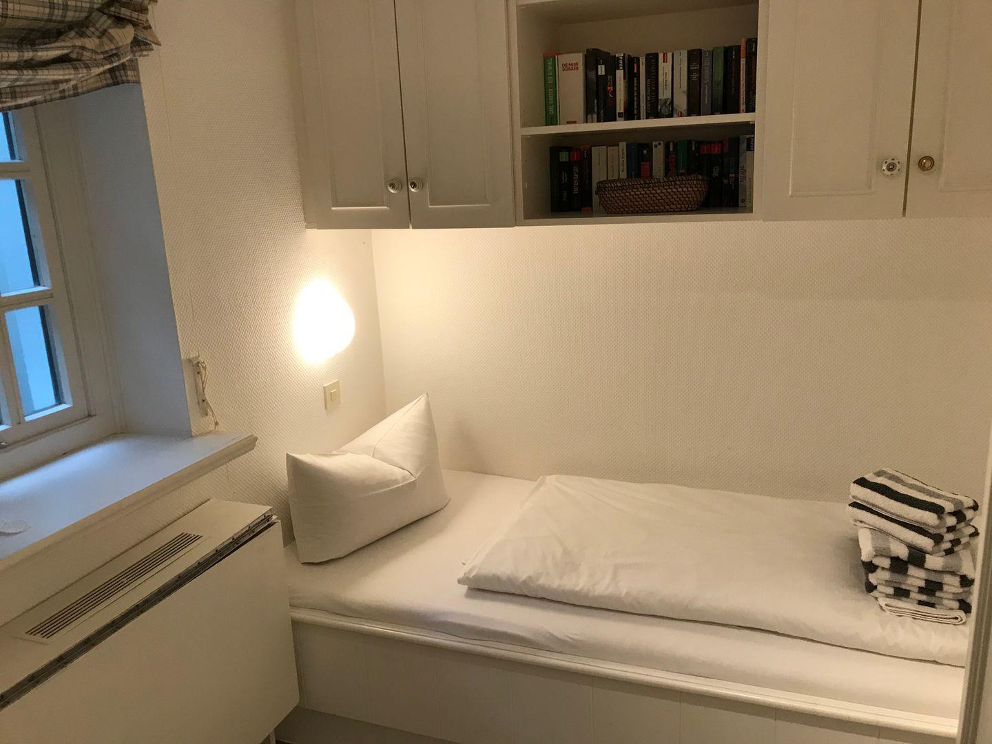 Auf der letzten Wohnebene befindet sich ein weiteres Schlafzimmer. Dieses ist mit zwei Einzelbetten ausgestattet und ebenfalls freundlich und einladend gestaltet. Auch hier wurden Staumöglichkeiten geschaffen, so dass der Raum nicht nur komfortabel, sondern auch praktisch nutzbar ist. Ein weiteres, innenliegendes Duschbad im modernen Stil sowie eine separate Toilette runden das Untergeschoss stimmig ab. In einer separaten Kammer im Keller des Hauses steht Ihnen eine Waschmaschine zur Verfügung.