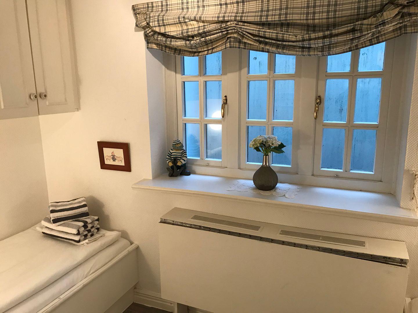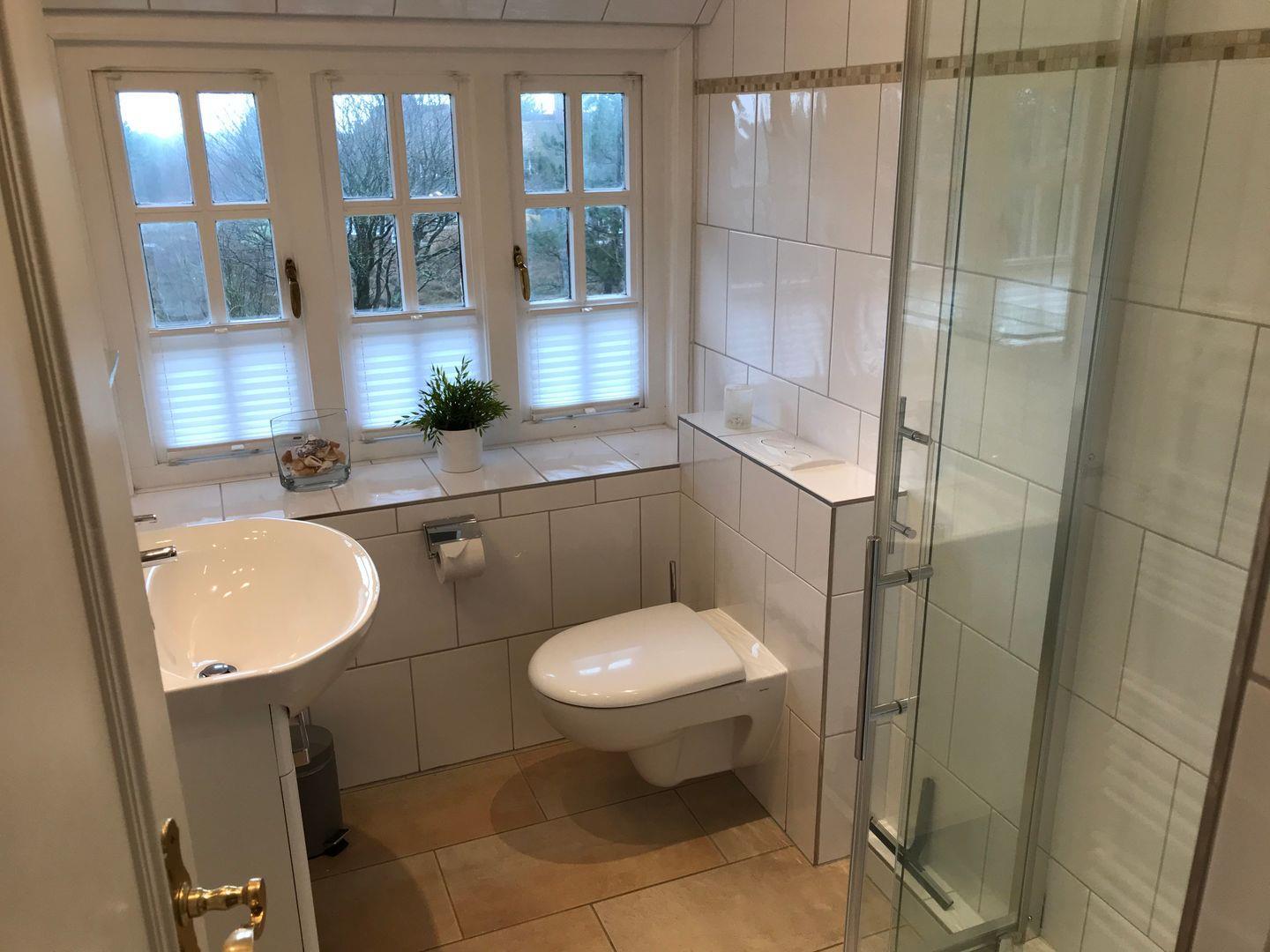 Über eine Wendeltreppe lassen sich sowohl das Ober-, als auch das Untergeschoss erreichen. Im Obergeschoss befindet sich das großes Doppelschlafzimmer. Schrägen sorgen hier ebenso wie die geschmackvoll ausgewählte Dekoration für Gemütlichkeit. Ein Einbauschrank bietet die Möglichkeit das eigene Gepäck gut zu verstauen. Das große Duschbad der Unterkunft grenzt direkt an das Schlafzimmer. Sprossenfenster sorgen für ein angenehmes Licht und viel Luft im Badezimmer. Weiße Fliesen mit umlaufender Bordüre und ein modernes Design setzen den Stil des Hauses auch im Badezimmer fort. Neben Waschtisch, Toiletten und Abstellflächen sorgen auch die feste Duschkabine sowie der Handtuchwärmer für reichlich Komfort im Badezimmer.