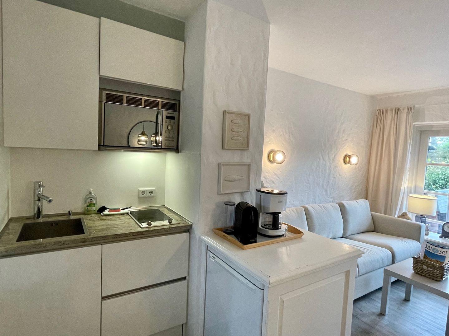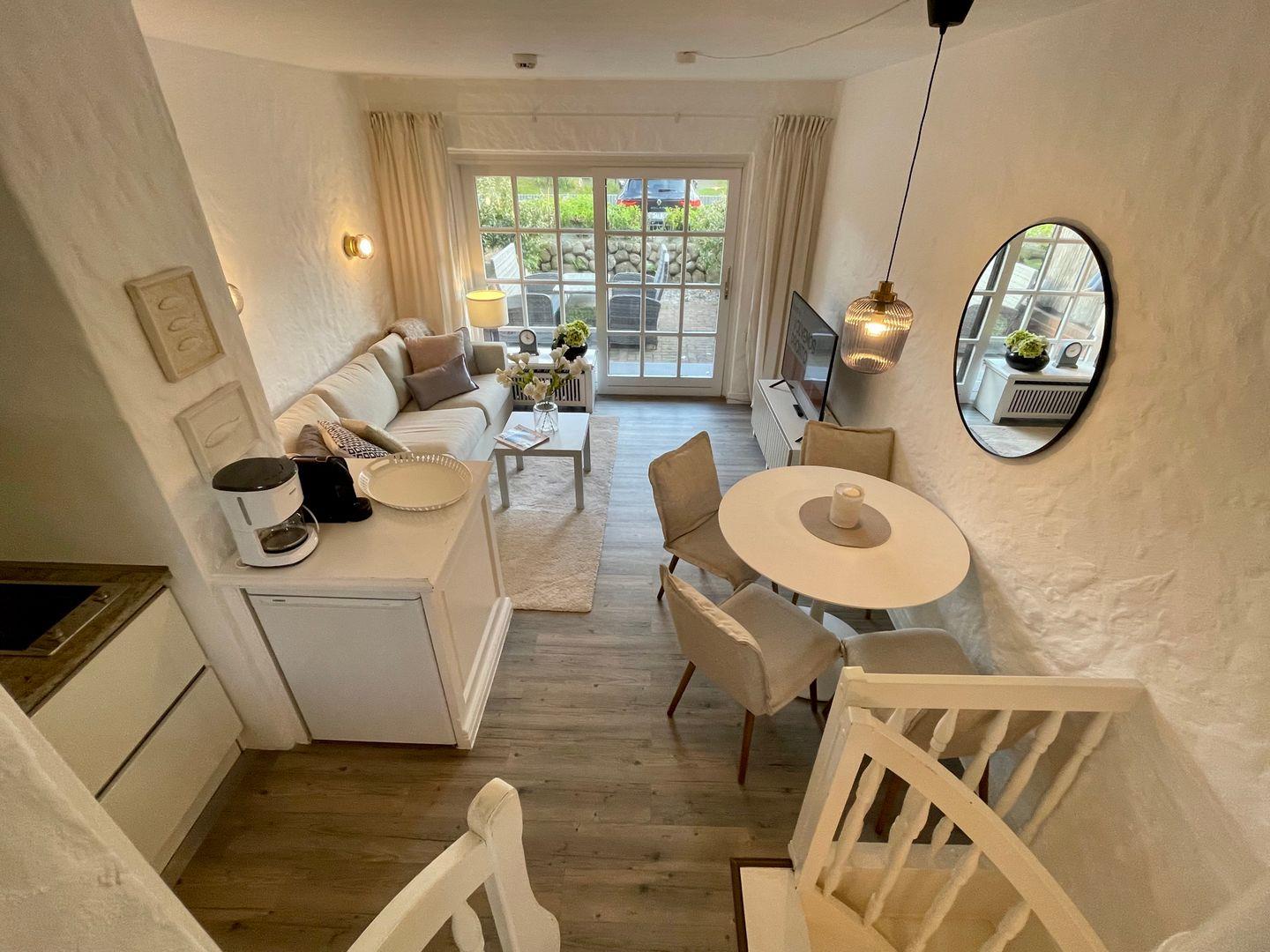 Der Wohnraum im Erdgeschoss ist offen gestaltet und verbindet einen Wohnbereich mit einladenden Polstermöbeln mit einem Essplatz und einer kleinen Küchenzeile. Der direkte Zugang zur Terrasse sorgt für viel Licht in Raum. Die Pantry Küche bietet trotz ihrer kompakten Größe alle nötigen Annehmlichkeiten für eine Selbstversorgung. Ein Ceranfeld mit zwei Platten, Kühlschrank, Spüle und Mikrowelle stehen ebenso zur Verfügung wie eine Kaffeemaschine, Wasserkocher und Toaster.