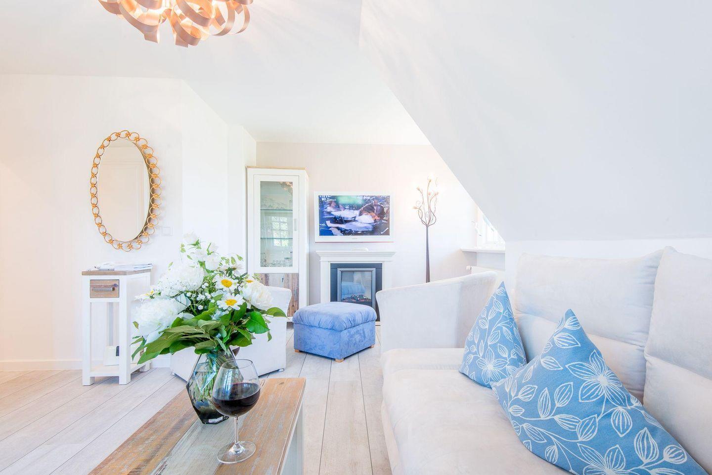 Der einladende Wohnbereich ist ausgestattet mit einem bequemen Sofa, einer gemütlichen Sitzecke und einem Esstisch für zwei Personen. Ein großes TV und ein Elektrokamin, der wohltuende Wärme spendet, sorgen für stimmungsvolle Abende. Durch die geschmackvolle Einrichtung und den einladenden Stil bietet das Wohnzimmer einen idealen Rückzugsort nach einem langen Tag auf der Insel.