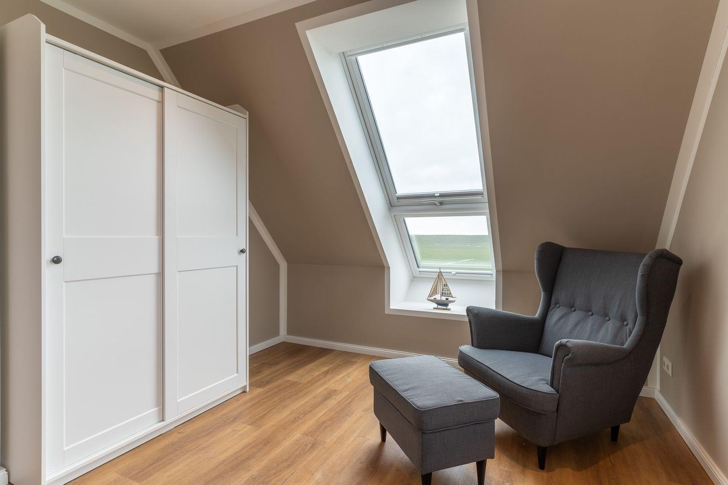 Der Wohn-Essbereich ist mit einer hochwertigen Küche vollausgestattet. Der Raum ist lichtdurchflutet und bietet direkten Zugang zum Garten. Auf der nach Westen ausgerichteten Gartenseite steht Ihnen eine möblierte Terrasse mit Strandkorb und Holzkohlegrill zur Verfügung. Außerdem befindet sich das erste von 3 Schlafzimmern und ein Gäste-WC im Erdgeschoß. Dieses Schlafzimmer ist mit einem Etagenbett ausgestattet. Von daher ist die Wohlfühlbelegung 4 Erwachsene und 2 Kinder. Über die Holztreppe gelangen Sie ins Obergeschoß wo sich die anderen beiden Schlafzimmer befinden. Von diesen Zimmern haben Sie Blick auf den Deich und die dahinter liegende Eider. Des weiteren befindet sich ein Badezimmer mit ebenerdiger Dusche im Obergeschoß.