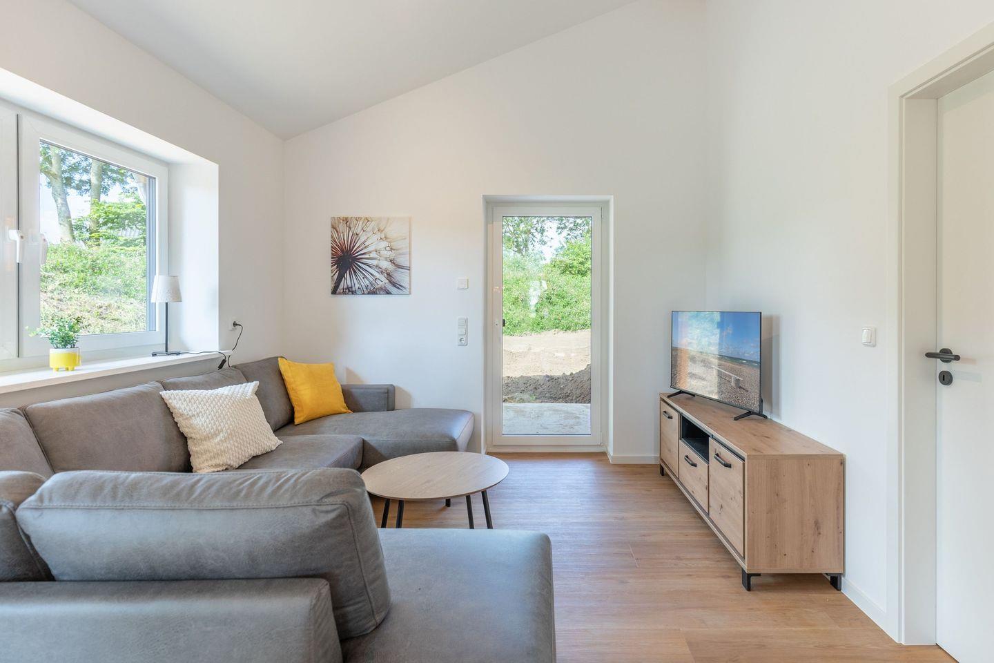 Die offene Küche ist voll ausgestattet mit Induktionskochfeld, Backofen, Mikrowelle, Spülmaschine, Senseo-Kaffeemaschine und Kühlschrank mit Gefrierfach – perfekt für gemeinsame Kochabende. Im gemütlichen Wohnbereich laden eine Sofaecke und ein Smart-Fernseher zum Verweilen ein. Kostenloses, schnelles WLAN hält Sie jederzeit online. Der angrenzende Essbereich bietet ausreichend Platz für alle Gäste.
