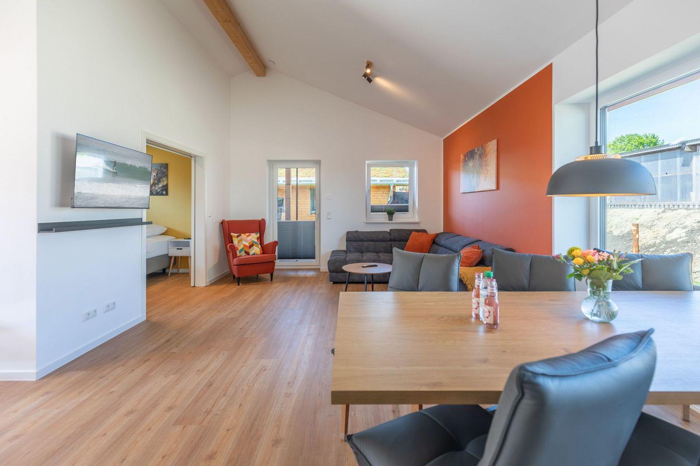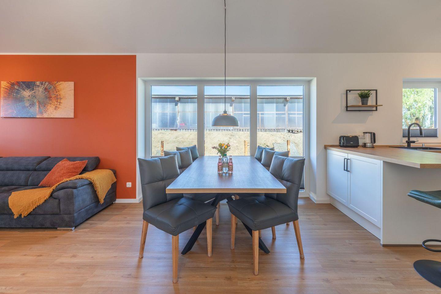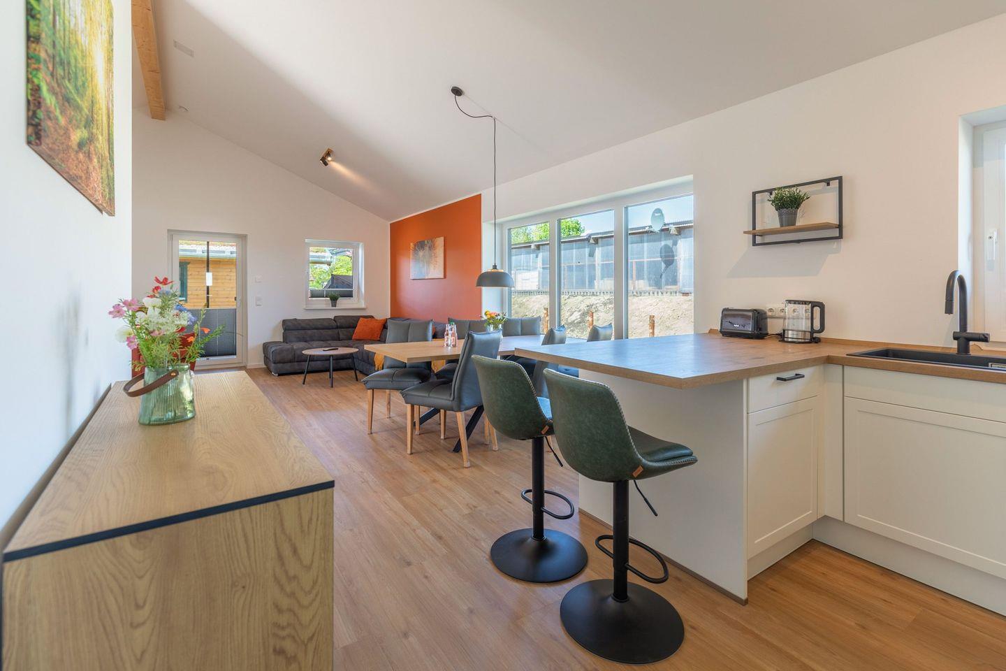 Die offene Küche ist voll ausgestattet mit Induktionskochfeld, Backofen, Mikrowelle, Spülmaschine, Senseo-Kaffeemaschine und Kühlschrank mit Gefrierfach – perfekt für gemeinsame Kochabende. Im gemütlichen Wohnbereich laden eine Sofaecke und ein SMART-Fernseher zum Verweilen ein. Kostenloses, schnelles WLAN hält Sie jederzeit online. Der angrenzende Essbereich bietet ausreichend Platz für alle Gäste.