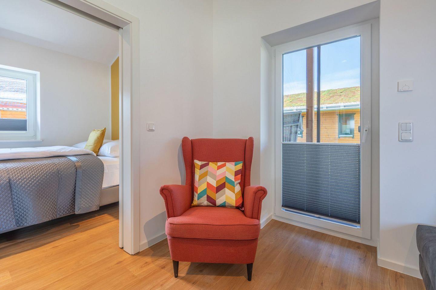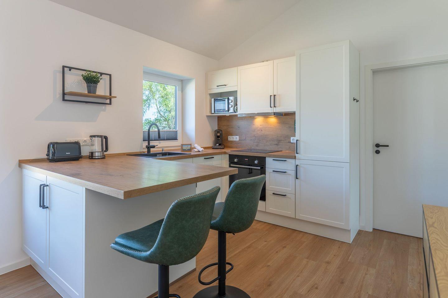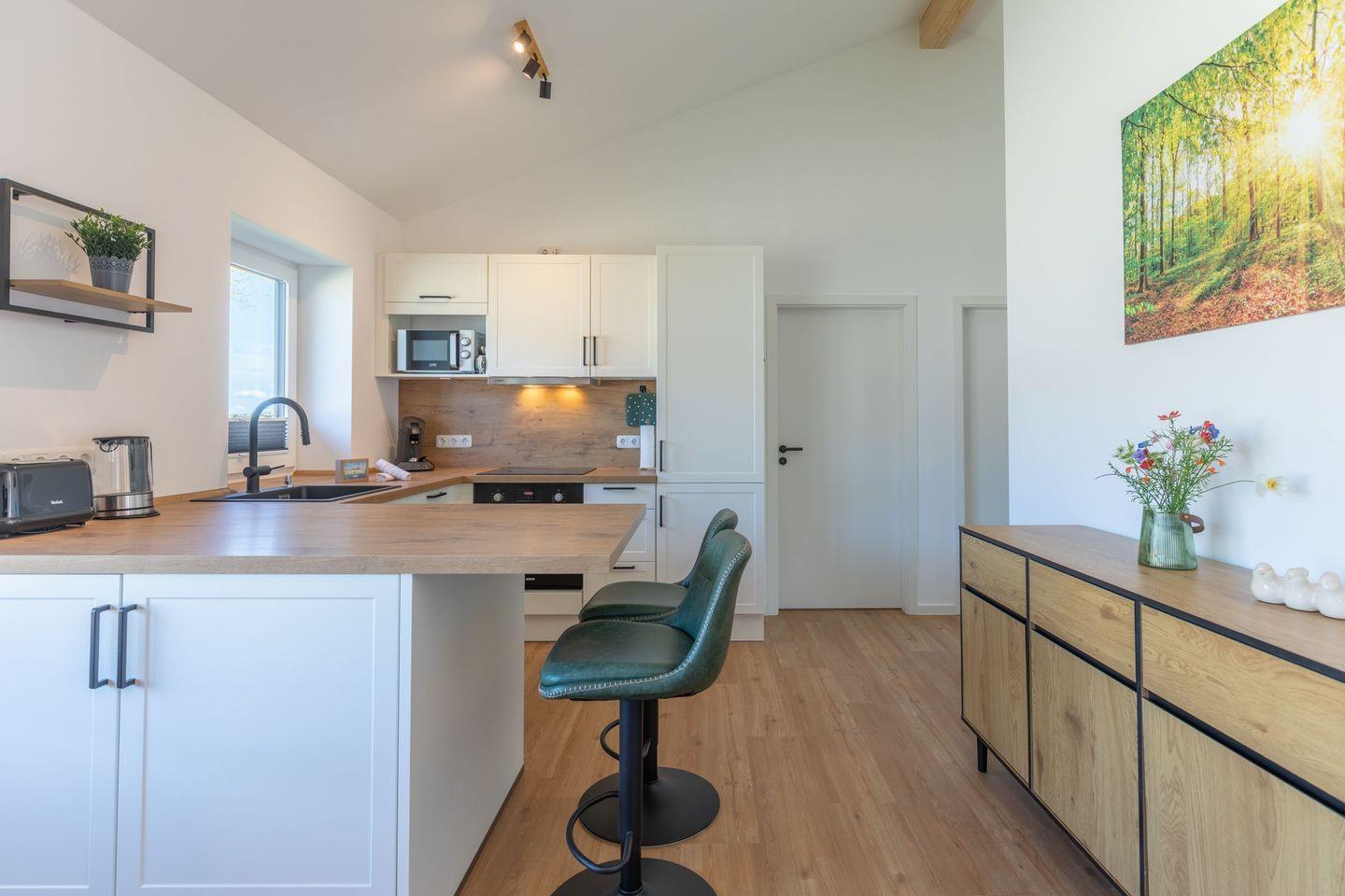 Die offene Küche ist voll ausgestattet mit Induktionskochfeld, Backofen, Mikrowelle, Spülmaschine, Senseo-Kaffeemaschine und Kühlschrank mit Gefrierfach – perfekt für gemeinsame Kochabende. Im gemütlichen Wohnbereich laden eine Sofaecke und ein SMART-Fernseher zum Verweilen ein. Kostenloses, schnelles WLAN hält Sie jederzeit online. Der angrenzende Essbereich bietet ausreichend Platz für alle Gäste.