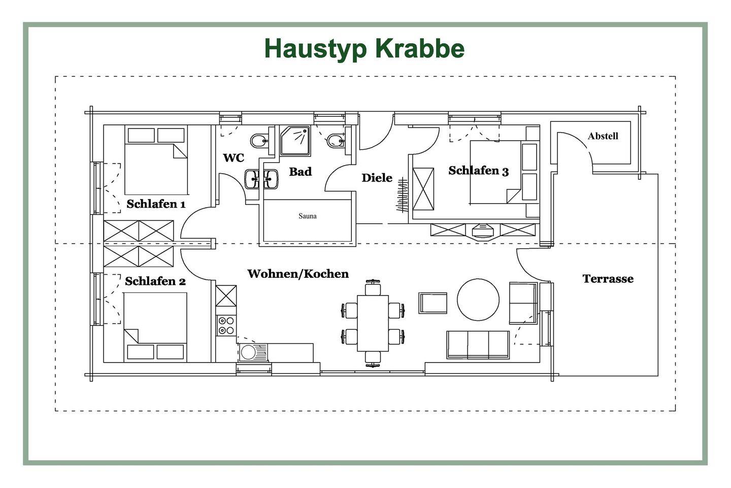 Das freistehende Ferienhaus bietet auf 81 m² Platz für bis zu 6 Personen und ist ideal für Familien und Gruppen. Es verfügt über insgesamt 4 Zimmer, darunter 3 behagliche Schlafzimmer mit bequemen Boxspring-Doppelbetten (180x200) und Kleiderschränken.