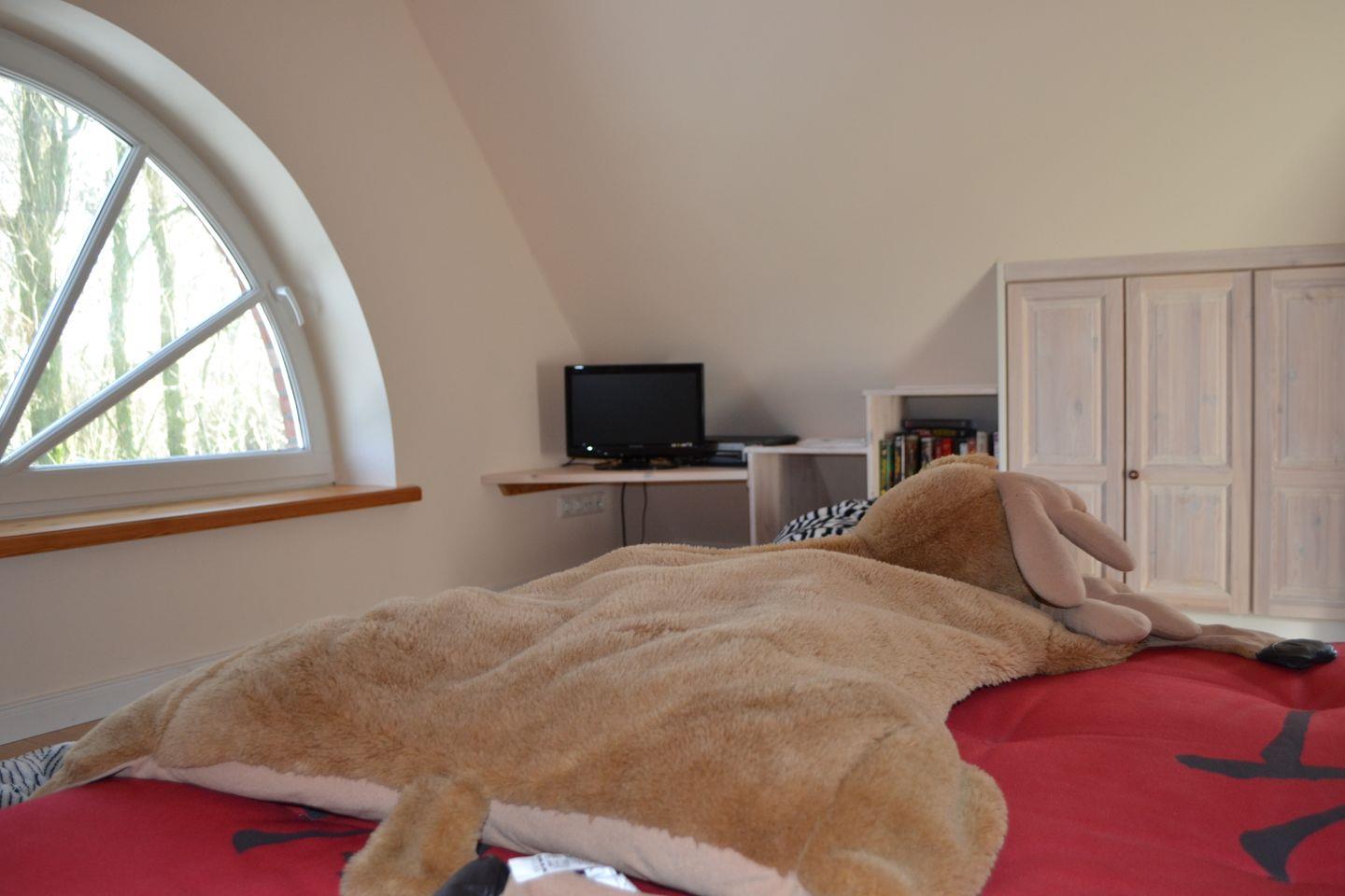 Schlafzimmer mit Doppelbett (160 x 200 cm), SAT-TV und Videorekorder. Videofilme, Spiele und Bücher