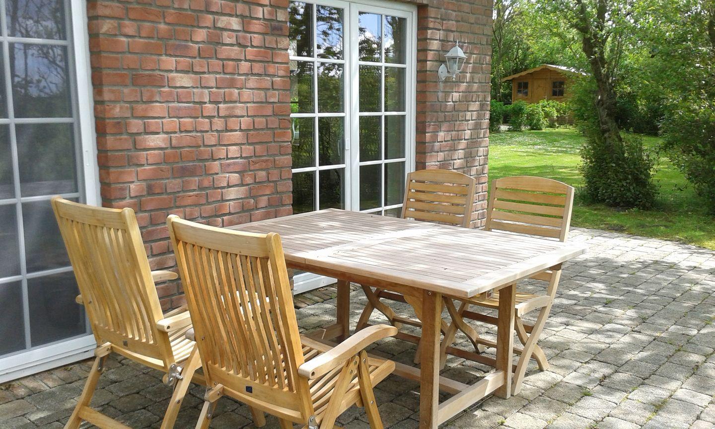 Terrasse mit Gartenmöbeln und Strandkorb