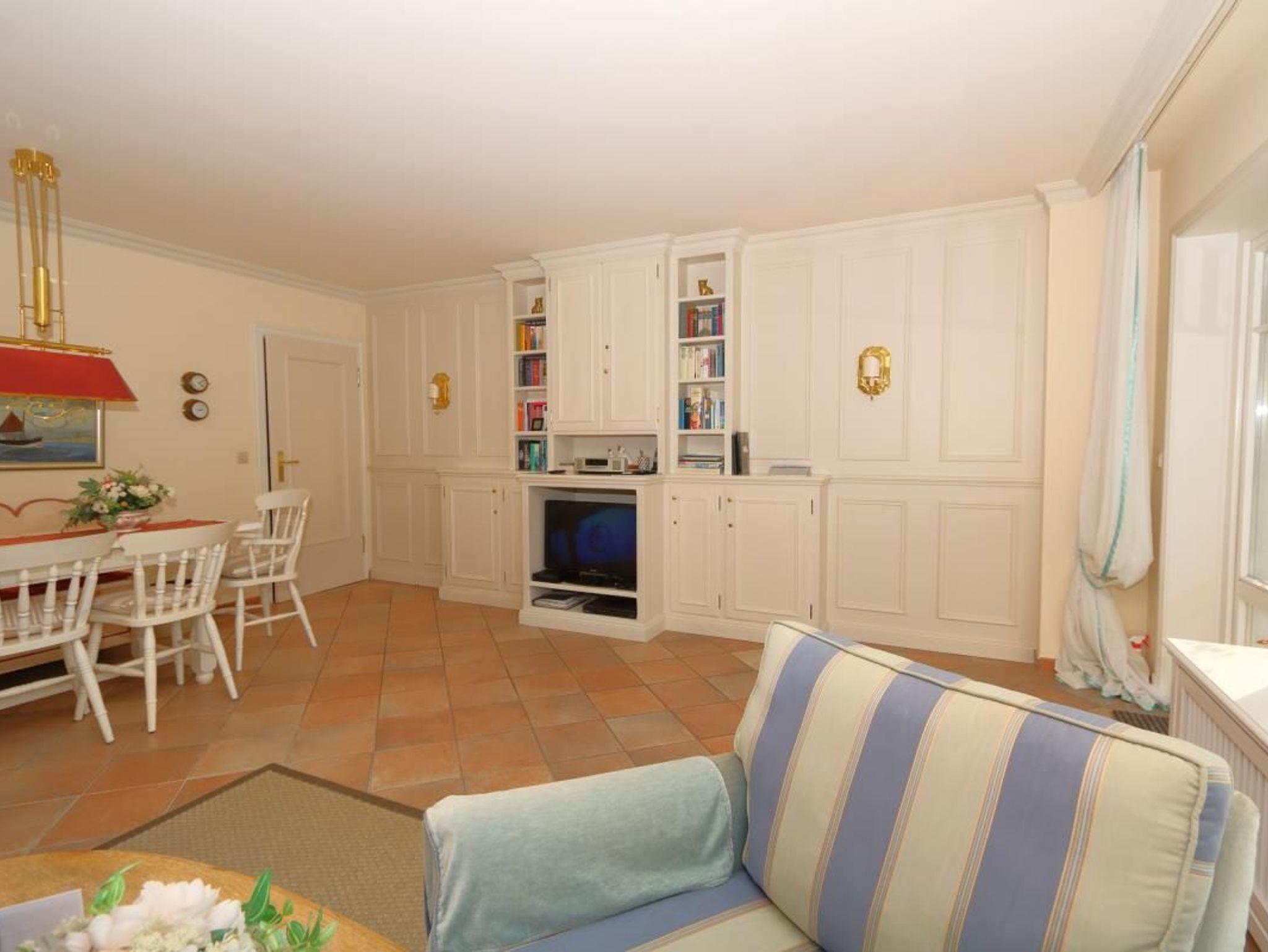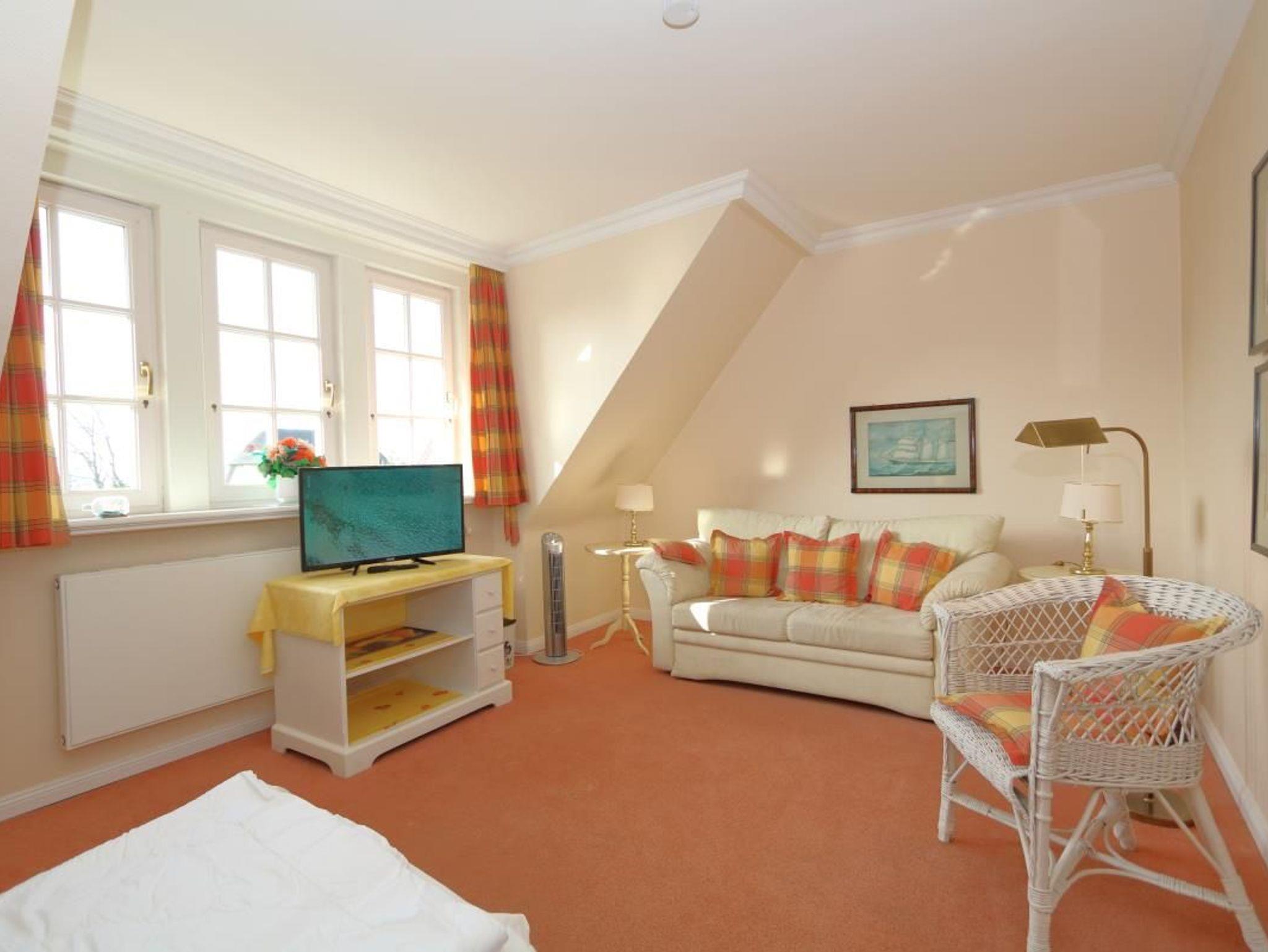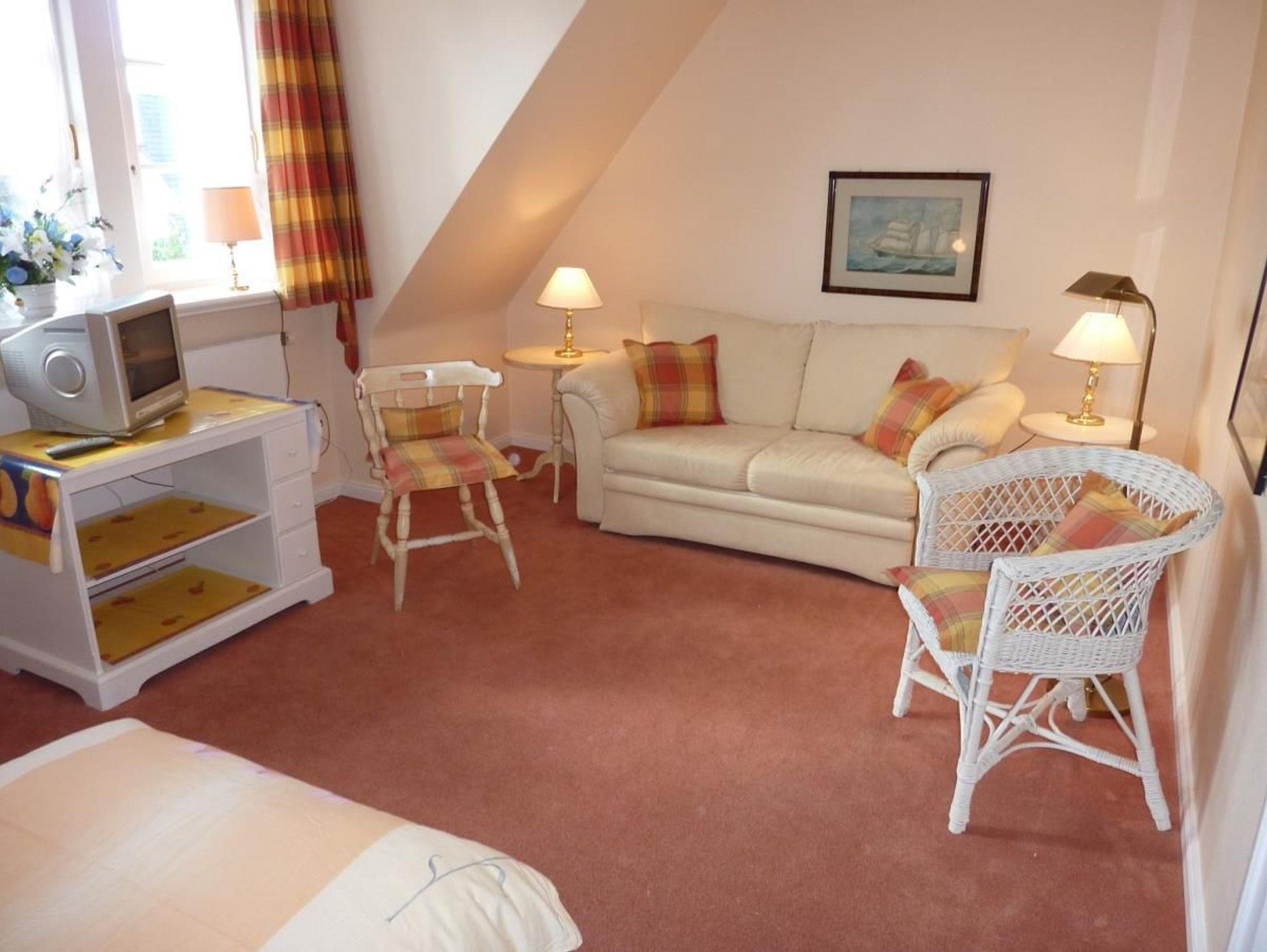 An das Wohnzimmer schließt eine sonnige Südterrasse mit kleinem Garten an. Strandkorb und Gartenmöbel sind vorhanden.