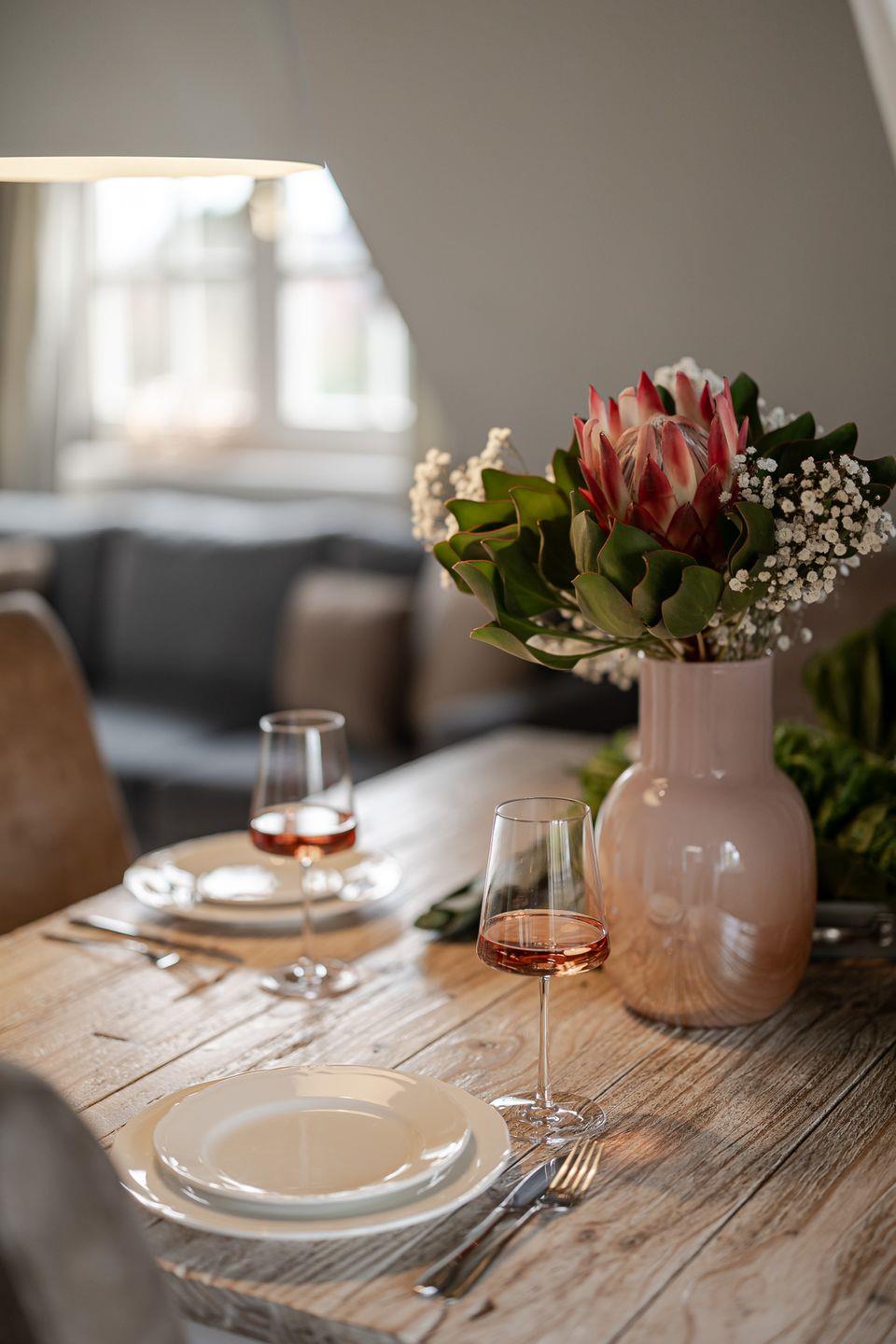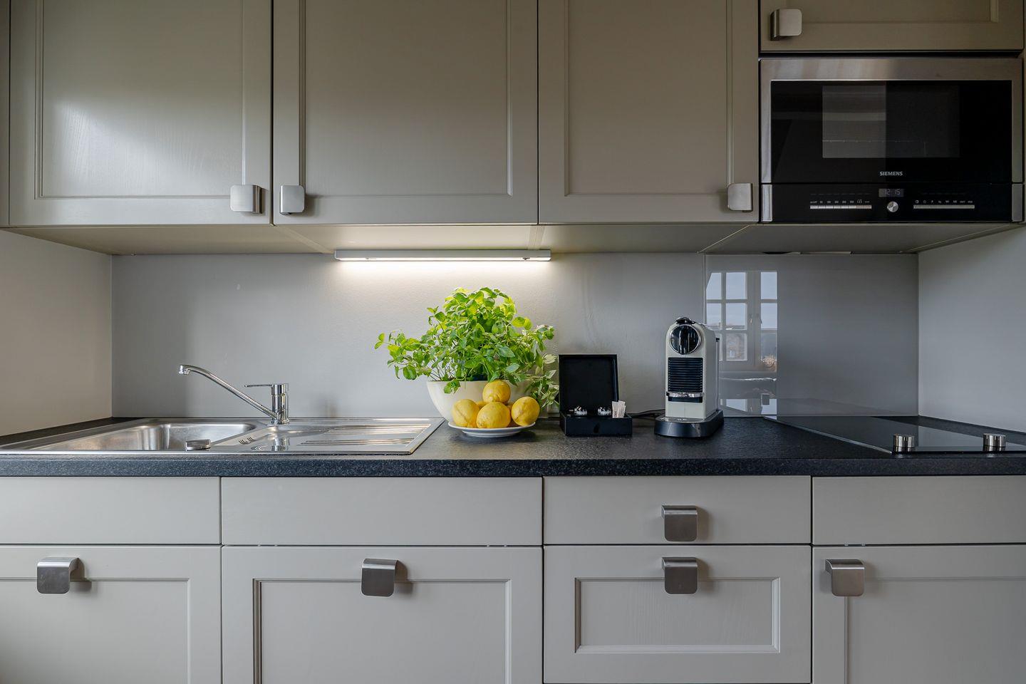Die Wohnung beeindruckt mit ihrem eleganten und gleichzeitig verspielten Ambiente. Der großzügige Wohnbereich mit ausziehbarem Schlafsofa und gemütlichem Essplatz bildet das Herzstück der Wohnung. In der hellen, voll ausgestatteten Küche inklusive Filterkaffeemaschine macht das Kochen Spaß und wird zum gemeinsamen Genuss.
