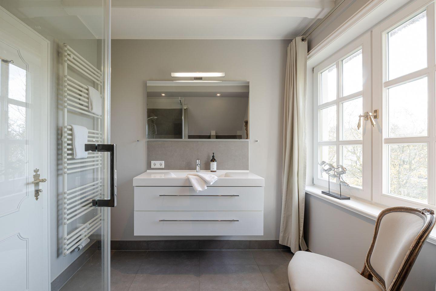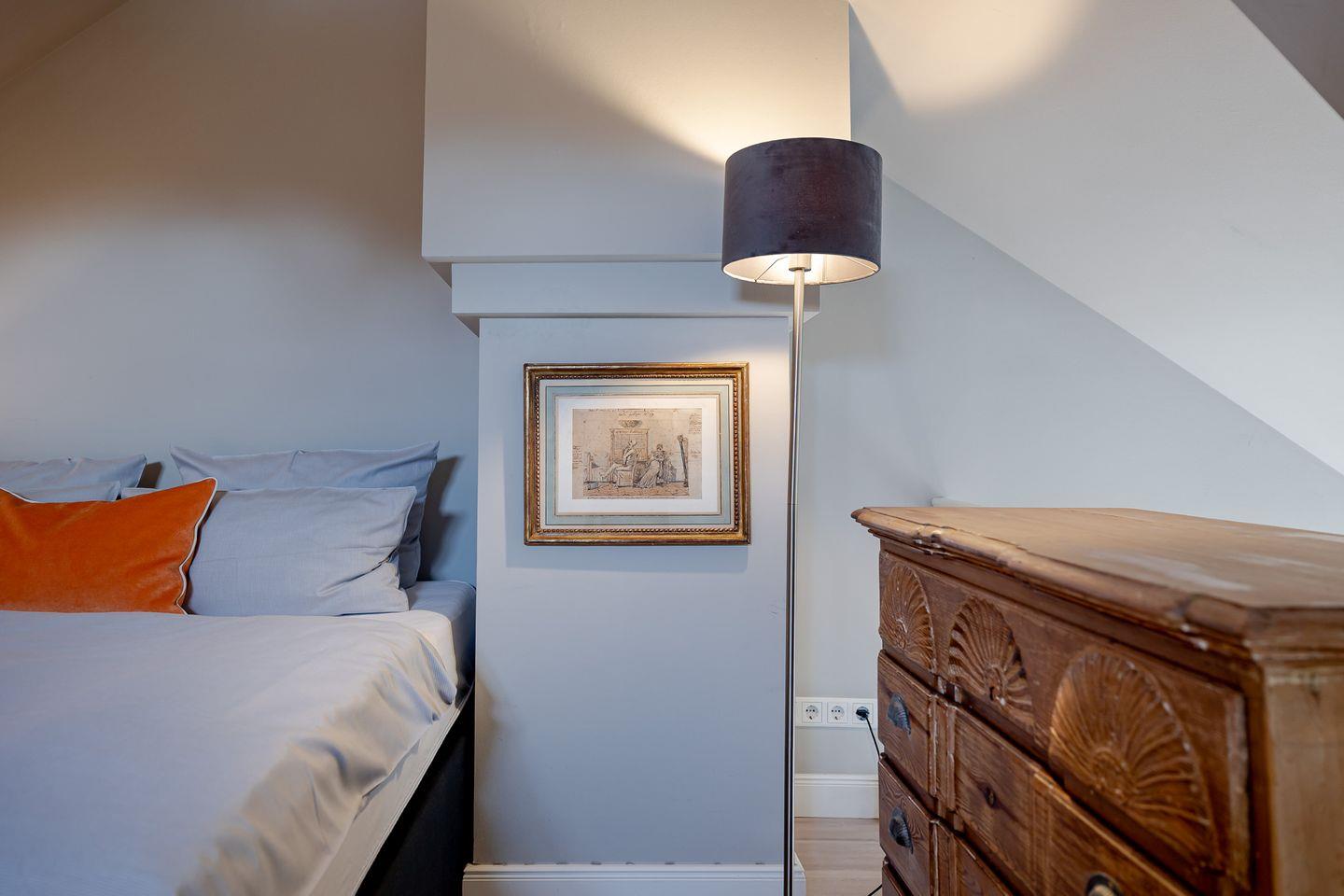 Im komfortablen Schlafzimmer mit hochwertigem Boxspringbett finden Sie erholsame Nachtruhe, während das stilvolle Badezimmer mit bodengleicher Dusche für entspannende Wohlfühlmomente sorgt.