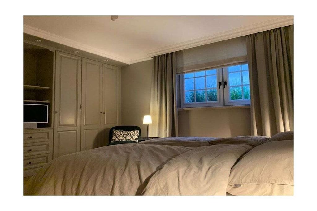 Parterre: (Wohn/Esszimmer(Doppelschlafcouch, TV, Esstisch, Kaminofen), Schlafzimmer(Doppelbett, TV), Schlafzimmer(Doppelbett, TV), Schlafzimmer(Doppelbett, TV), Badezimmer(Badewanne, Dusche, Waschbecken, Toilette), Badezimmer(Badewanne, Dusche, Waschbecken, Toilette)) , , , guest toilet(, Toilette, Waschbecken), Internet, Trockner, Waschmaschine, Heizung, Terrasse(, Strand, Gartenmöbel, Liegen), Garten(Sauna, Strand, Liegewiese, Gartenmöbel, Liegen), Parkplatz, Bügelbrett, Bügeleisen