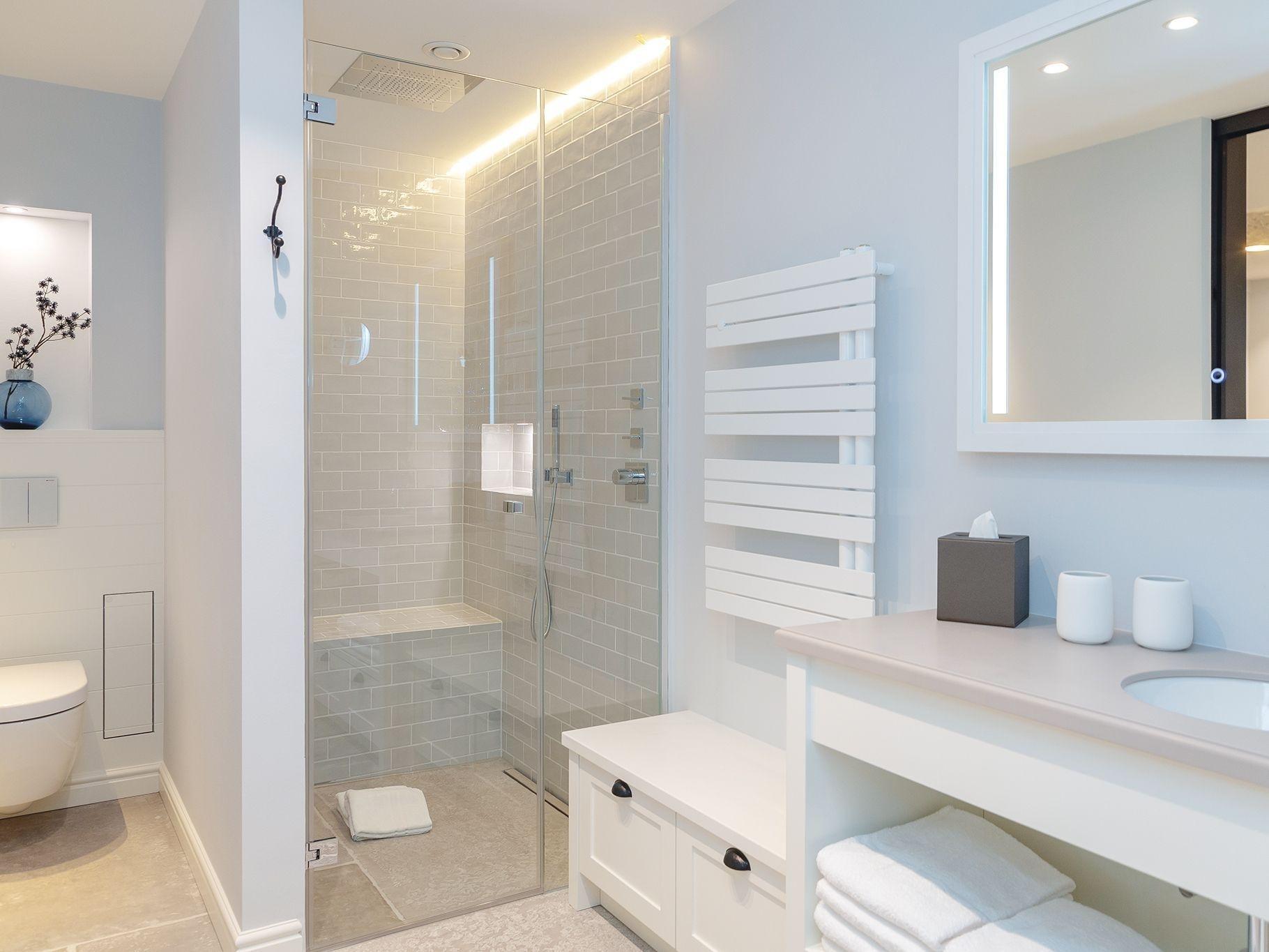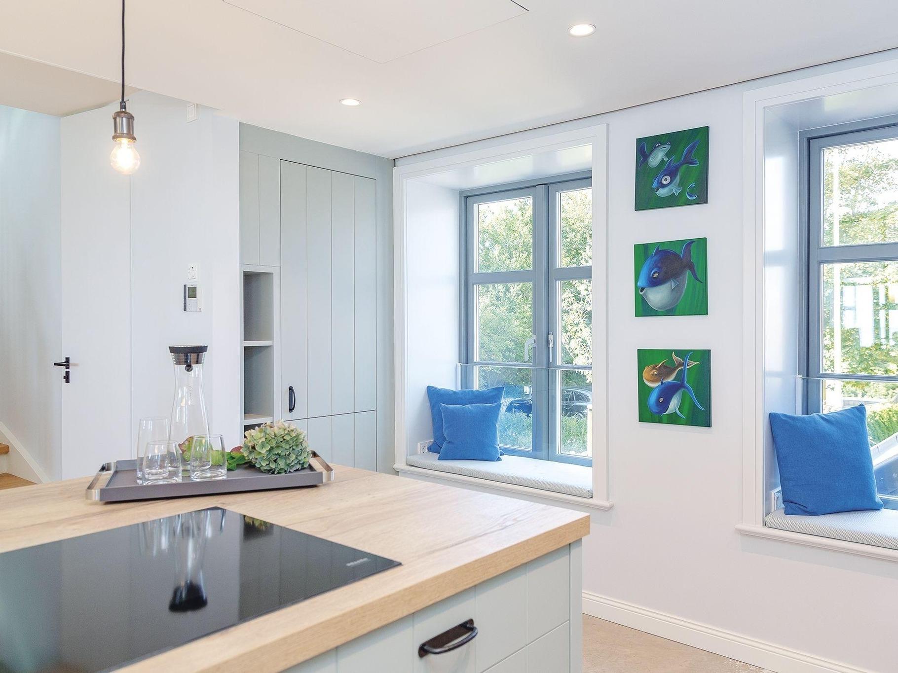 Früher geschäftiges Packhaus am Keitumer Hafen - heute exklusiver Logenplatz mit unvergleichlichem Wattblick. Dieses exklusive Ferienquartier gehört nicht ohne Grund zu den "Keitumer Geschichtspunkten" - das Endhausteil für bis zu sechs Gäste lässt keine Wünsche offen. Im ebenerdigen Eingangsbereich auf der Westseite finden Sie große Einbauschränke und ein Gäste-WC. Ein elegantes Doppelschlafzimmer samt Bad mit Dusche und Wanne schließen an. Von hier haben Sie auch Zugang zu der privaten Terrasse mit unvergleichlich schönem Wattblick gen Sonnenaufgang. Über eine elegante Treppe erreichen Sie das stilvoll eingerichtete Untergeschoss mit extragroßem Spiegel und vielen Einbauschränken. Nebenan erwartet Sie ein weiteres nicht minder behagliches Doppelschlafzimmer und ein Bad mit XXL-Dusche en suite. Im 1. OG meint man über dem Watt zu schweben. Von dieser komplett offen gestalteten Etage mit voll ausgestatteter Küche, einladend großem Esstisch, Elektro-Gaskamin, Gäste-WC und Sofas vor den Fenstern mit atemberaubendem Wattblick erreicht man die offene Galerie im 2. OG. Hier halten dann Wellness und Achtsamkeit Einzug. Neben dem Doppelbett mit freiem Blick in den Sternenhimmel durch die riesigen Dachfenster, gibt es hier auch eine gläserne Dusche mit Ausblick und eine Sauna für Zwei. Das ganze Hausteil ist mit edelsten Materialien ausgestattet, die Böden sind mit Naturstein und Echtholz ausgelegt.