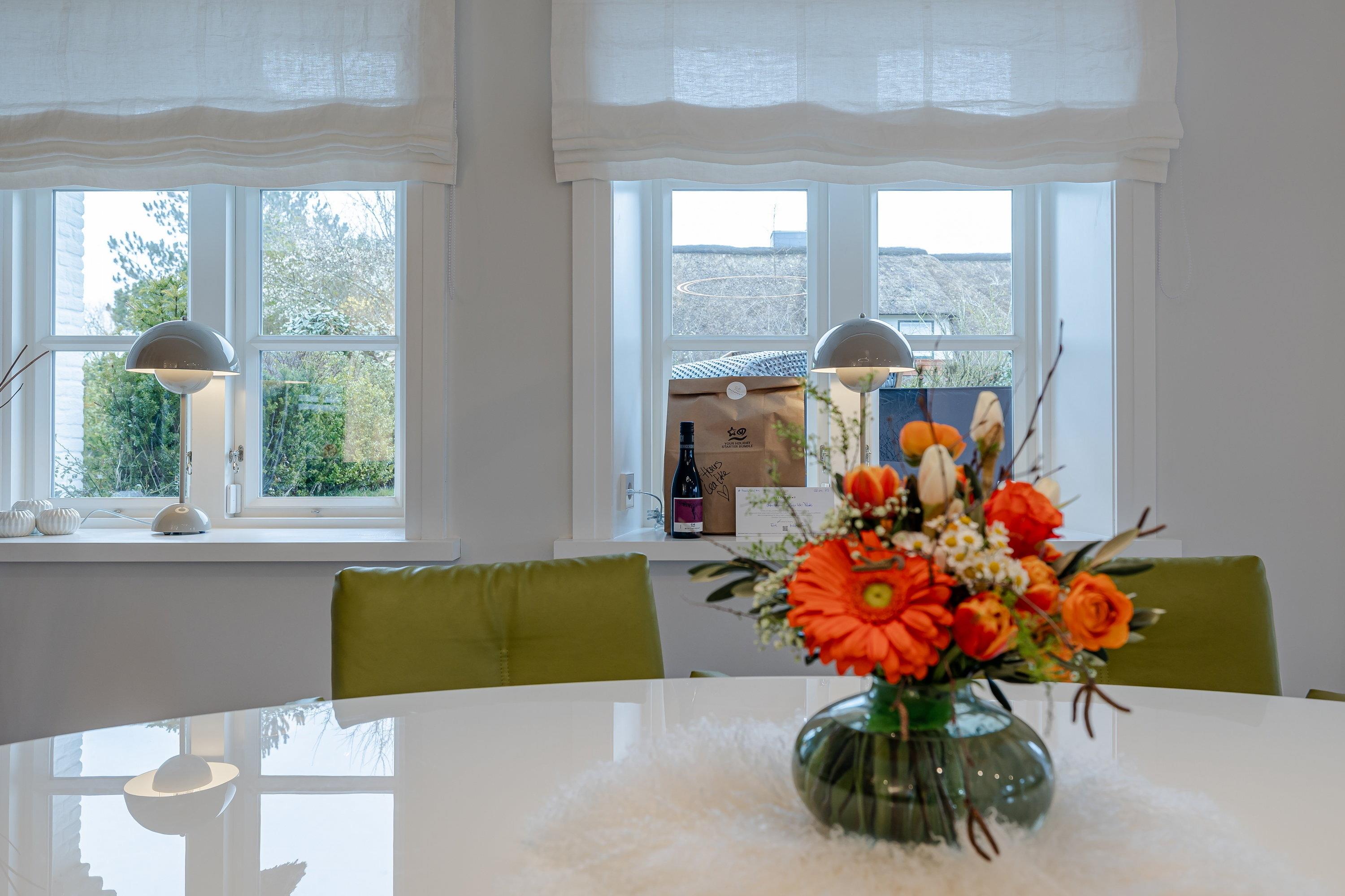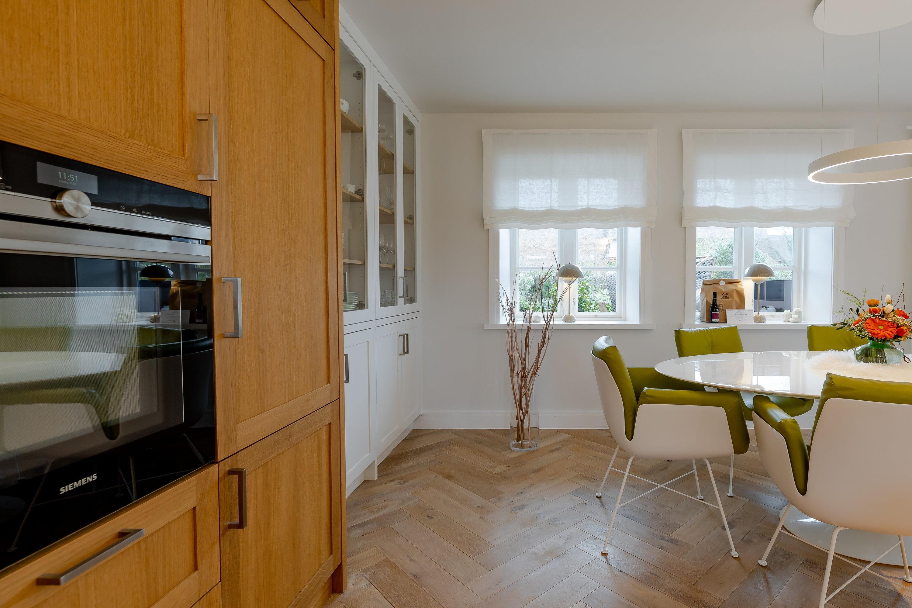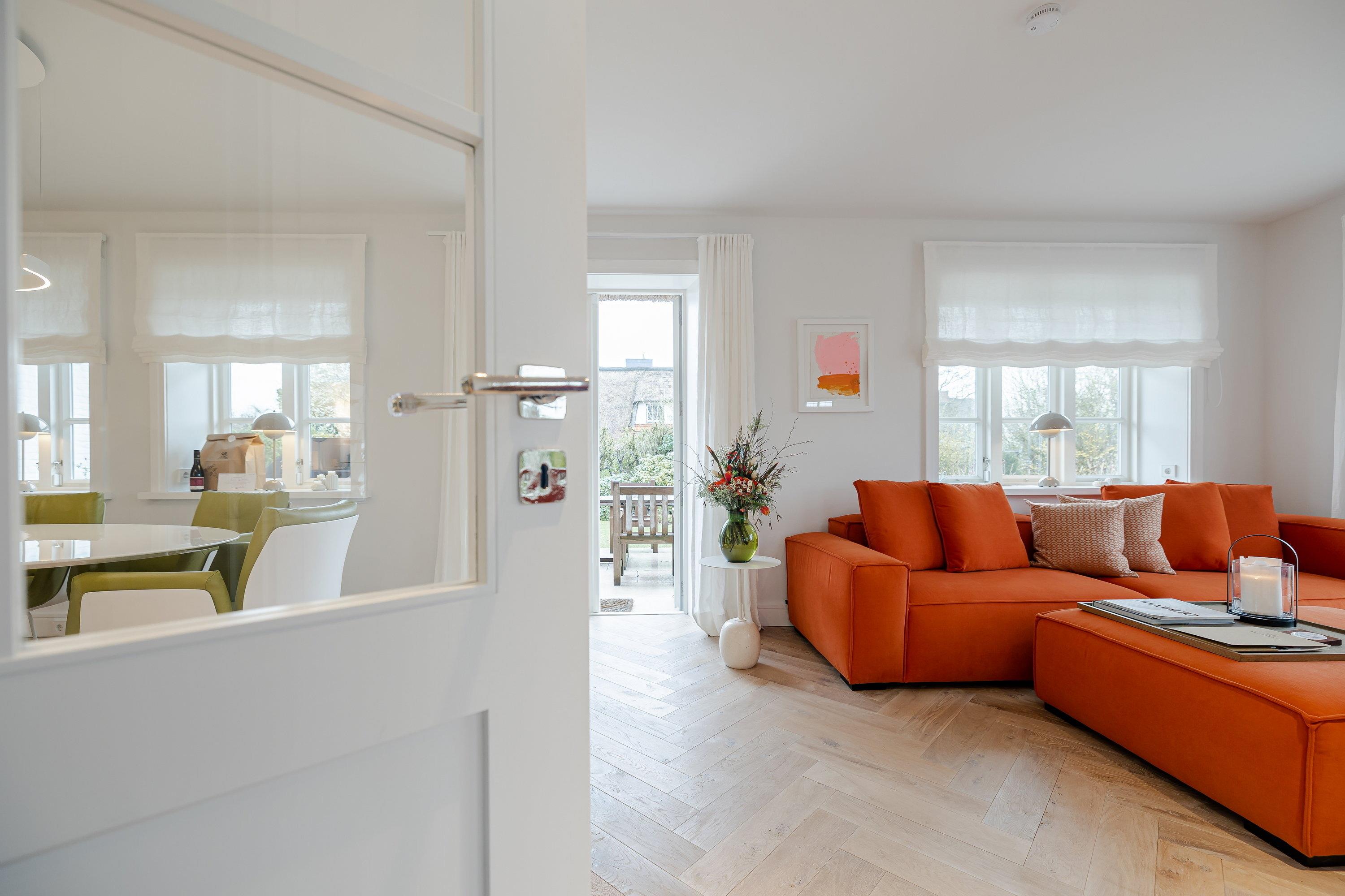 Sie werden beim Betreten des Ferienhauses von einem lichtdurchfluteten Eingangsbereich mit einer kleinen Garderobe begrüßt, von hier aus gelangen Sie geradeaus durch in den gemütlichen Ess- und Wohnbereich. Links entlang finden Sie die maßangefertigte Küche aus Eichenholz mit einer Nespresso Kaffeekapselmaschine und einem großzügigen Esstisch. Die rechte Seite lädt mit dem gemütlichen Sofa und dem Gas-Kamin zum Entspannen ein. Lesen Sie ein Buch oder schauen Sie Ihre Lieblingsserie auf dem Flachbildfernseher und erholen Sie sich. Von dem Wohn- und Essbereich gelangen Sie direkt in den großen Garten, in dem Sie ganztägig Sonne genießen können. Auf der Terrasse befindet sich ein Sitzbereich, auf dem Sie warme Sommerabende genießen können. Außerdem gibt es in dem Garten noch einen weiteren Sitzbereich, Sonnenliegen und einen Strandkorb, ideal für den ersten Kaffee am Morgen oder zum Entspannen. Zudem befindet sich im Garten ein Häuschen, in dem Sie Ihre Fahrräder abstellen können.