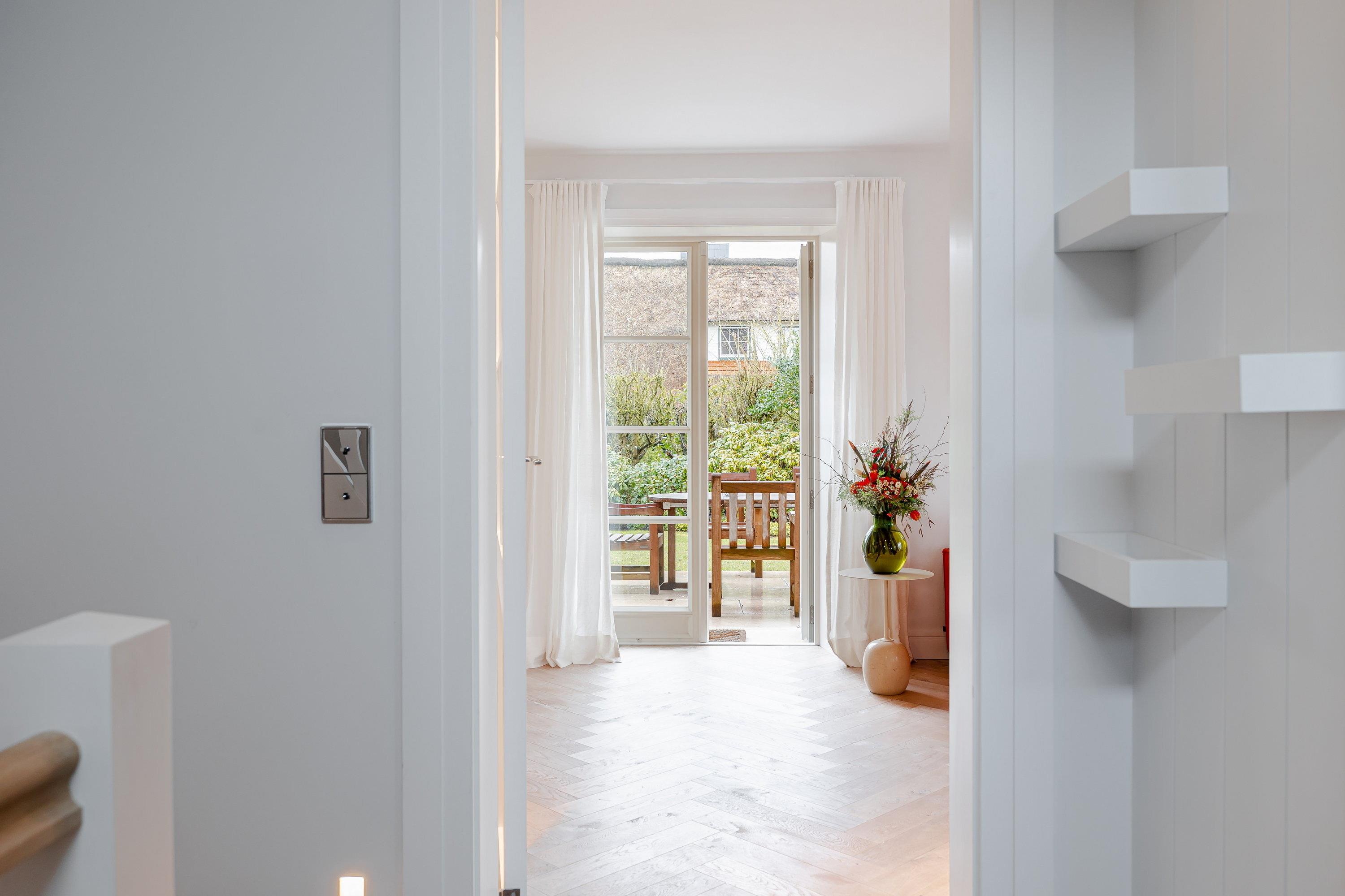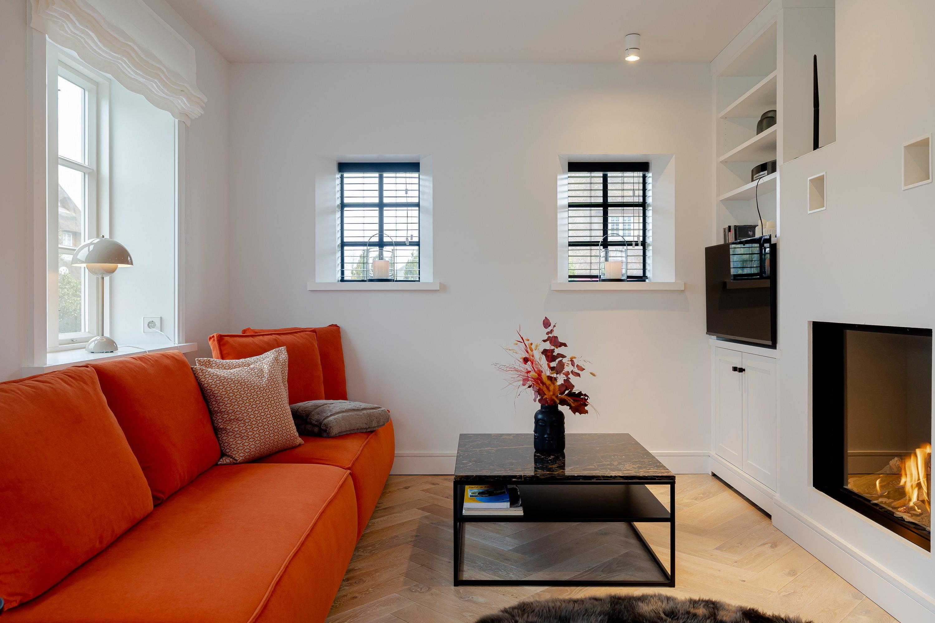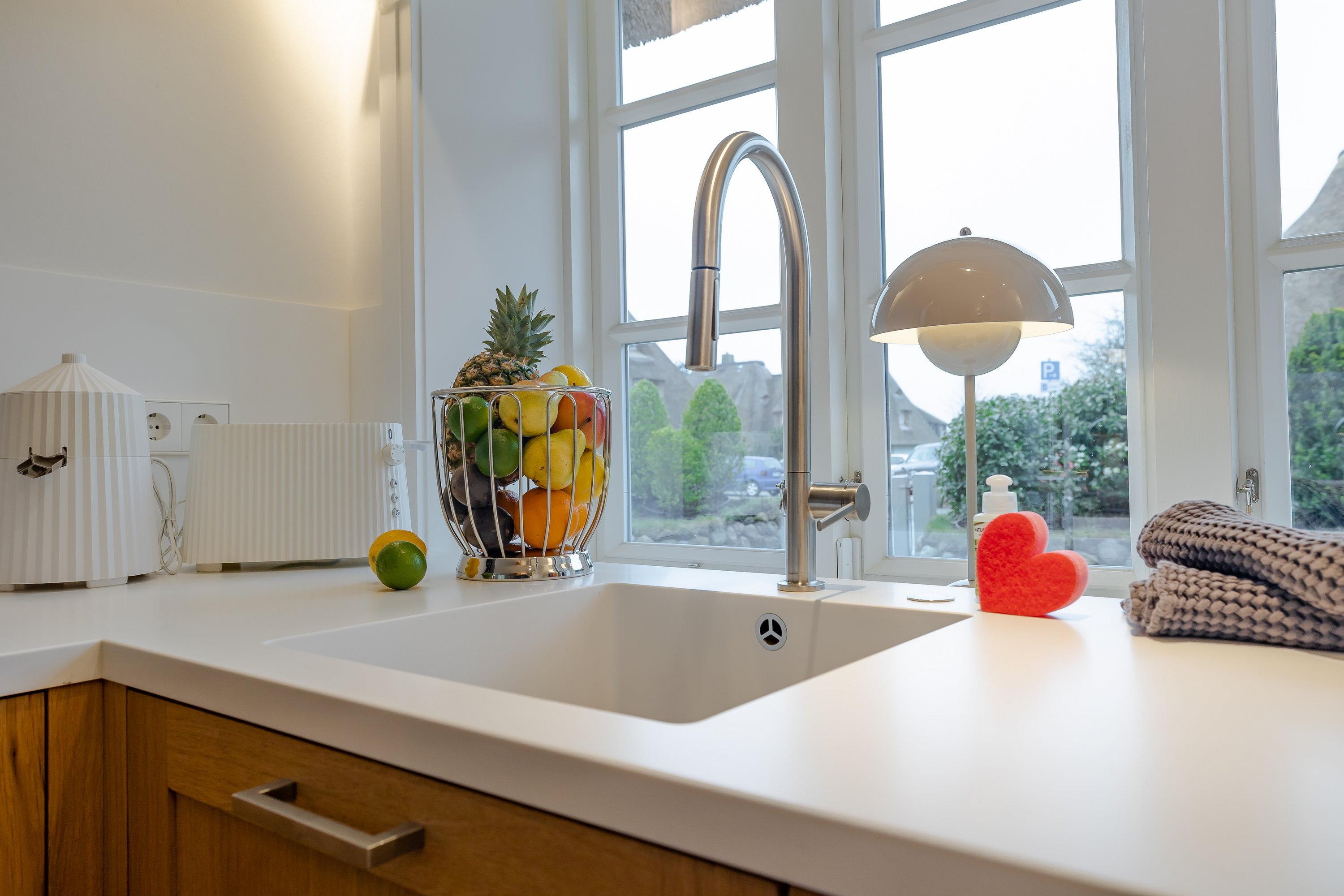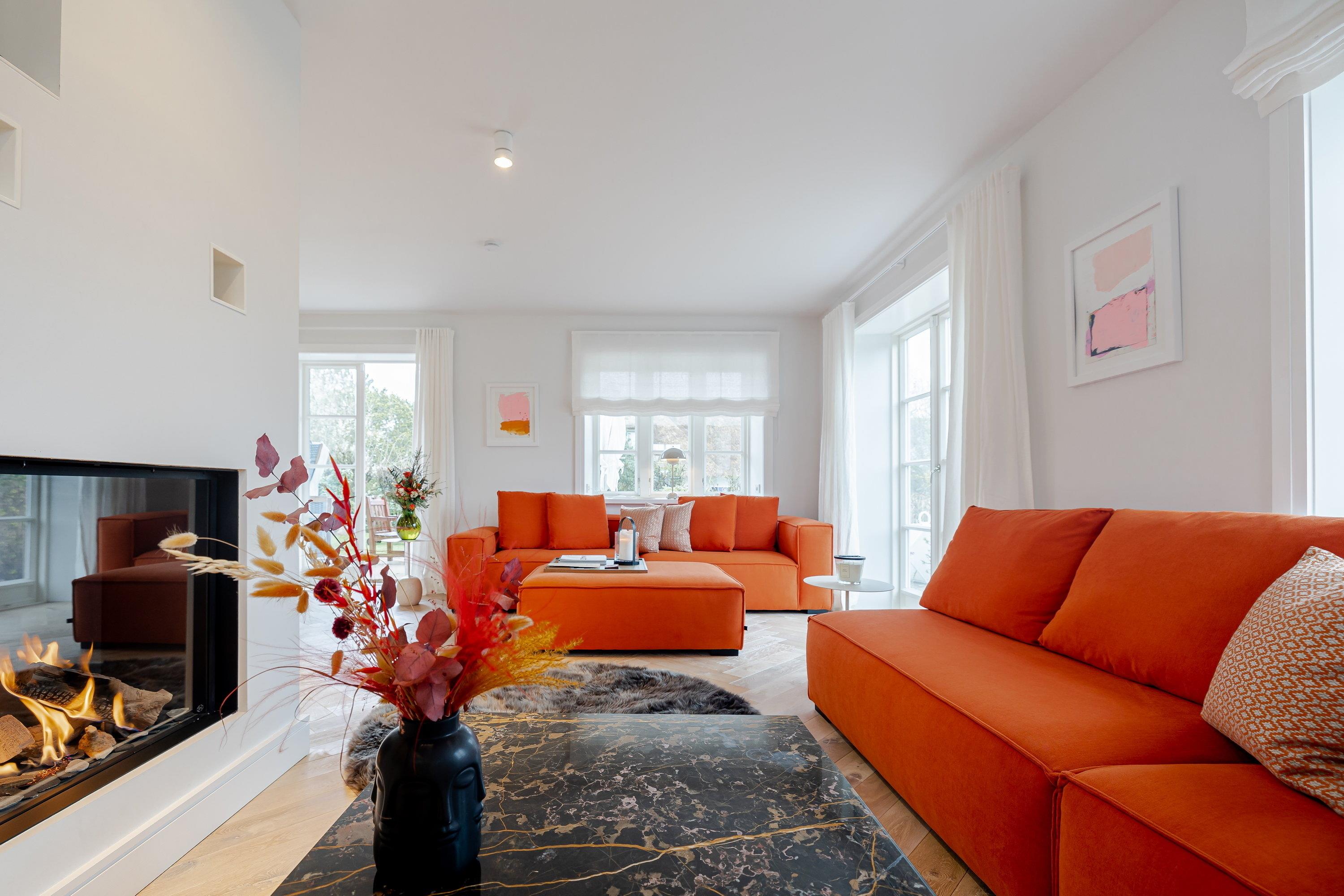 Sie werden beim Betreten des Ferienhauses von einem lichtdurchfluteten Eingangsbereich mit einer kleinen Garderobe begrüßt, von hier aus gelangen Sie geradeaus durch in den gemütlichen Ess- und Wohnbereich. Links entlang finden Sie die maßangefertigte Küche aus Eichenholz mit einer Nespresso Kaffeekapselmaschine und einem großzügigen Esstisch. Die rechte Seite lädt mit dem gemütlichen Sofa und dem Gas-Kamin zum Entspannen ein. Lesen Sie ein Buch oder schauen Sie Ihre Lieblingsserie auf dem Flachbildfernseher und erholen Sie sich. Von dem Wohn- und Essbereich gelangen Sie direkt in den großen Garten, in dem Sie ganztägig Sonne genießen können. Auf der Terrasse befindet sich ein Sitzbereich, auf dem Sie warme Sommerabende genießen können. Außerdem gibt es in dem Garten noch einen weiteren Sitzbereich, Sonnenliegen und einen Strandkorb, ideal für den ersten Kaffee am Morgen oder zum Entspannen. Zudem befindet sich im Garten ein Häuschen, in dem Sie Ihre Fahrräder abstellen können.