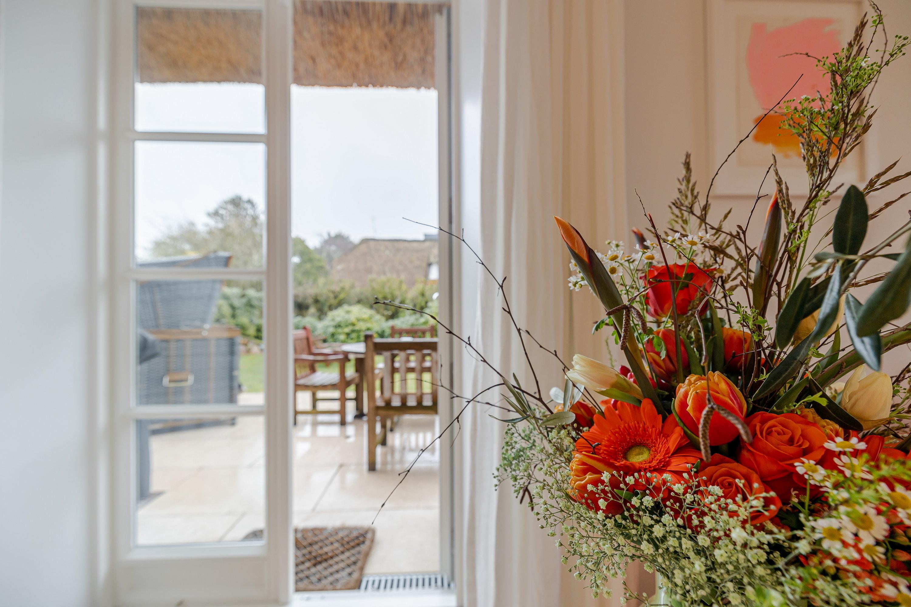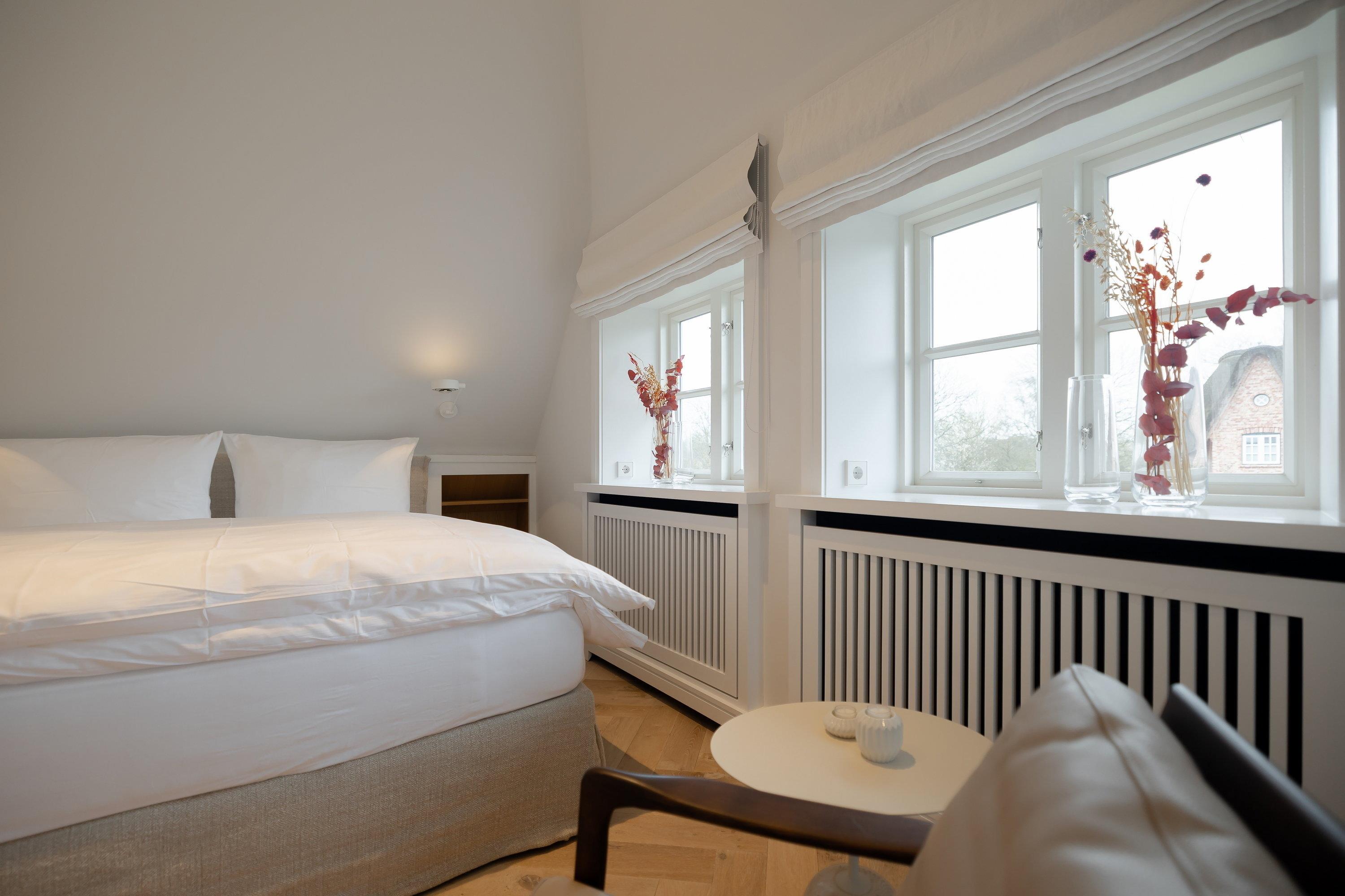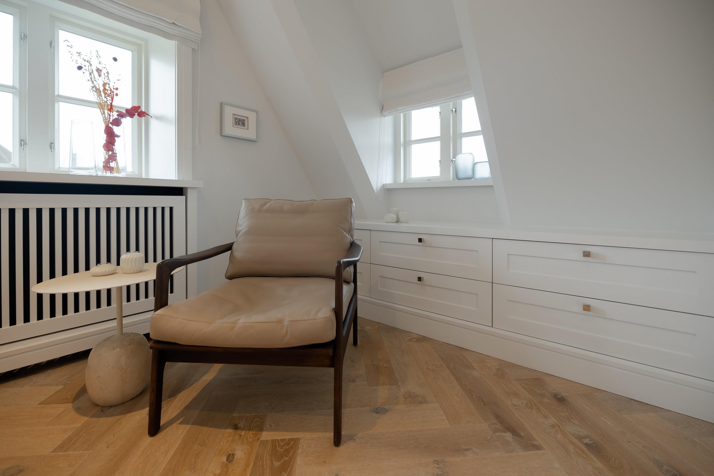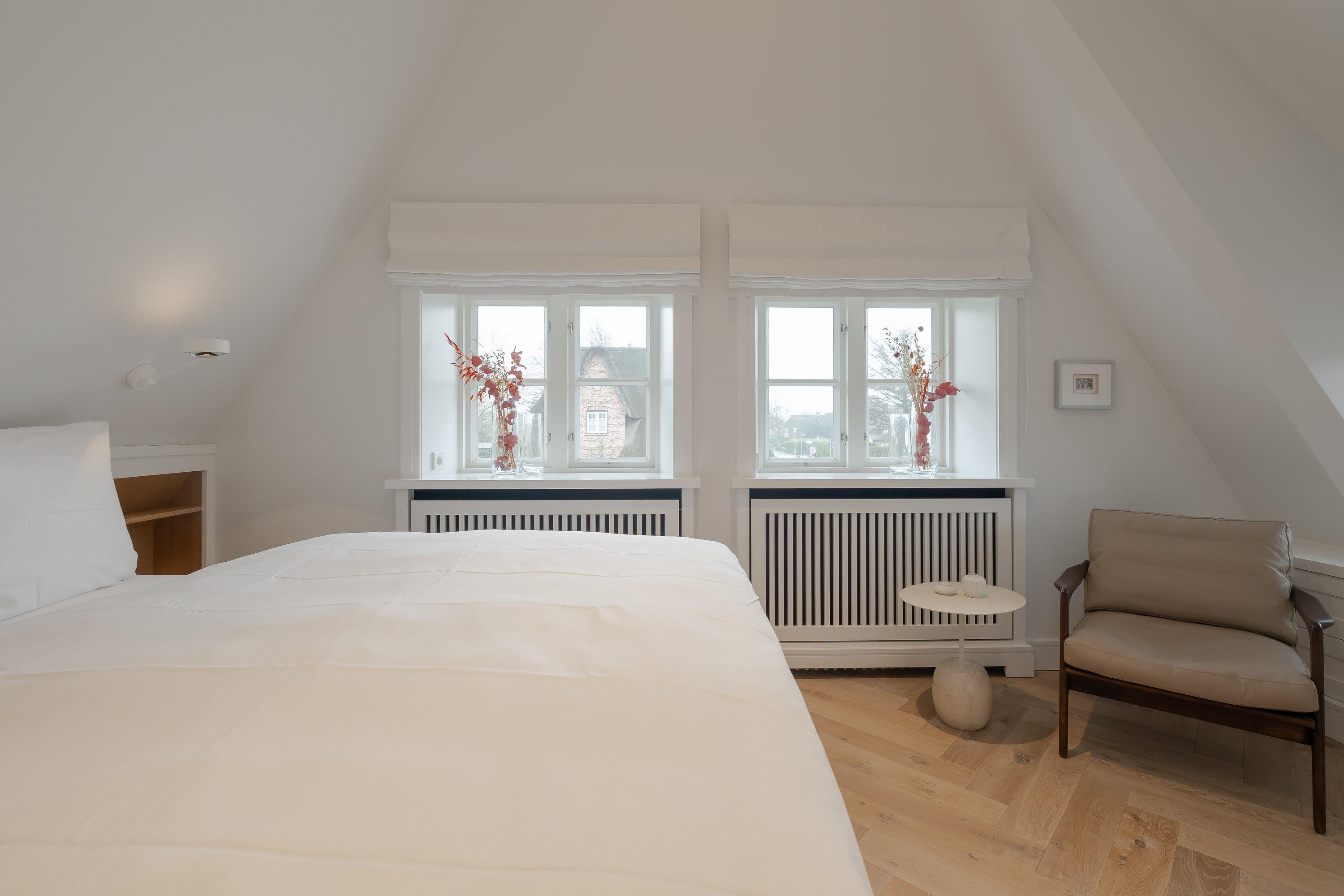 Auf der oberen Etage erwartet Sie im Flur direkt am Fenster eine Arbeitsecke mit Blick auf das Örtchen Keitum sowie ein Schlafzimmer und ein Gästezimmer. Rechts befindet sich ein großes Schlafzimmer mit einem 160 cm x 200 cm großem Doppelbett, mit einem schönen Blick auf den Garten und Rollos zum Abdunkeln. Im Bad erwarten Sie große graue Fliesen kombiniert mit Schränken aus Eichenholz und einer großen ebenerdigen Regendusche, welche Sie fühlen lassen, wie im Spa. In dem Gästezimmer finden Sie ein gemütliches 160 cm x 200 cm großes Schlafsofa von Schramm sowie eine kleine TV - und Leseecke mit Blick in den Garten und die reetgedeckten Nachbarhäuser.