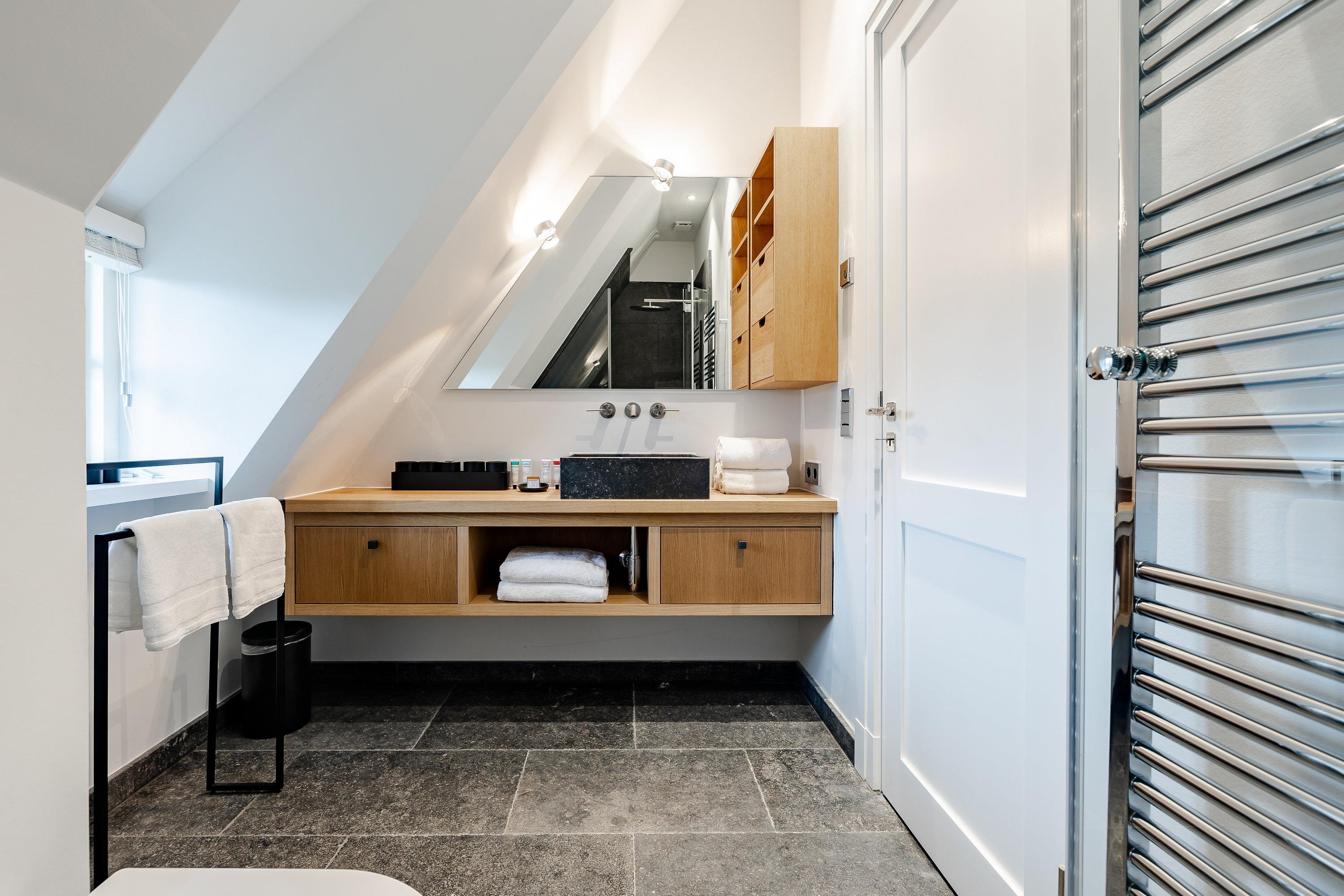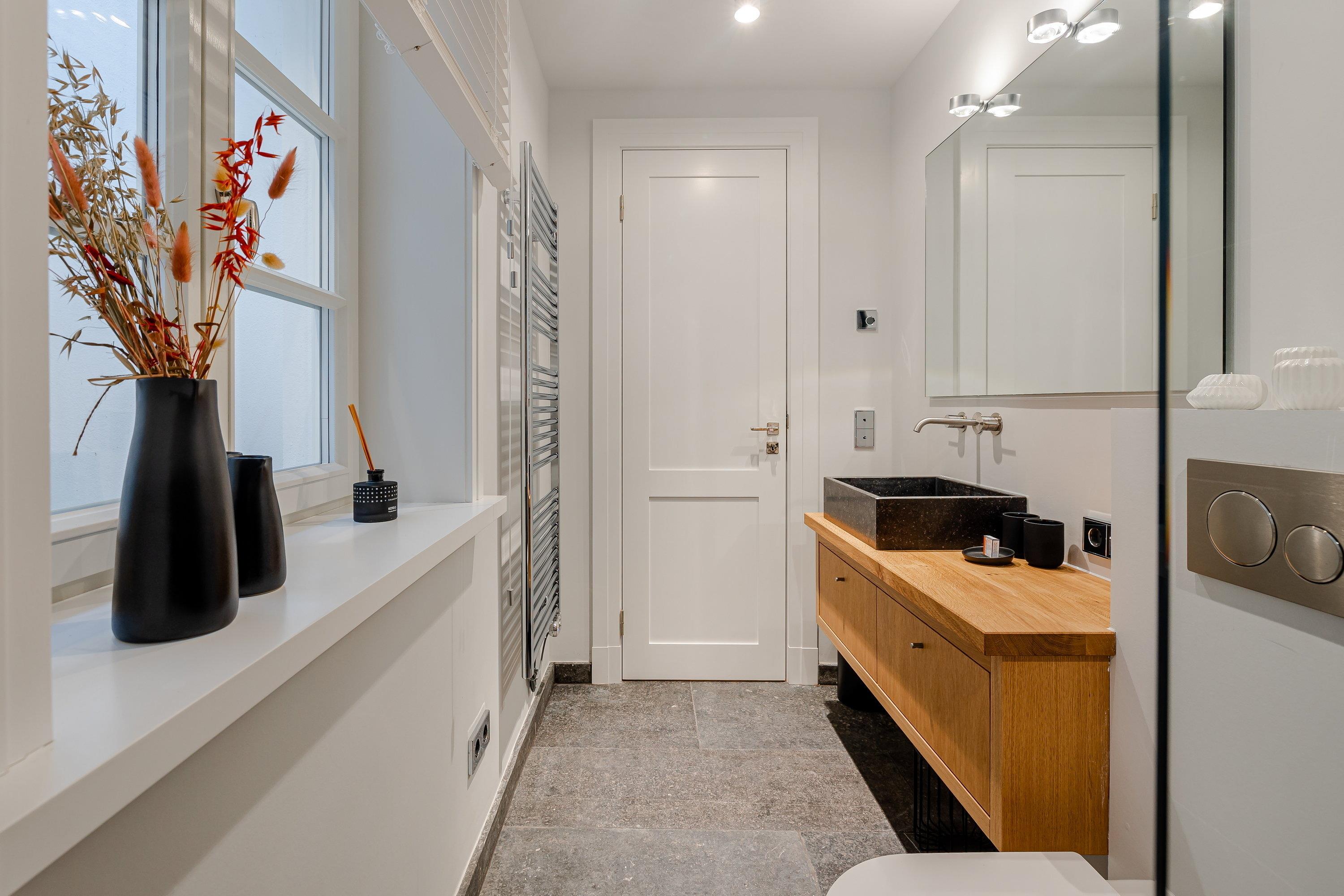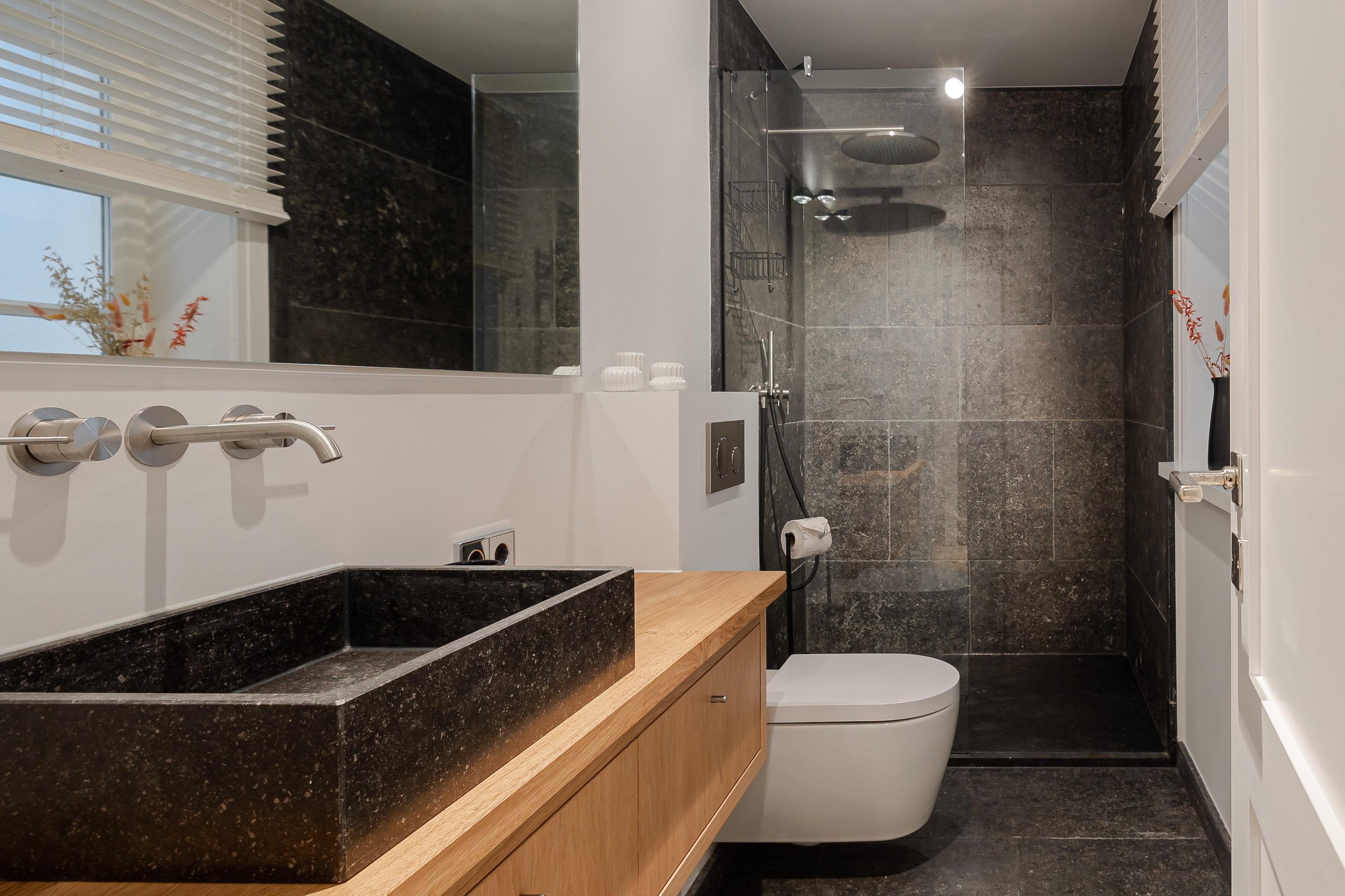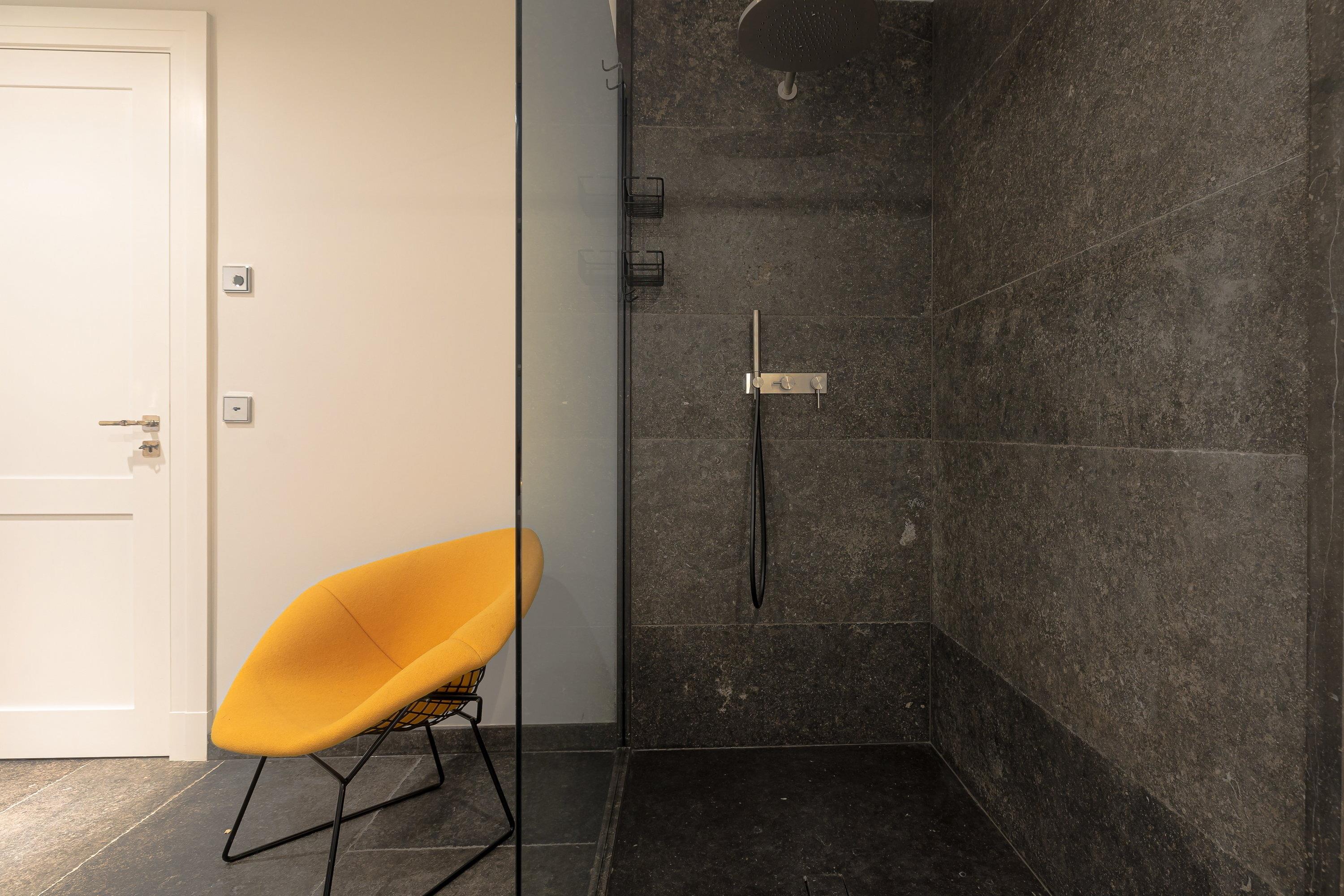 Im Untergeschoss erwartet Sie neben einem weiteren Schlafzimmer mit einem 180 cm x 200 cm großem Doppelbett und einem gemütlichen Bad, wie im Obergeschoss, eine wahre Wohlfühloase. Denn hier befindet sich ein kleiner Sauna- und Fitnessbereich mit einer weiteren ebenerdigen Dusche, einem Ergometer Fahrrad und einer Yogamatte, ideal für kalte Tage, in der Sie ihre Seele baumeln lassen können. Das angrenzende Bad verfügt ebenfalls über eine bodentiefe Dusche und große graue Fliesen. Im gesamten Untergeschoss gibt es bodentiefe Fenster, welche eine helle und gemütliche Atmosphäre bereiten. Das Schlafzimmer verfügt über Stores sowie einen Fernseher. Außerdem befindet sich hier ein Haushaltsraum mit einer Waschmaschine, einem Trockner von Miele und einem Dyson-Staubsauger.