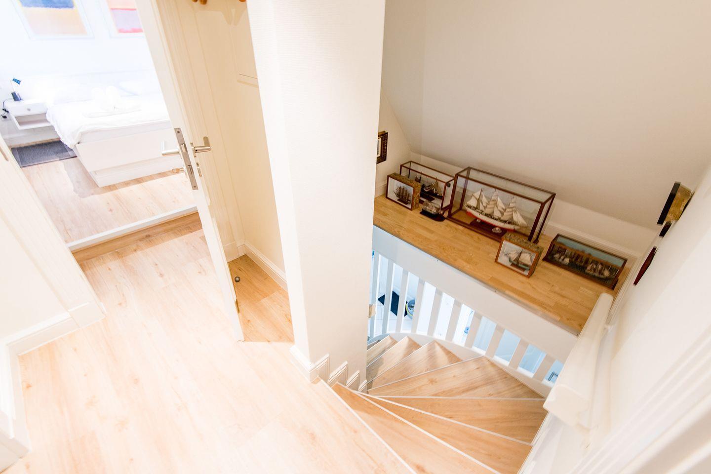 Das stilvolle Badezimmer ist mit einer Dusche, WC und einem Handtuchwärmer ausgestattet und bietet mit seinem Tageslicht eine angenehme Atmosphäre. Hier starten Sie erfrischt in den Tag oder können nach einem erlebnisreichen Tag auf der Insel entspannen.