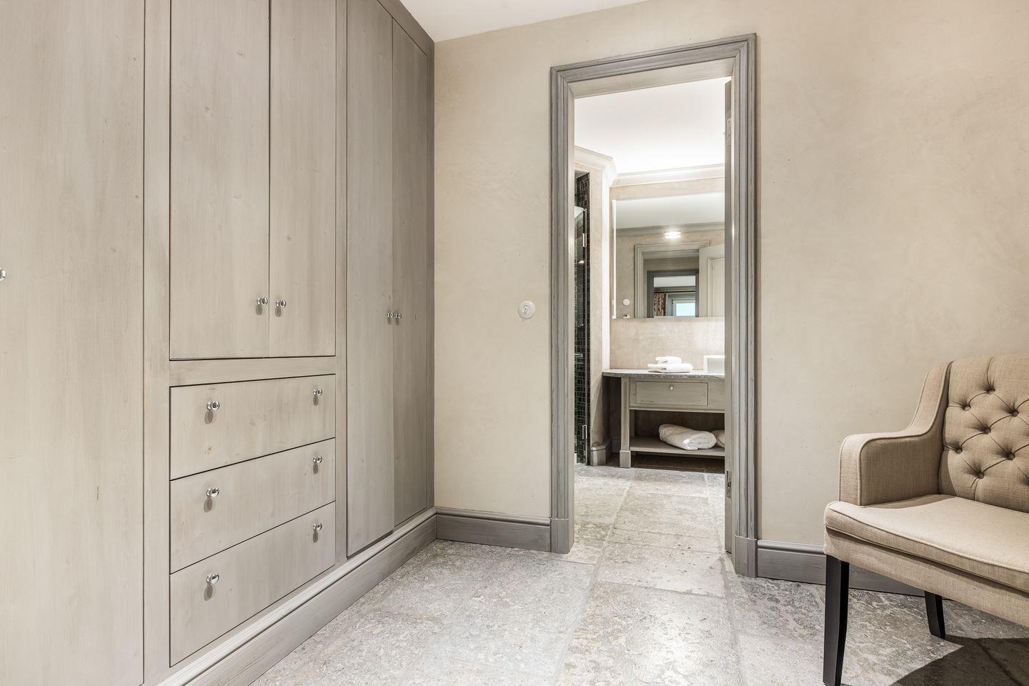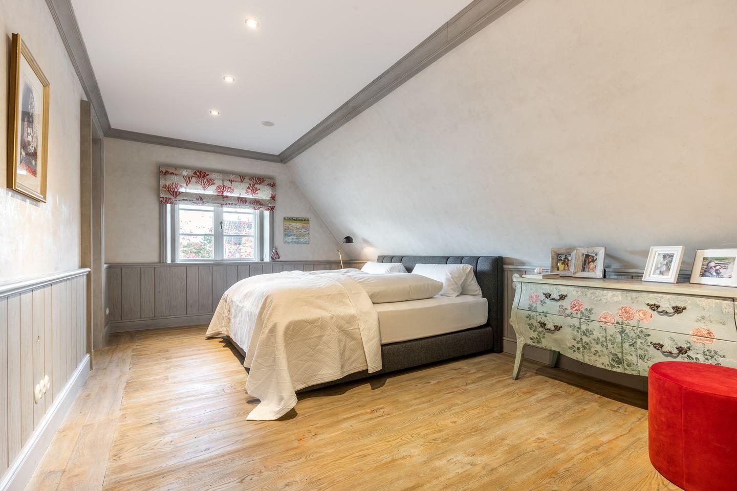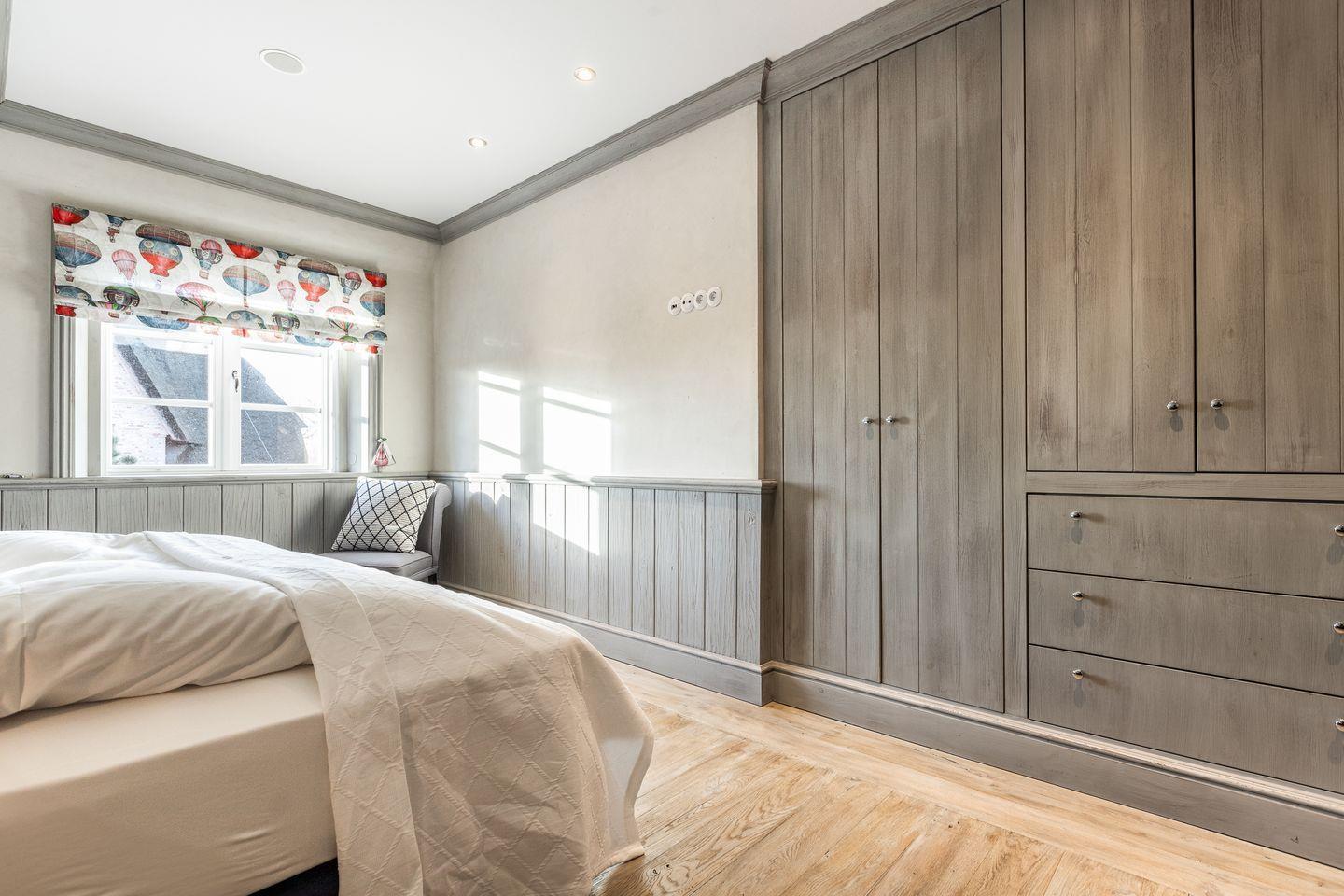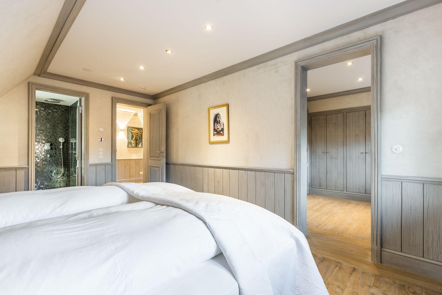 Die fünf Schlafzimmer bieten höchsten Komfort und stilvolle Details. Zwei Schlafzimmer sind mit Boxspringbetten (180x200 cm) und Kommoden ausgestattet. Zwei weitere Schlafzimmer verfügen über großzügige Boxspringbetten (200x200 cm) und begehbare Kleiderschränke sowie ein eigenes en suite Badezimmer. Ein fünftes Schlafzimmer mit Boxspringbett (180x200 cm) und einem Reiseschrank bietet zusätzlichen Schlafraum.