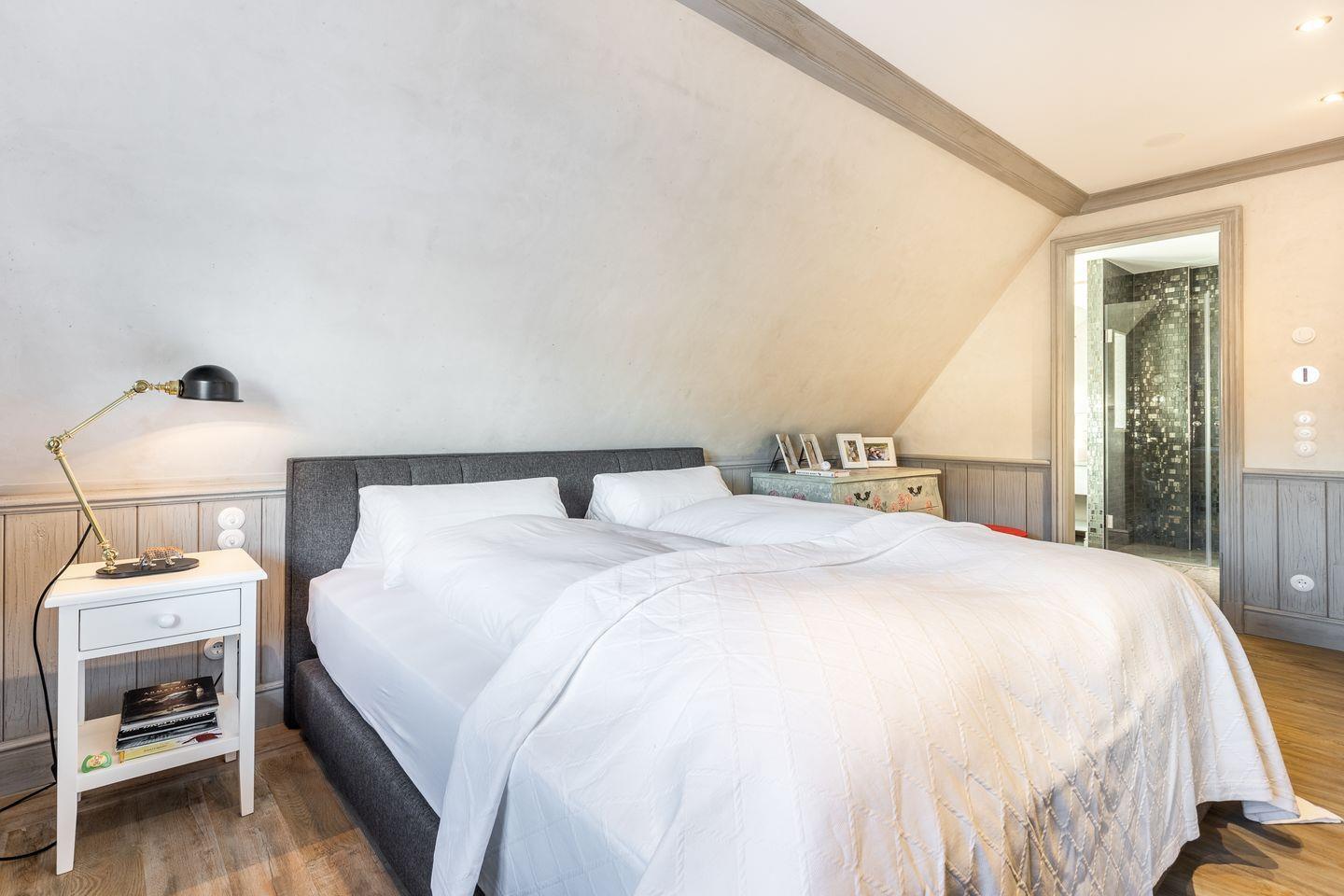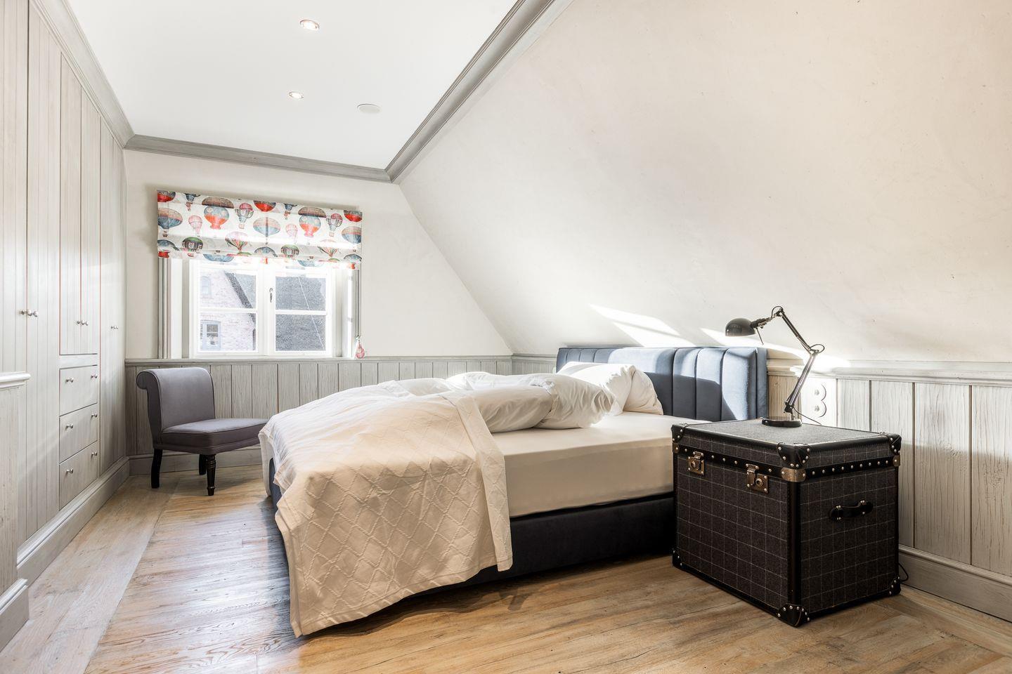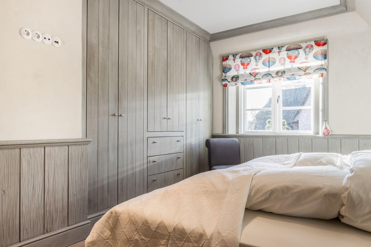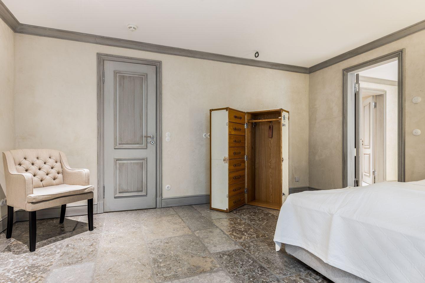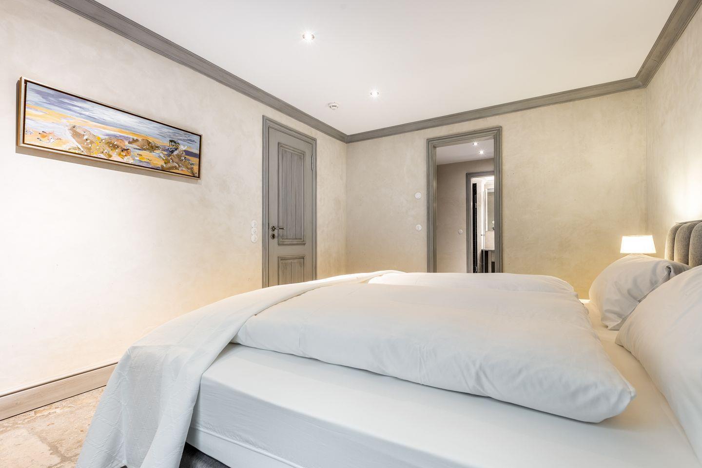 Die fünf Schlafzimmer bieten höchsten Komfort und stilvolle Details. Zwei Schlafzimmer sind mit Boxspringbetten (180x200 cm) und Kommoden ausgestattet. Zwei weitere Schlafzimmer verfügen über großzügige Boxspringbetten (200x200 cm) und begehbare Kleiderschränke sowie ein eigenes en suite Badezimmer. Ein fünftes Schlafzimmer mit Boxspringbett (180x200 cm) und einem Reiseschrank bietet zusätzlichen Schlafraum.