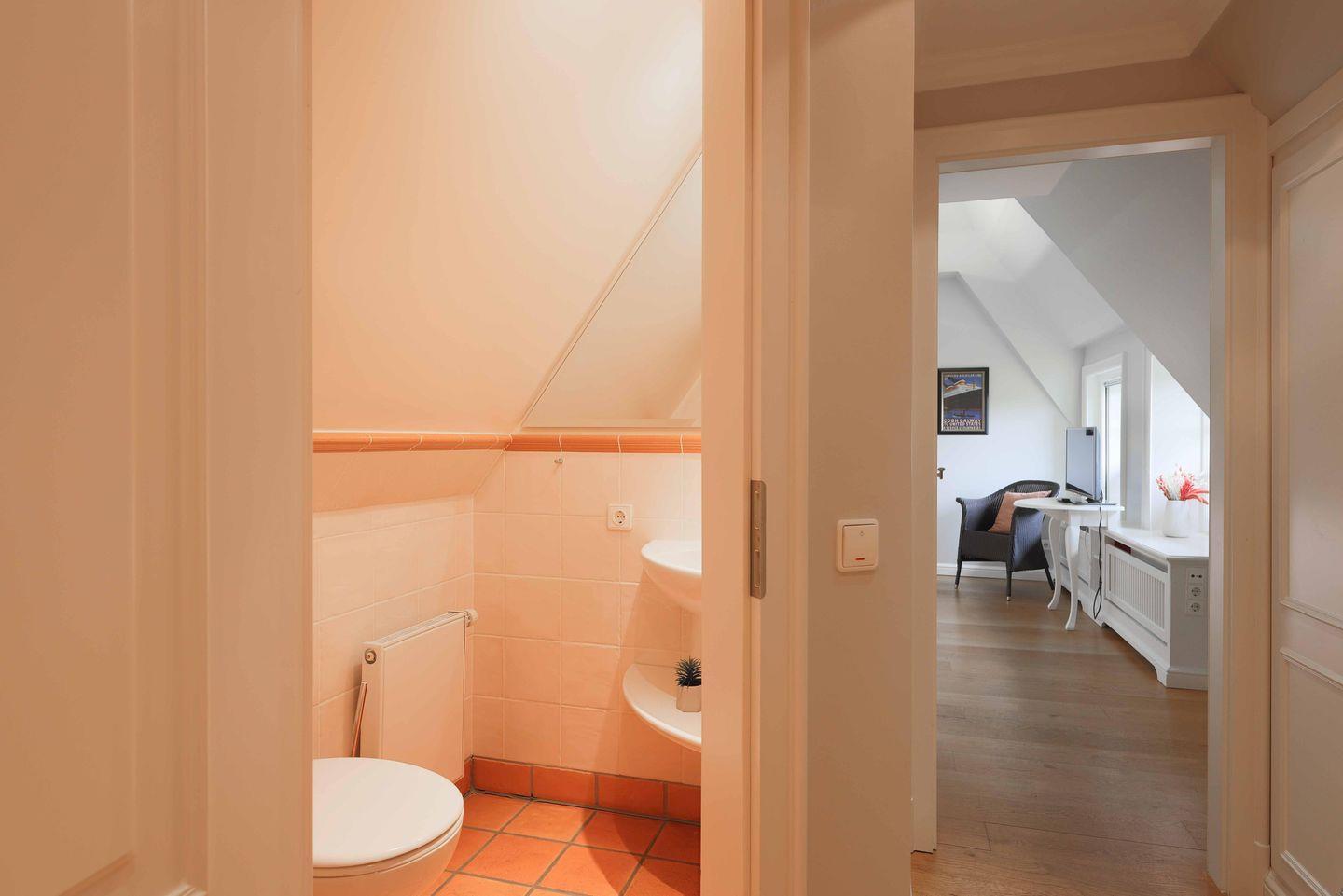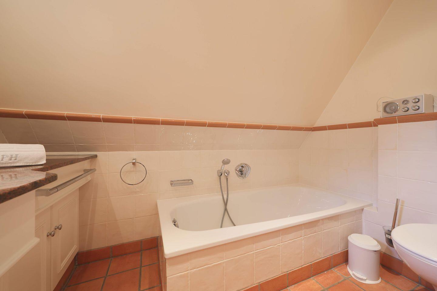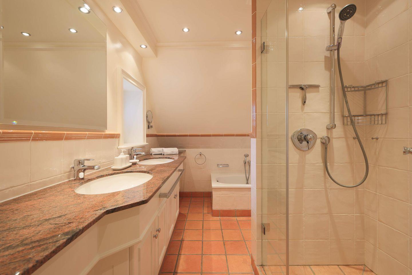 Die Badezimmer befinden sich auf denselben Ebenen wie die Schlafzimmer und sind mit Handtüchern und Bademänteln bestückt. Das untere Bad verfügt über eine bodengleiche Dusche und ein großes Waschbecken mit Ablagefläche. Ein Handtuchwärmer gehört ebenso zur umfassenden Ausstattung wie ein ansprechendes, modernes und helles Fliesendesign. Dieses findet sich auch im oberen Badezimmer wieder, welches mit Badewanne und Doppelwaschtisch keine Wünsche offen lässt. Ein Kosmetikspiegel und ein Fenster runden die Ausstattung hier ab.