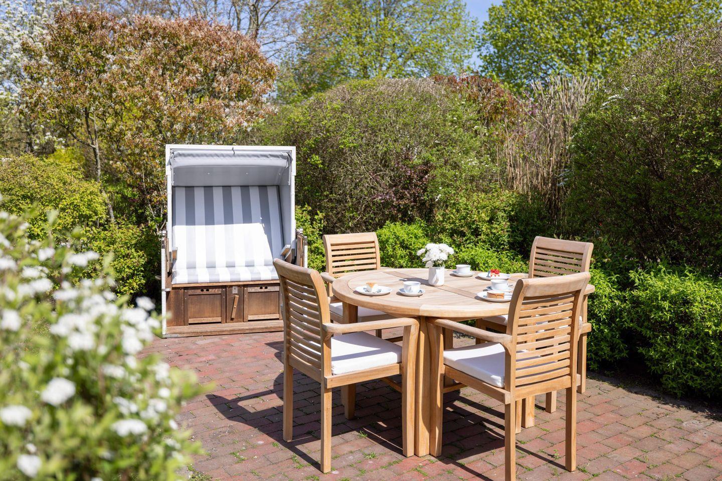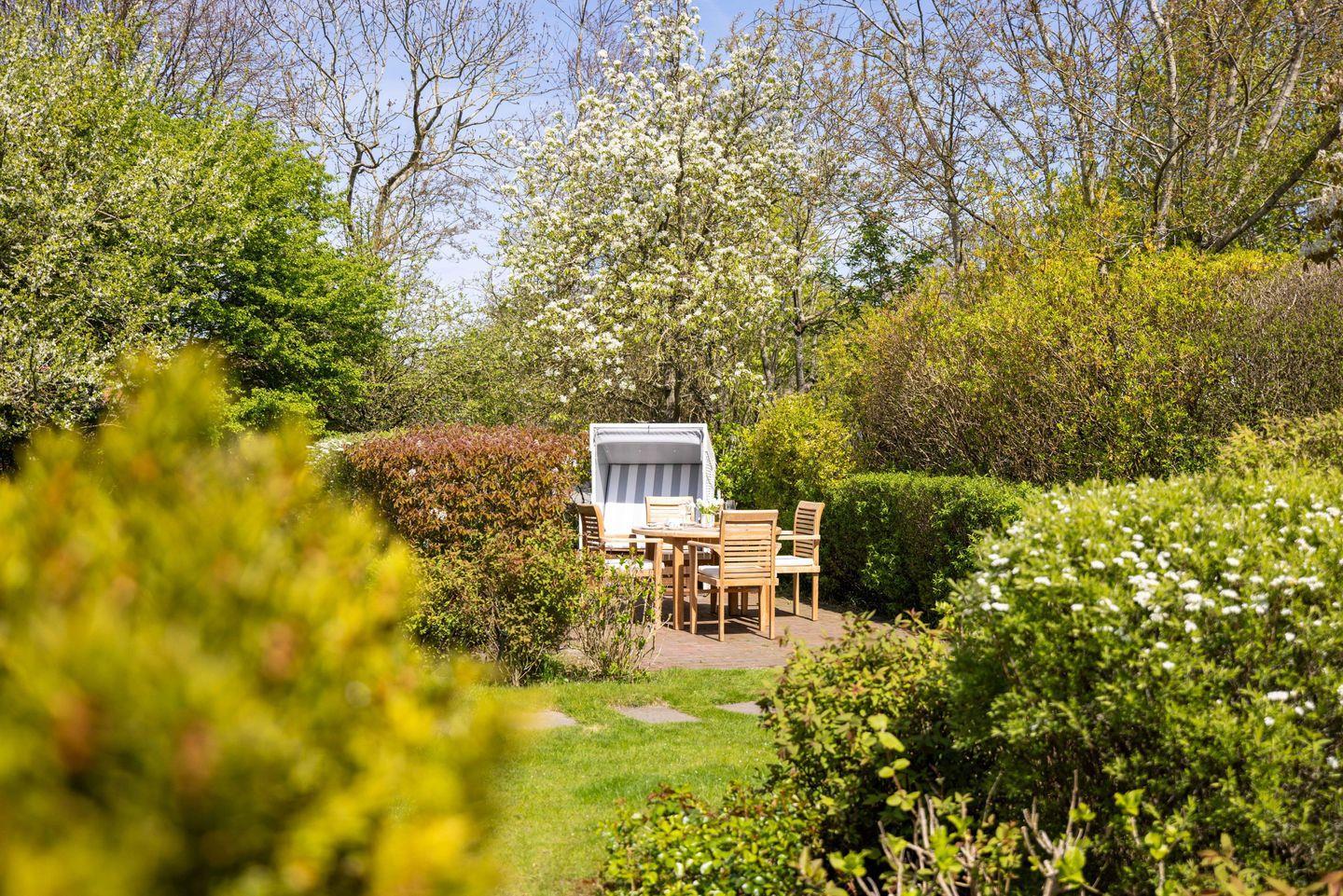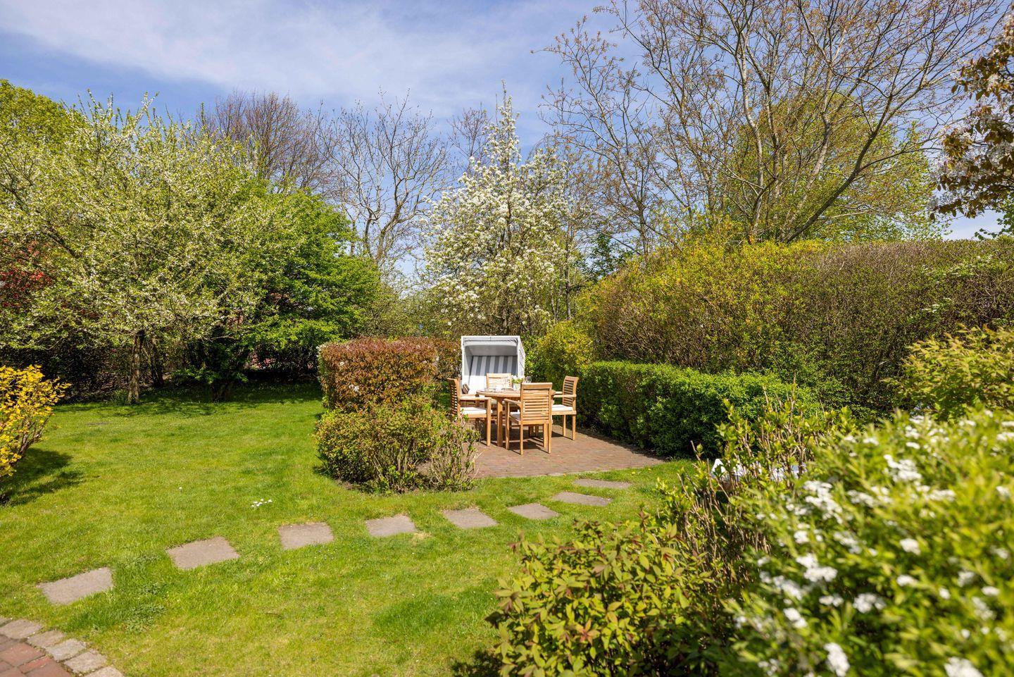 Das Ferienhaus gehört zu einem Komplex mit zwei weiteren Hausteilen, alle unter Reet. Im eigenen sonnigen, geschützten Gartenanteil stehen neben einem Strandkorb auch ein Tisch mit Stühlen und Sonnenschirm zur Verfügung. Zwei Liegen laden zusätzlich zu entspannten Stunden im Garten ein.