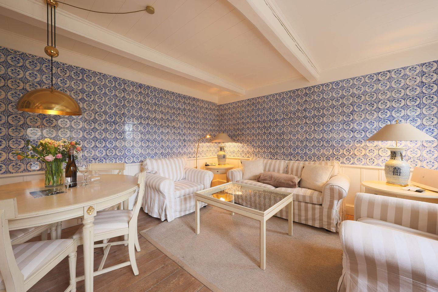 Das Wohnzimmer mit hochwertigen Tischlereinbauten, einer gemütlichen Sitzgruppe und einer Essecke besticht zusätzlich mit seinen alten, historischen Fliesen, welche die besondere Atmosphäre des Raumes ausmachen. Ein Smart-TV mit Bluray-Player und eine Dockingstation für iPod, iPhone oder iPad sorgen für modernen Komfort und zusätzliche Annehmlichkeit.