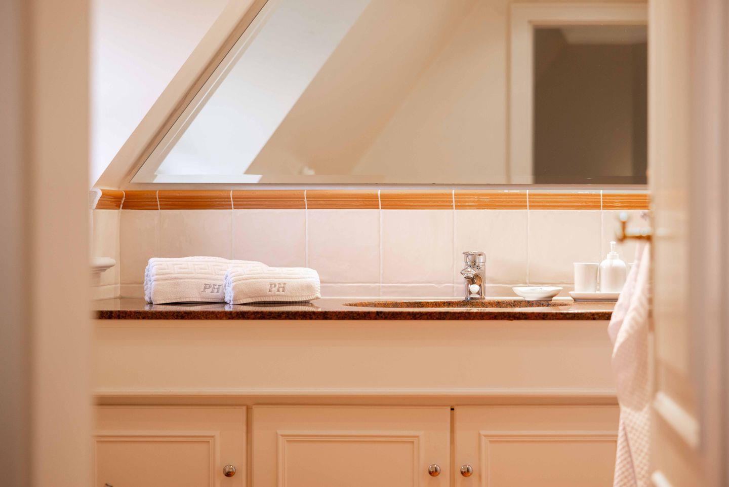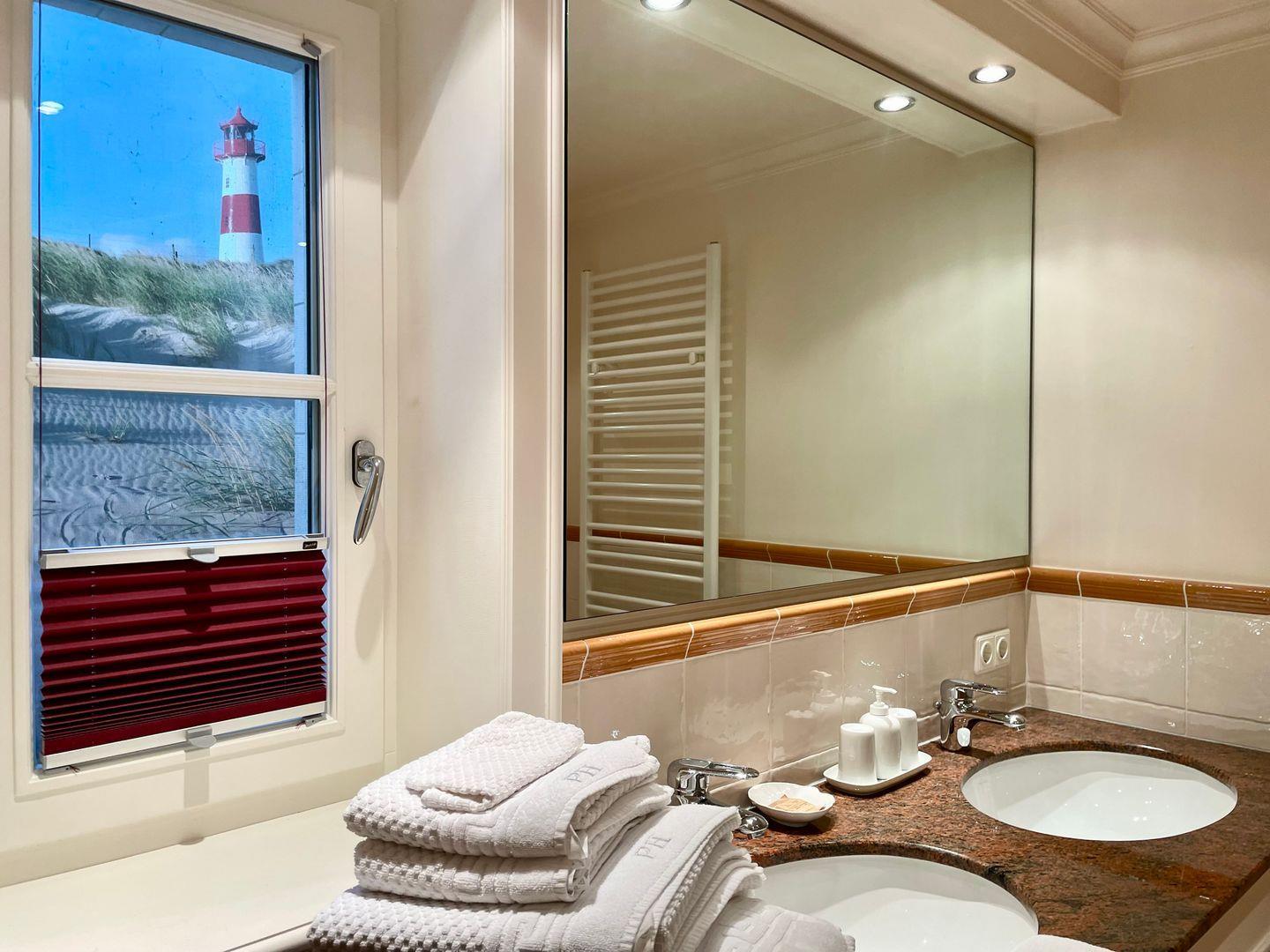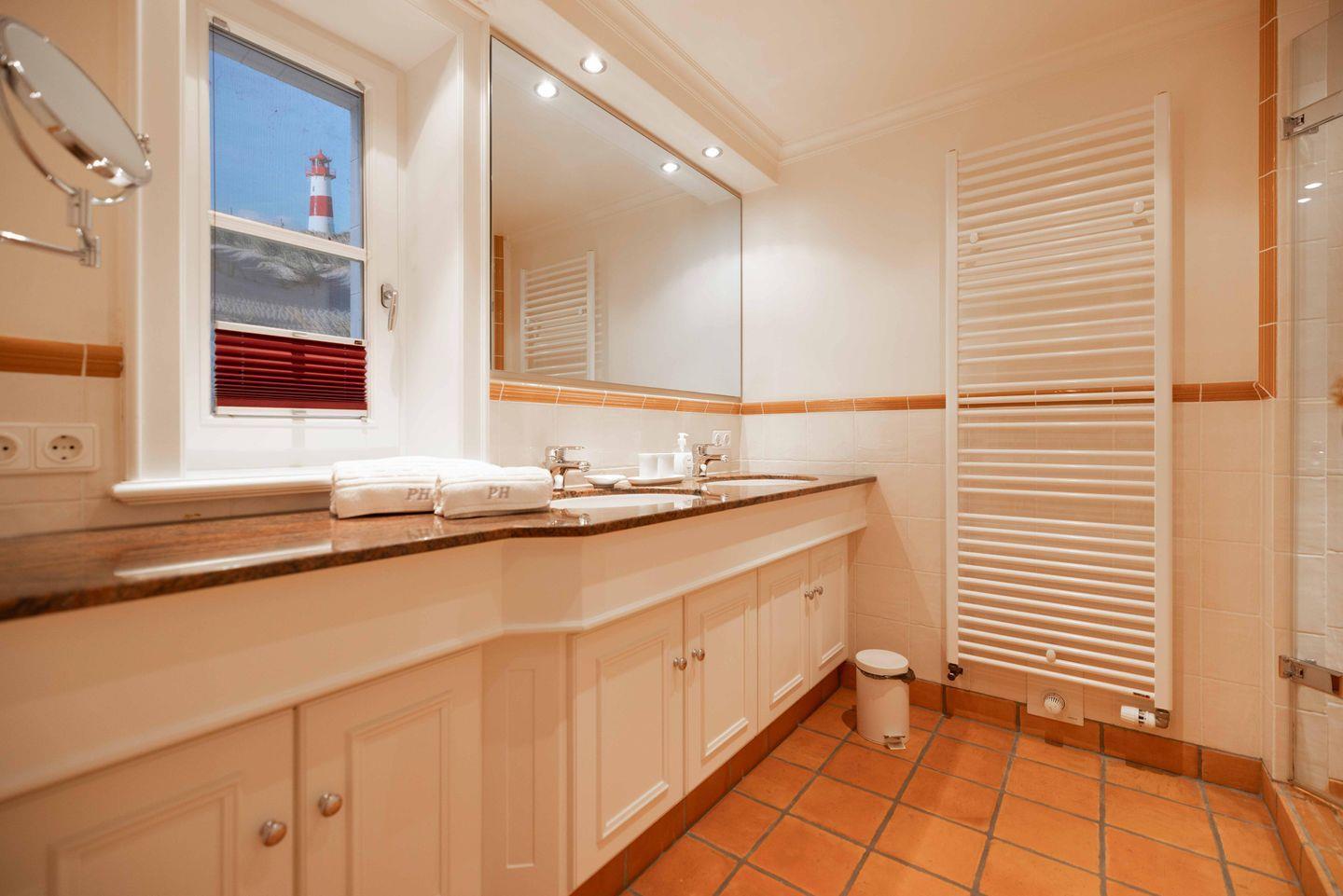 Zu jedem Schlafzimmer gehört ein Bad. Im unteren Badezimmer mit Dusche und Doppelwaschtisch gehören Handtücher ebenso zur Ausstattung wie ein Handtuchwärmer für diese. Eine Fußbodenheizung sorgt für besonderen Komfort.