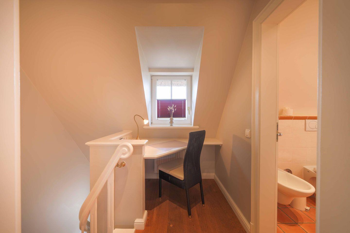 Auf der Empore des oberen Geschosses befindet sich ein kleiner Arbeitsbereich. Außerdem gehört ein Waschraum zur Unterkunft. Hier finden sich neben einem Waschtrockner auch Bügelbrett und -eisen sowie weitere Haushaltsgegenstände, welche genutzt werden können. Feuermelder sorgen für zusätzliche Sicherheit.