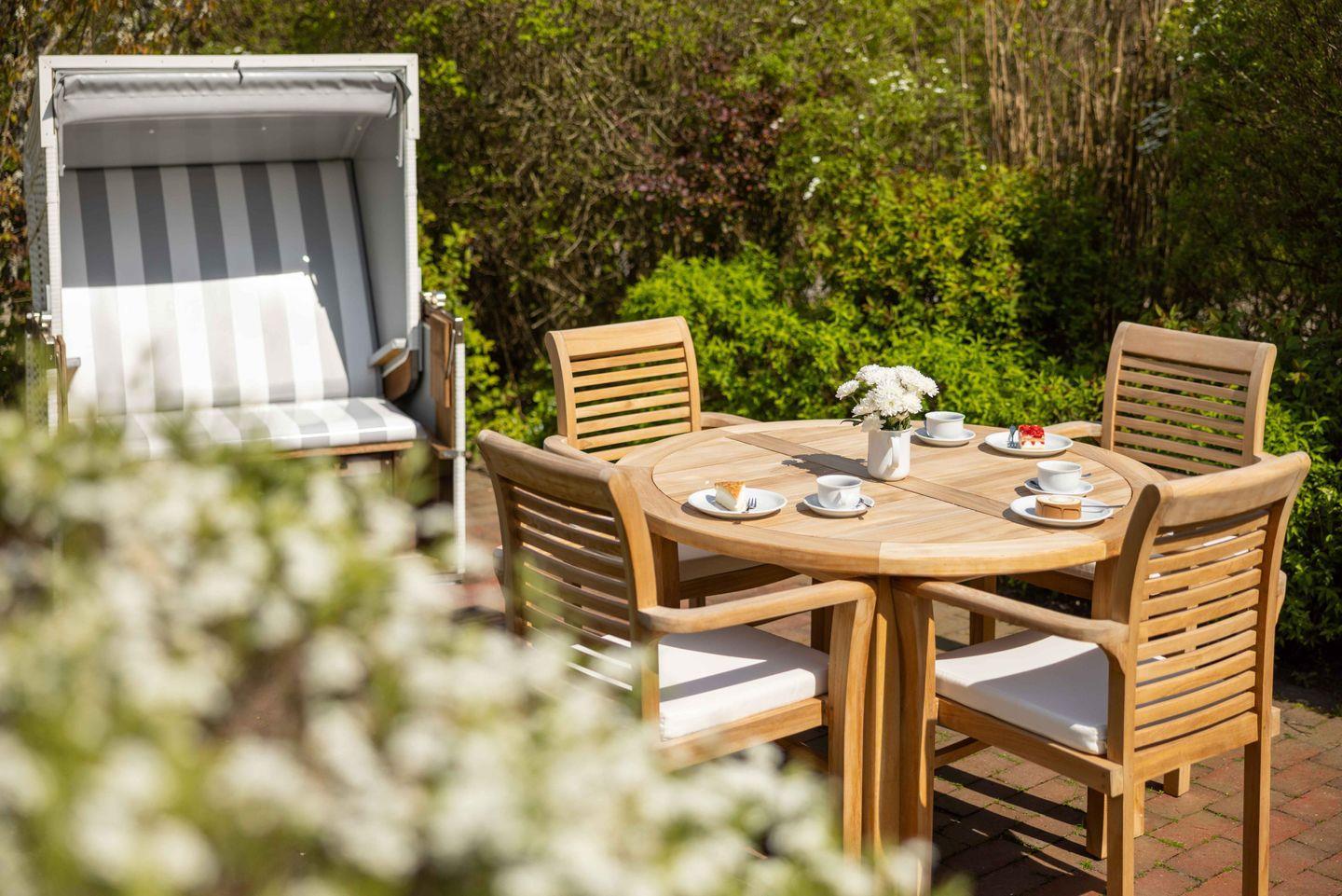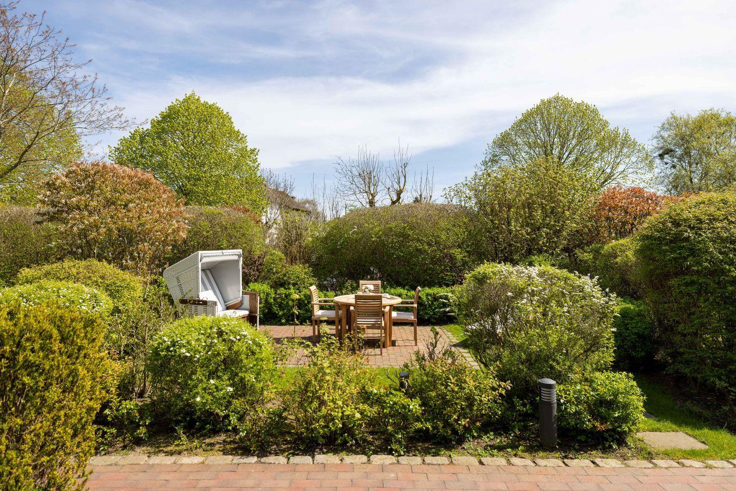 Der eigene Gartenanteil des Ferienhauses ist sonnig und geschützt angelegt, sodass Sie in Ihrem eigenen Strandkorb den Tag genießen können. Überdies bietet der Garten eine Sitzgruppe, welche auf der von Grün umgebenen Terrasse liegt. Ein Sonnenschirm sorgt für Schatten an warmen Tagen.