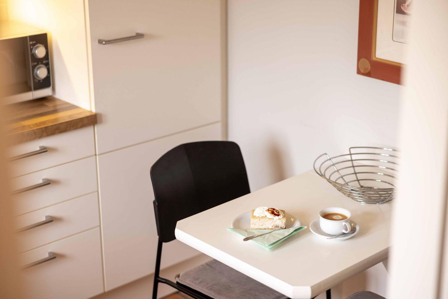 Die Küche lässt mit Geschirrspüler, Herd, Backofen, einem großen Kühlschrank und zahlreichen weiteren Annehmlichkeiten wie einer Mikrowelle und einem Mixer keine Wünsche offen. Geschirr und Geschirrhandtücher sind ebenso vorhanden wie die Wahl zwischen einer Kapsel- und einer Filterkaffeemaschine. Zum Frühstücken lädt eine kleine Essecke in der Küche ein. Helle Küchenfronten und Fliesen unterstreichen die Modernität des Raumes.