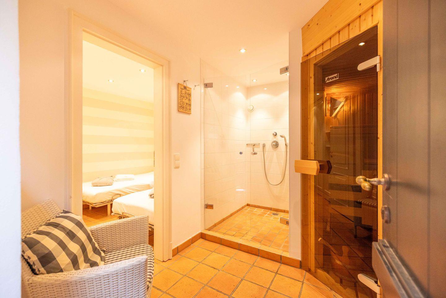 Direkt auf dem Grundstück gelegen befindet sich eine Holzsauna mit eigenem Ruheraum und Dusche. Diese kann von allen Gästen der drei Wohneinheiten des Reet-Komplexes genutzt werden und sorgt für besondere Wellnessmomente während des Aufenthalts.