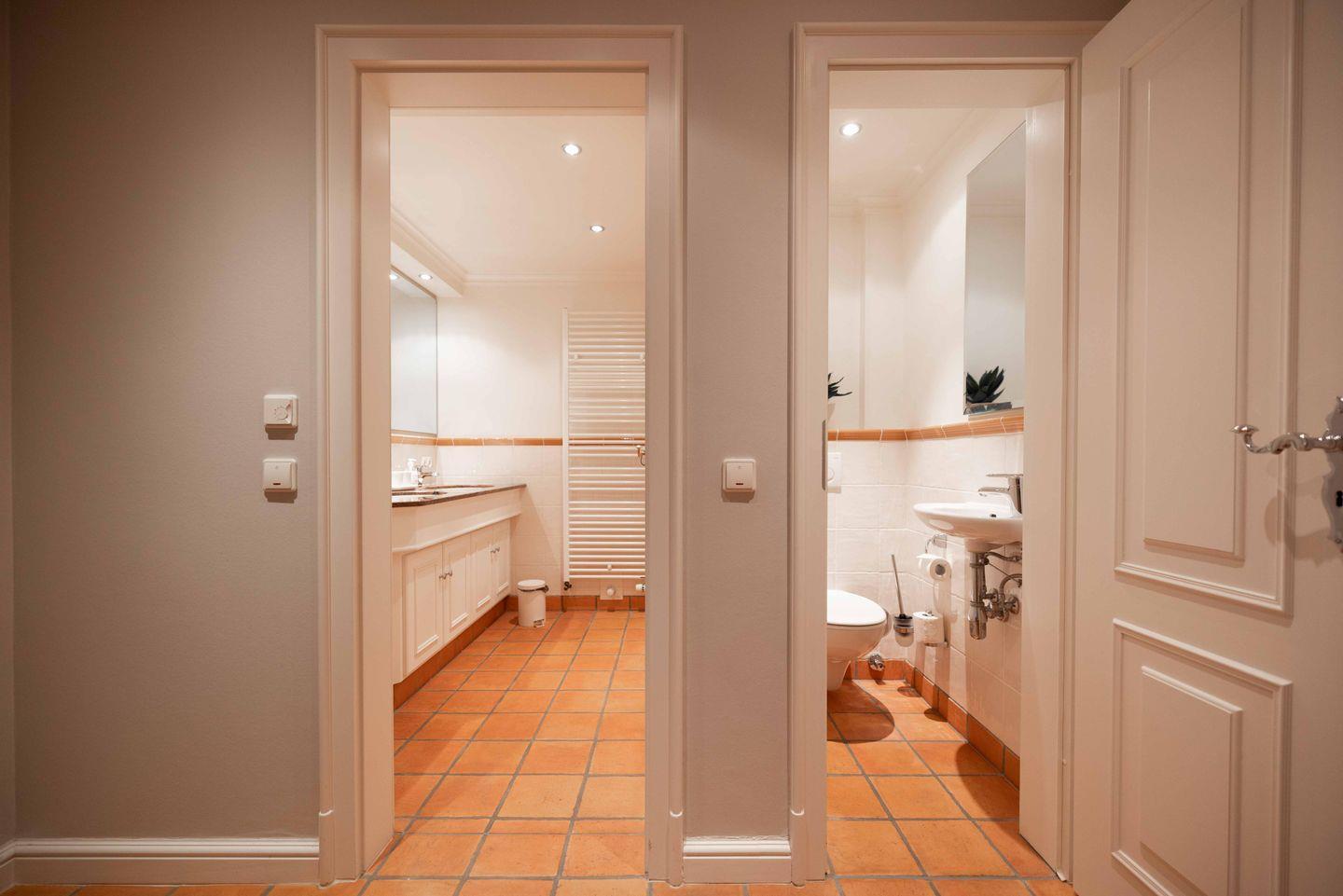 Auch im oberen Badezimmer kann mit vielen Ausstattungsdetails aufwarten. So gehören neben einer bodengleichen Dusche auch ein Bidet, Kosmetikspiegel und Föhn zu den vorhandenen Annehmlichkeiten. Auch hier sorgt eine Fußbodenheizung für Wärme und es sind Bademäntel und Handtücher vorhanden.
