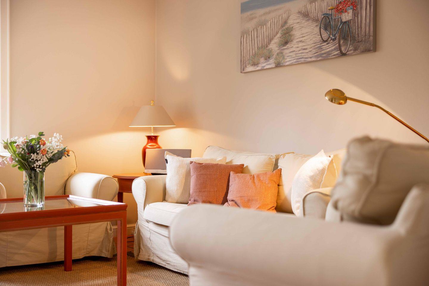 Im Wohnzimmer findet sich eine gemütliche Sitzgruppe, welche mit schönen Farbakzenten aufgelockert wird. Darüber hinaus finden sich im Wohnbereich auch eine Essecke und ein offener Kamin, welcher für besondere Behaglichkeit sorgt. Beheizt wird der Raum mit einer Fußbodenheizung. Ein SmartTV ist ebenso vorhanden wie ein Bluray-Player und eine Dockingstation für iPod, iPhone und iPad, so dass die Unterkunft über aktuellste Ausstattung verfügt. Die großen Fenster sind mit Insektenschutz-Rollos ausgestattet.