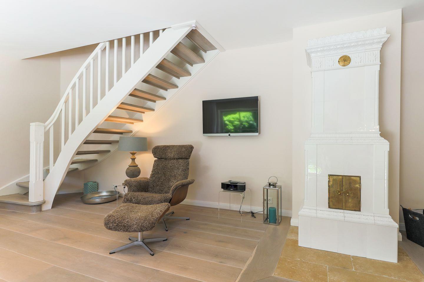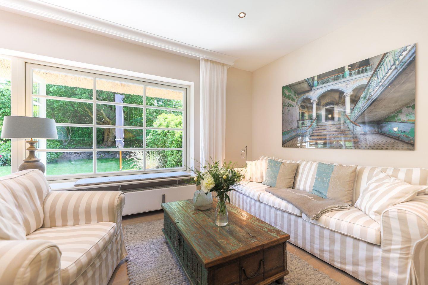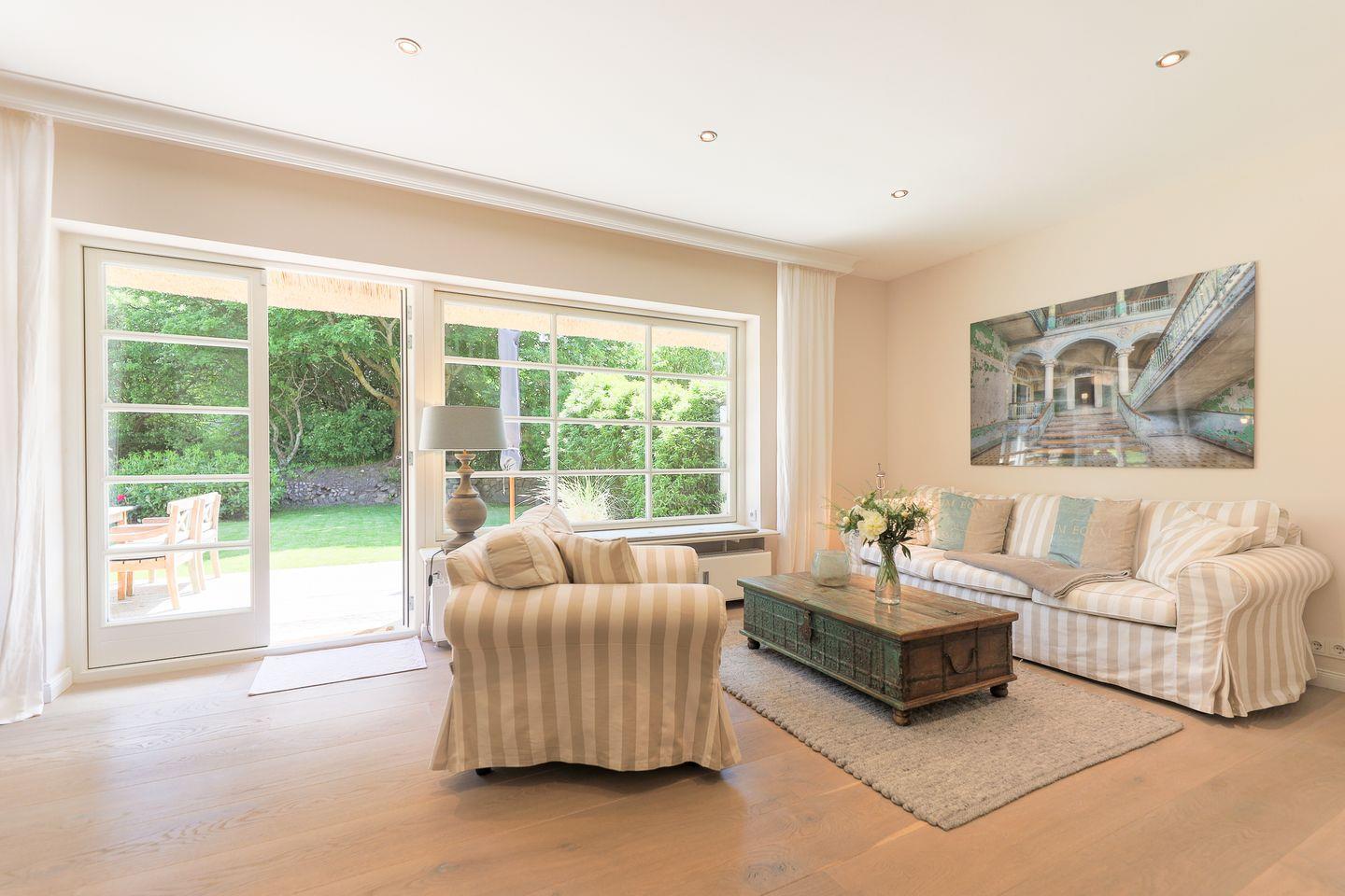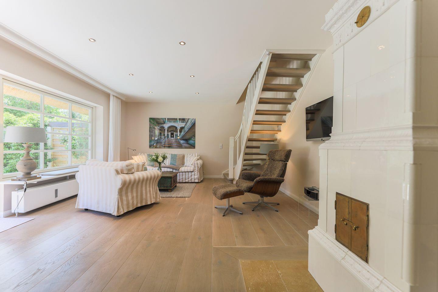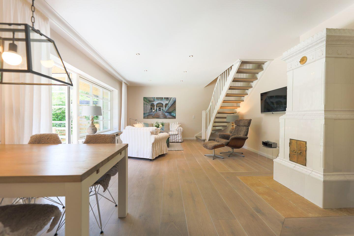 Dieses ganz besondere Haus vereint Offenheit und Privatsphäre ebenso wie stylisches Design und traditionelle Elemente. On top noch ein großer Garten mit Terrasse und Sauna. Was will man mehr? Der lichtdurchflutete Wohnraum ist offen gestaltet und wirkt weitläufig und luftig..Die Farbpalette bewegt sich, wie im gesamten Haus, im neutralen, natürlichen Bereich. Moderne Designermöbel bilden einen spannenden Kontrast zu den klassischen Elementen des Hauses wie dem original Schwedenofen und den Sprossenfenstern mit der breiten Fensterbank, die mit Kissen ausgestattet zum gemütlichen Sitzplatz mit Blick in den Garten wird.