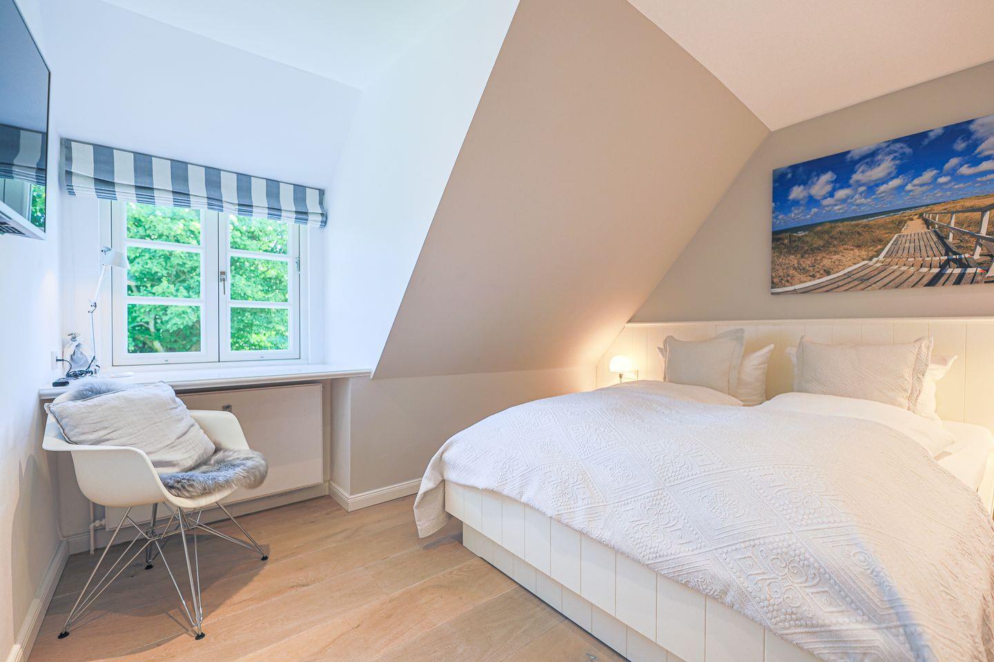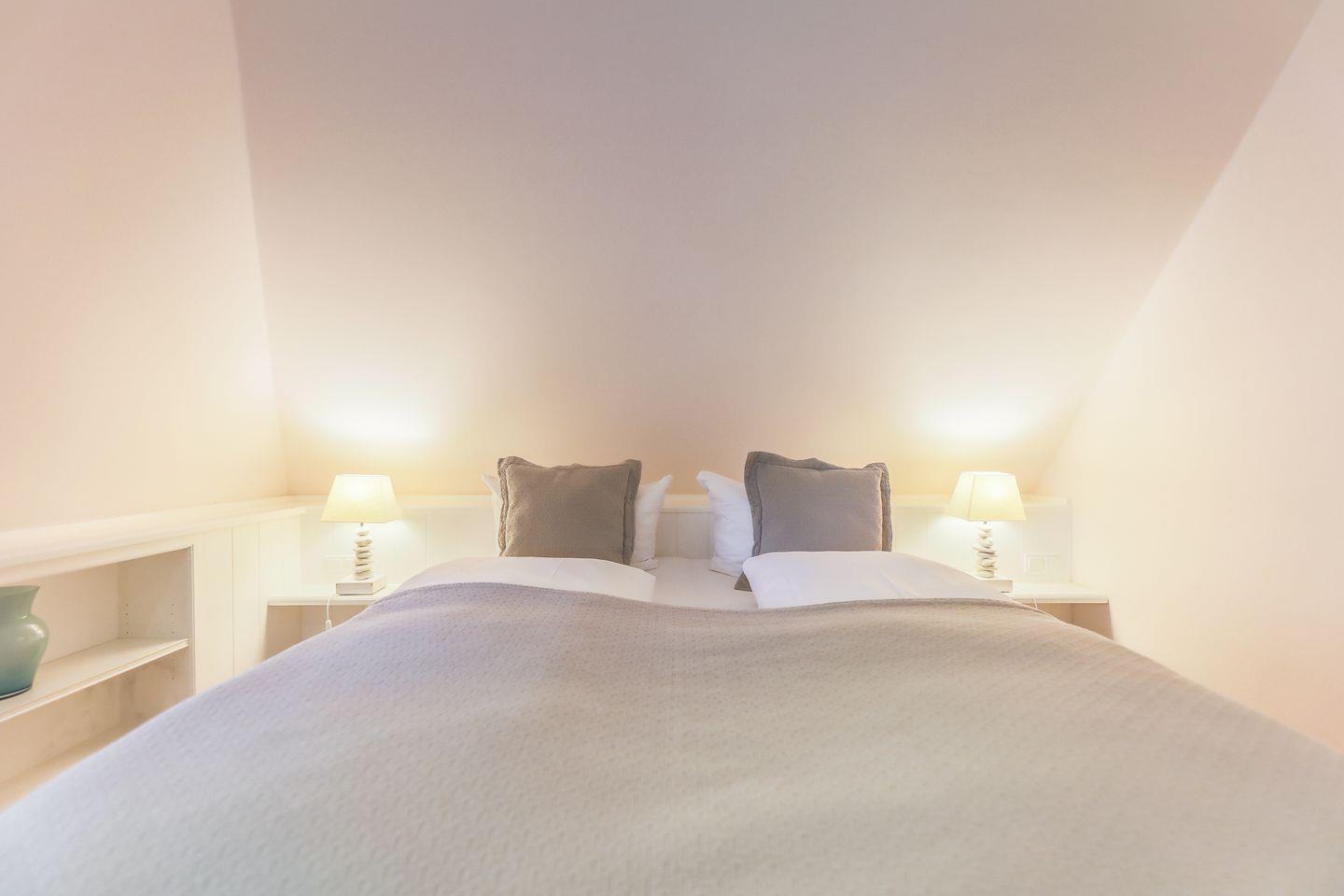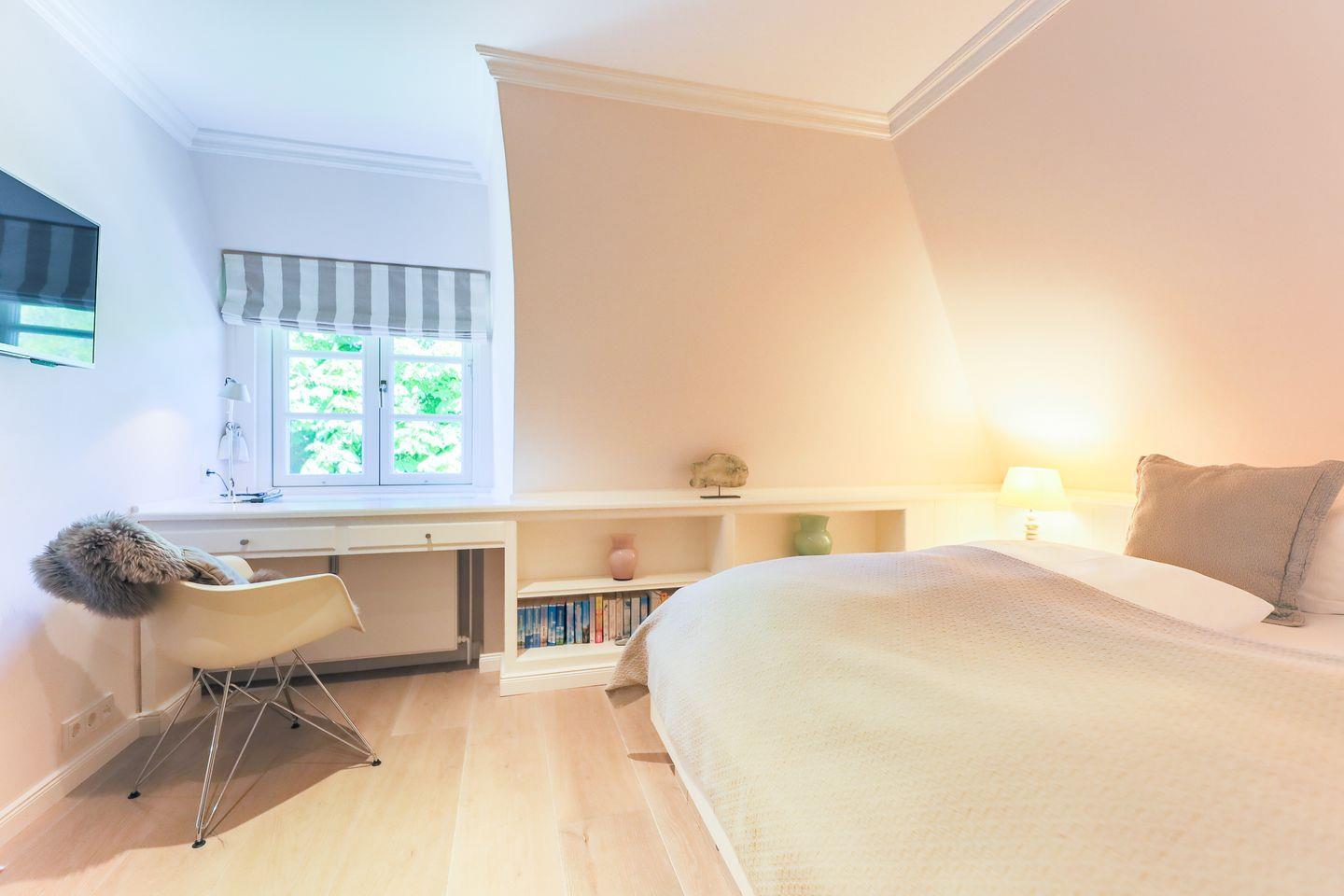 Unter dem Dach befinden sich die beiden Schlafzimmer, die dank der hübschen Sprossenfenster Fenster Ausblicke in den malerischen Garten bieten. Das Interior Design des restlichen Hauses wird auch hier wieder nahtlos aufgegriffen: Ganz viel Weiß, moderne, aber komfortable Möbel und gemütliche, raffinierte Details schaffen eine entspannte Atmosphäre.