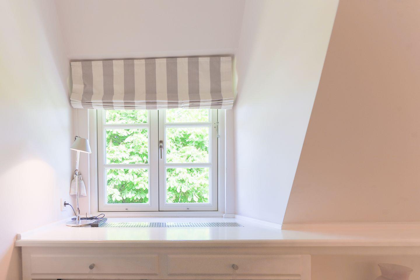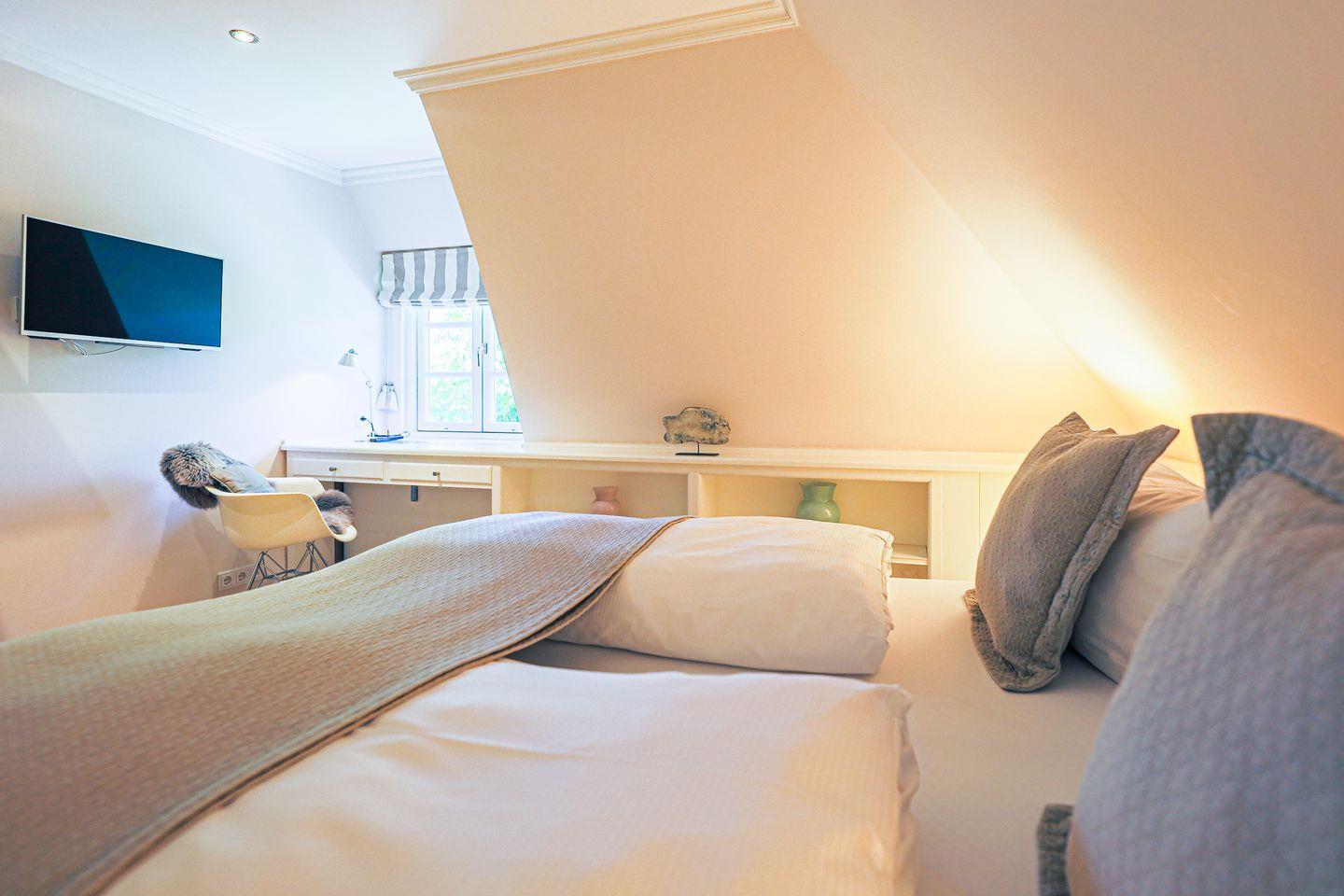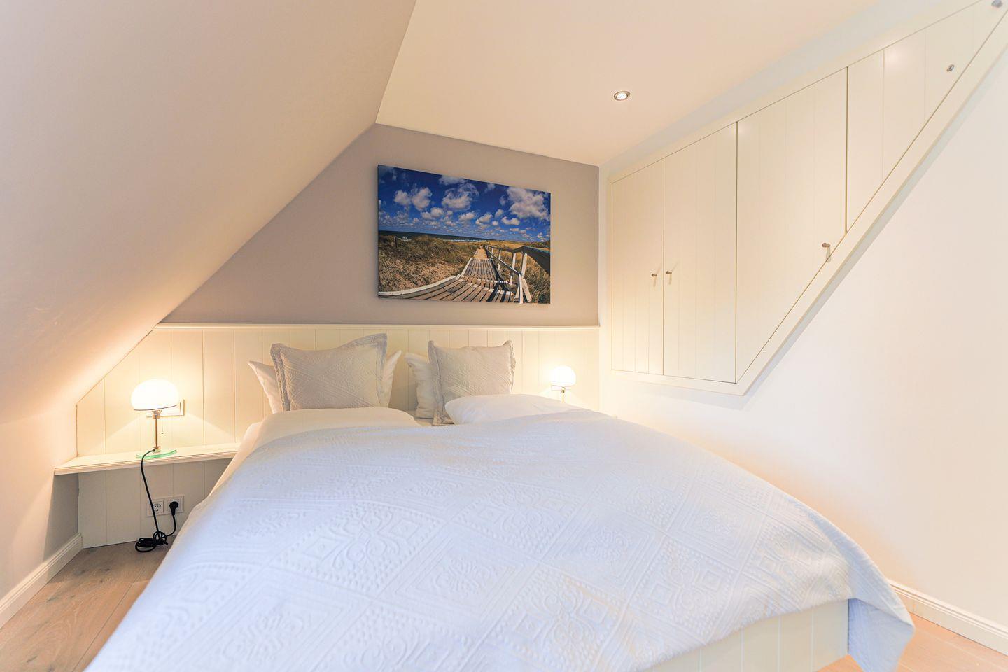 Unter dem Dach befinden sich die beiden Schlafzimmer, die dank der hübschen Sprossenfenster Fenster Ausblicke in den malerischen Garten bieten. Das Interior Design des restlichen Hauses wird auch hier wieder nahtlos aufgegriffen: Ganz viel Weiß, moderne, aber komfortable Möbel und gemütliche, raffinierte Details schaffen eine entspannte Atmosphäre.