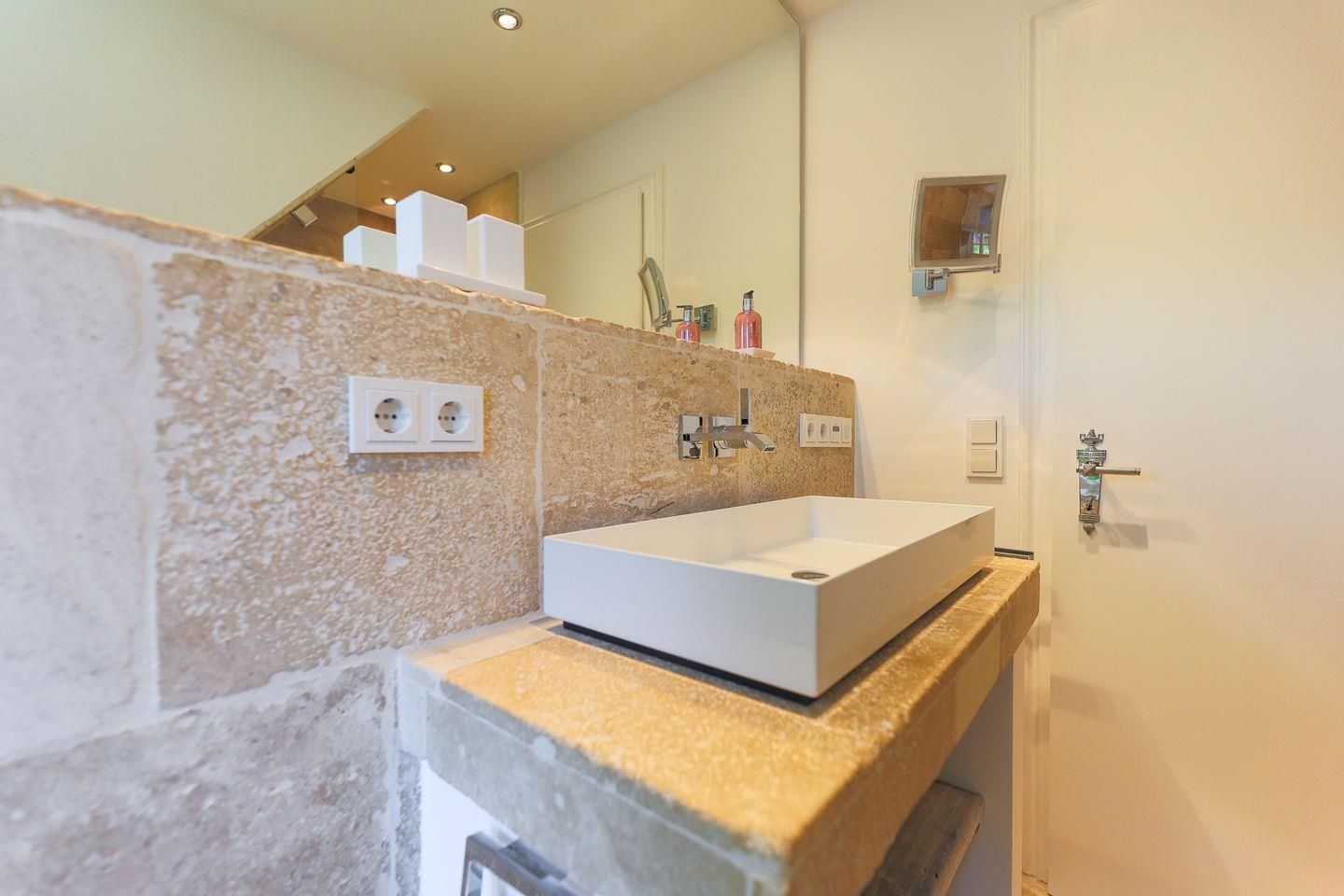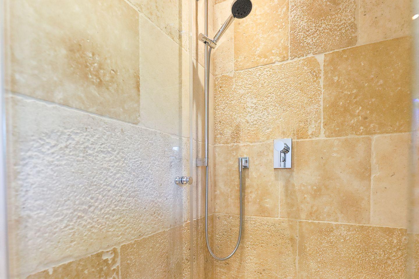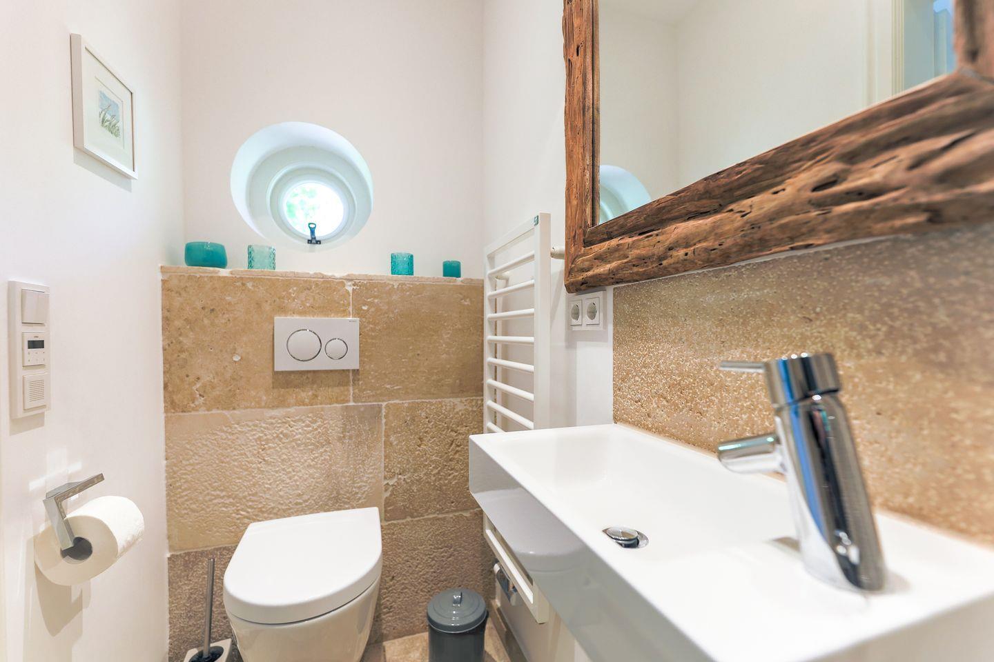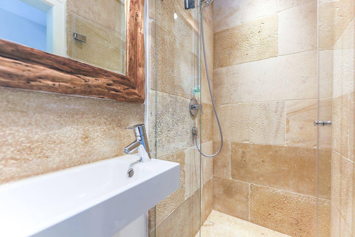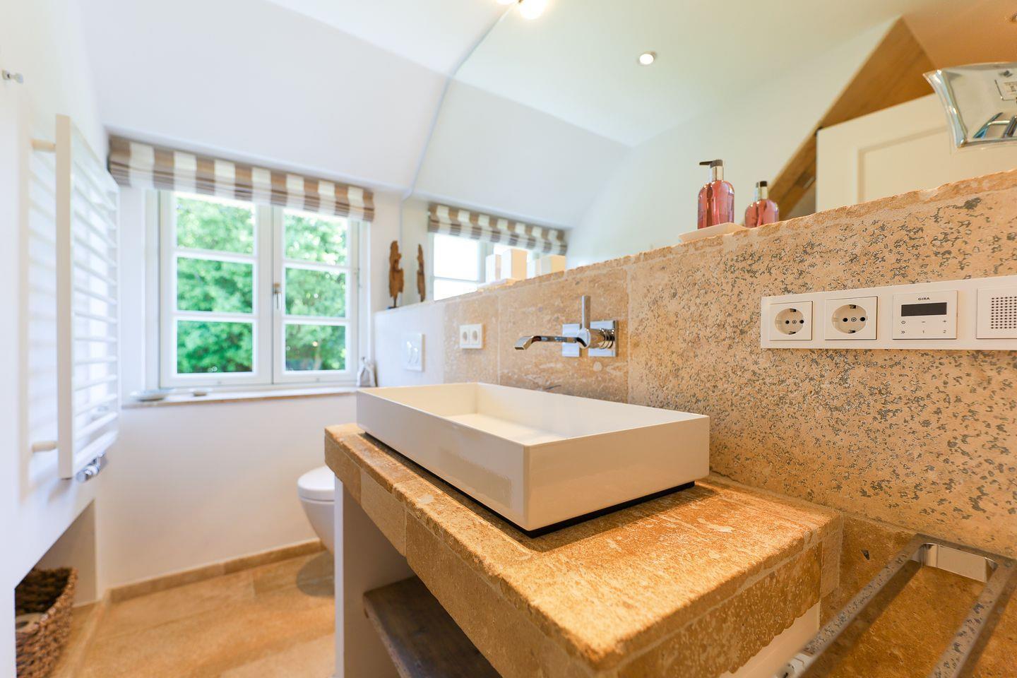 Die beiden Badezimmer hier strahlen mit beigem Naturstein und weißer Geradlinigkeit auf eine und reduzierte Weise Eleganz aus - die Ausstattung mit Regenshower-Dusche verspricht Luxus pur.