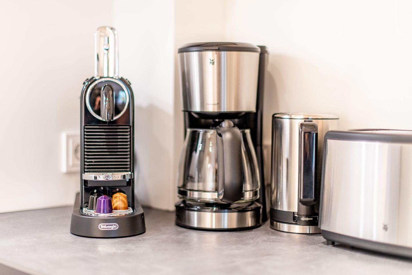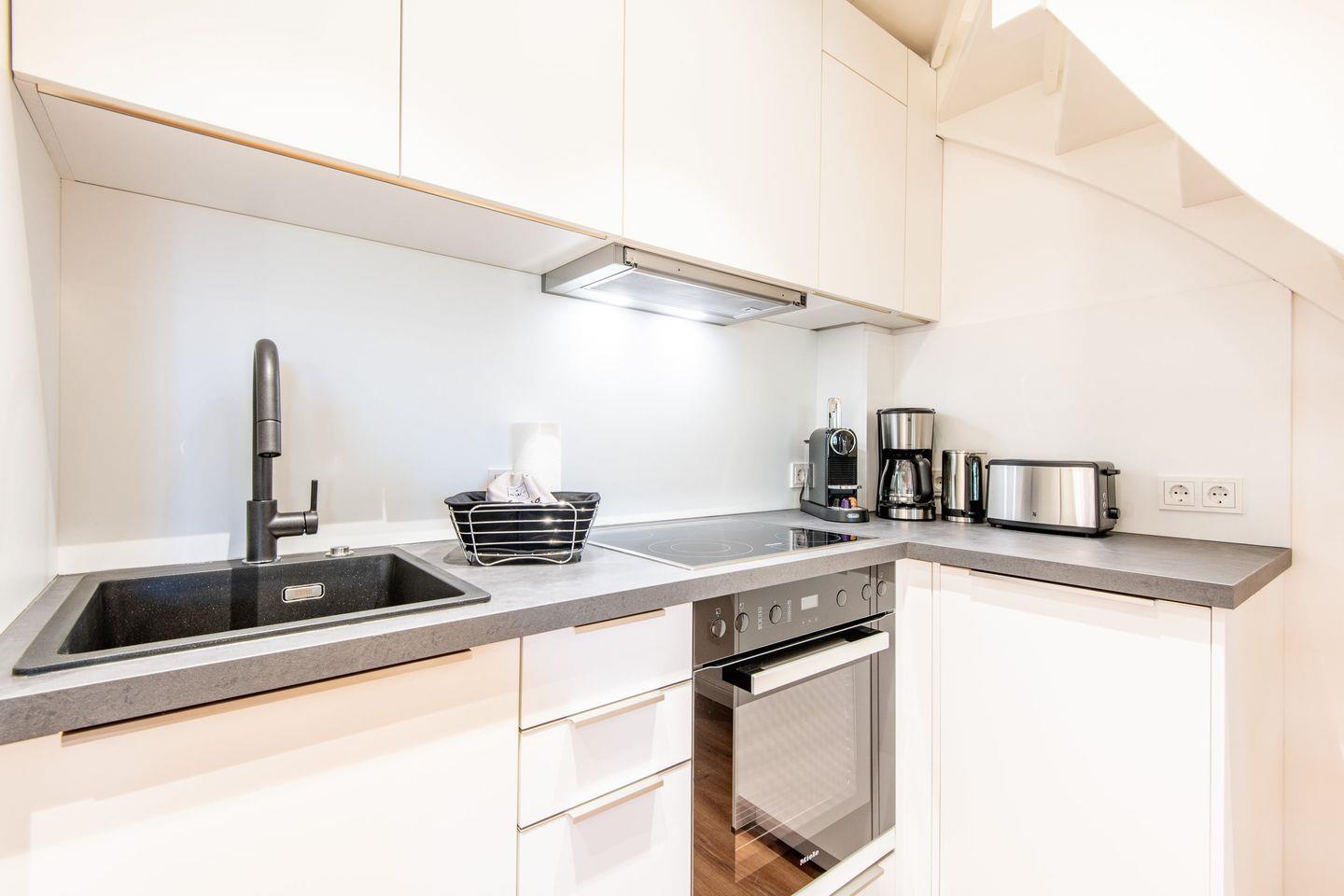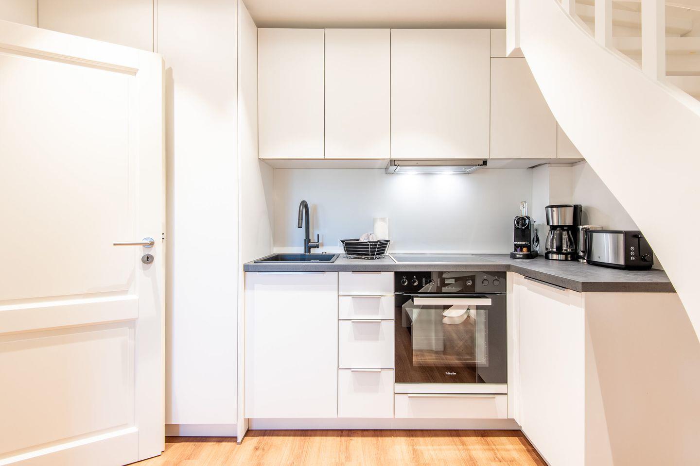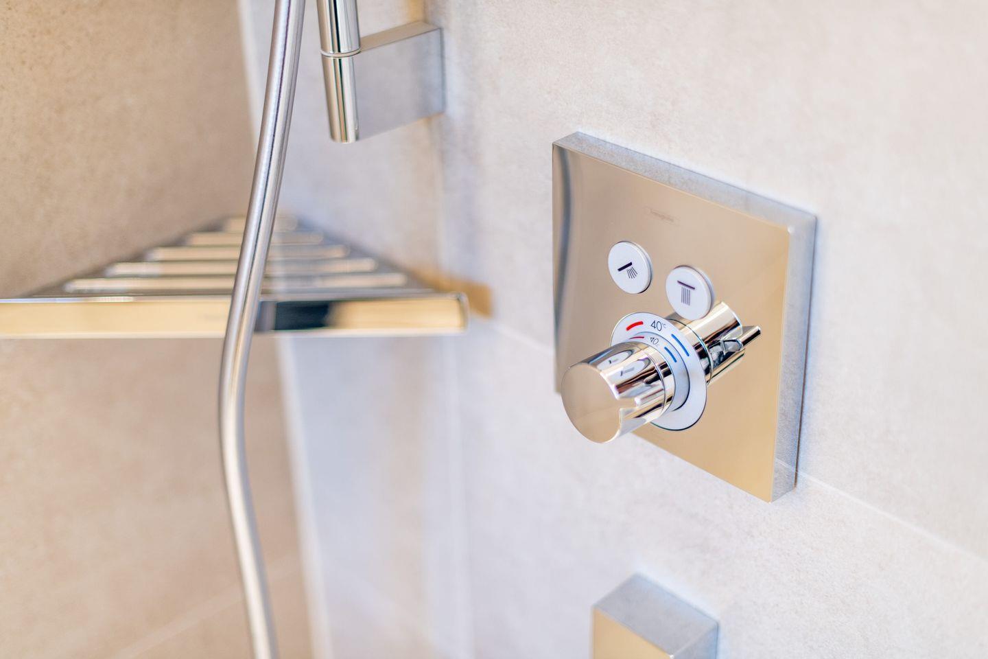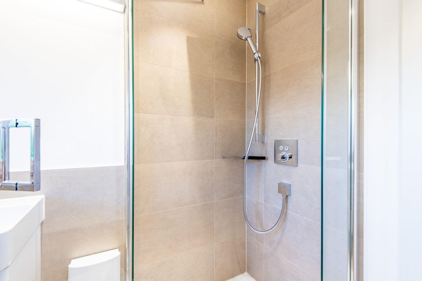 Das moderne Badezimmer verfügt über eine ebenerdige Dusche, ein WC, einen Handtuchwärmer und Tageslicht. Es bietet Ihnen den nötigen Komfort für einen entspannten Start in den Tag.