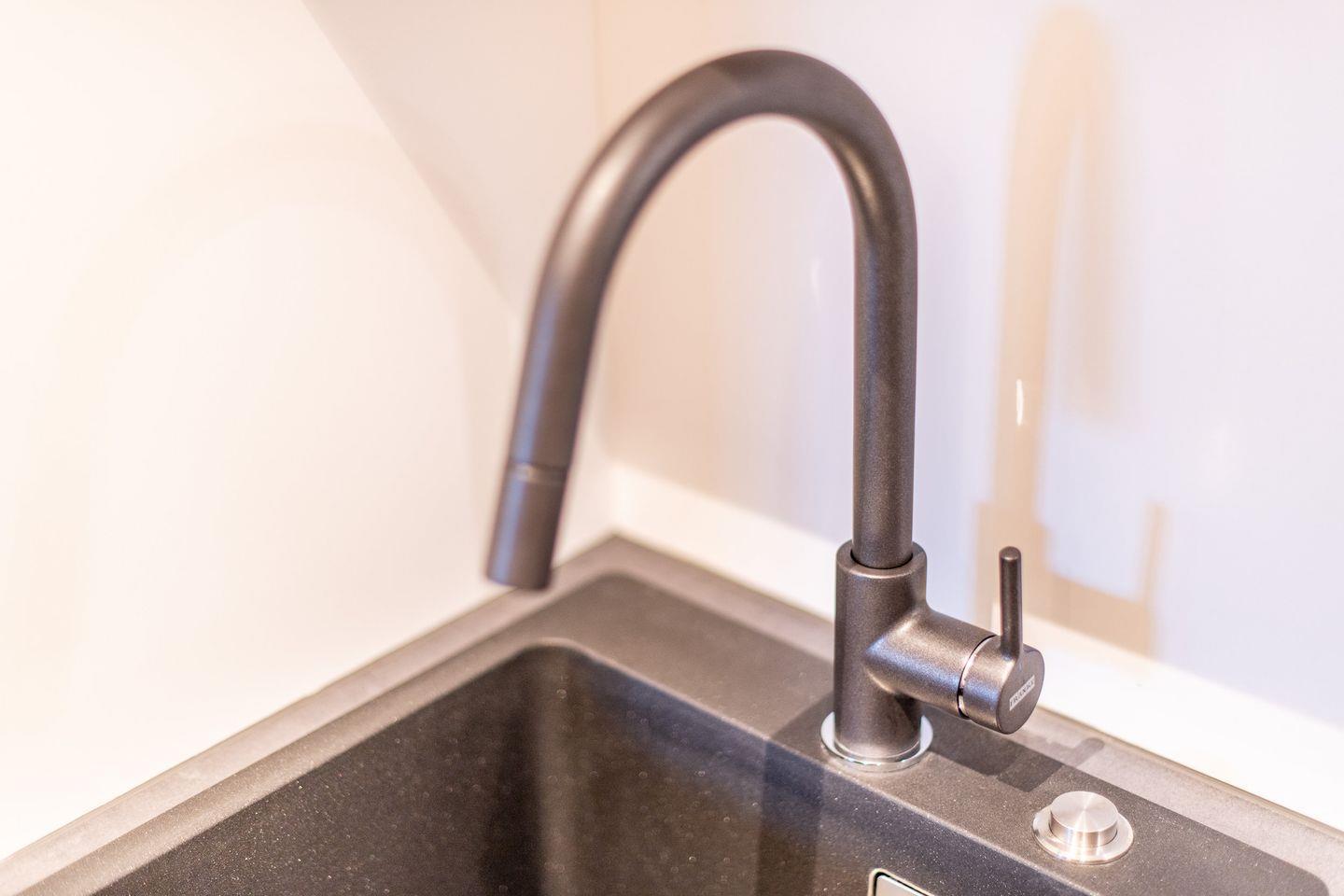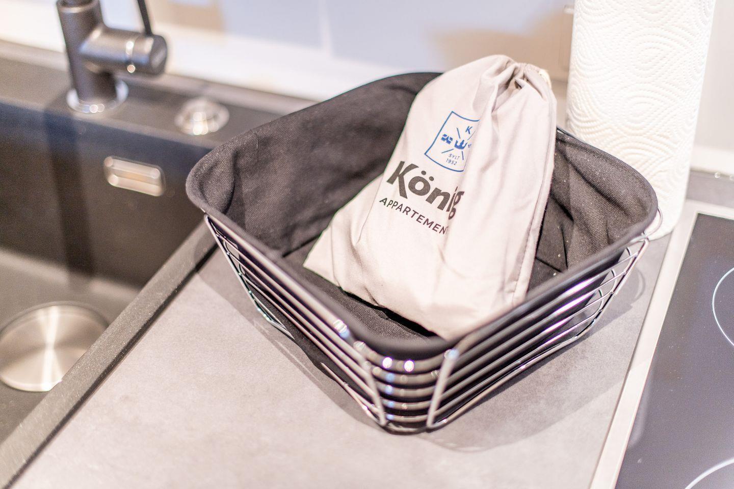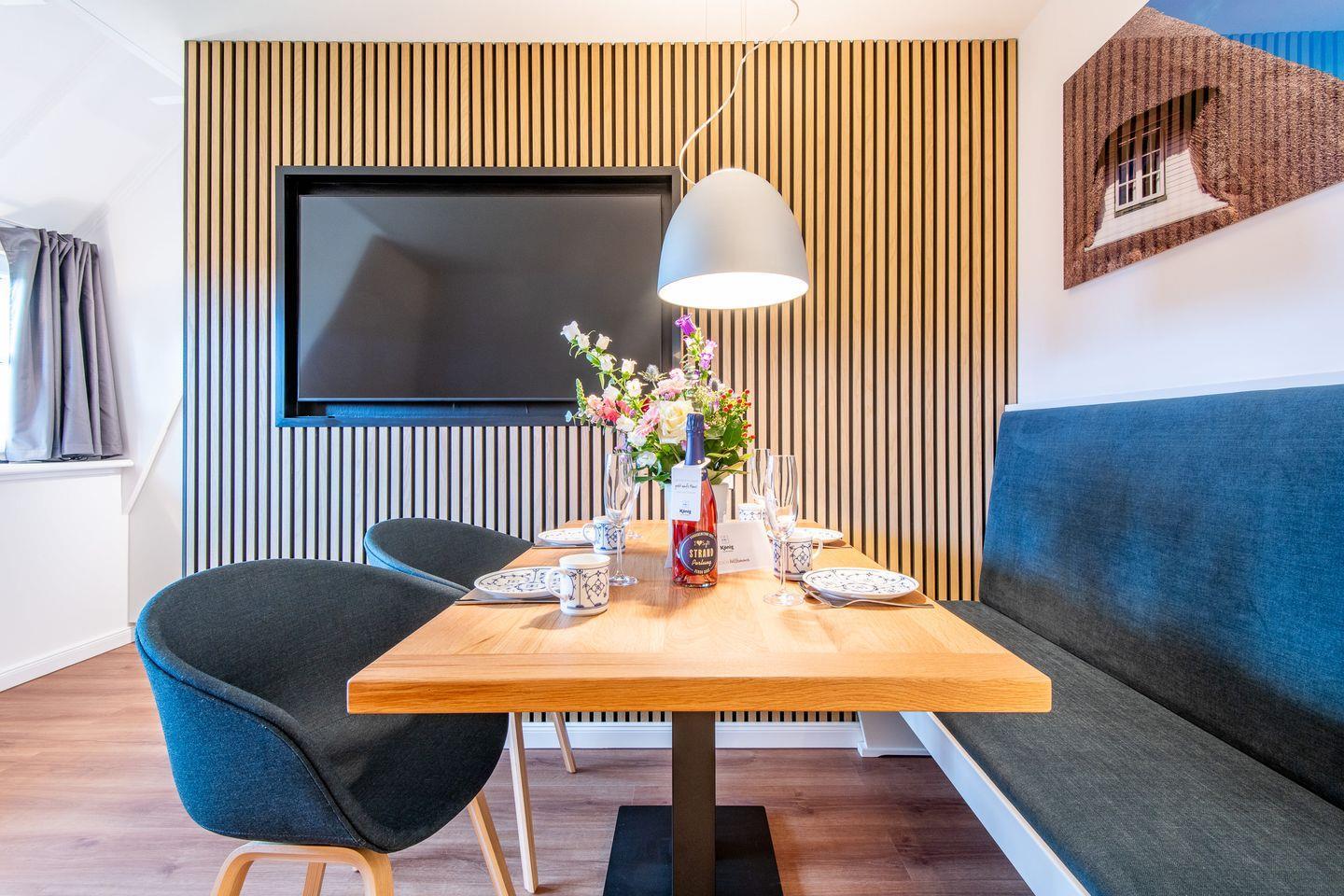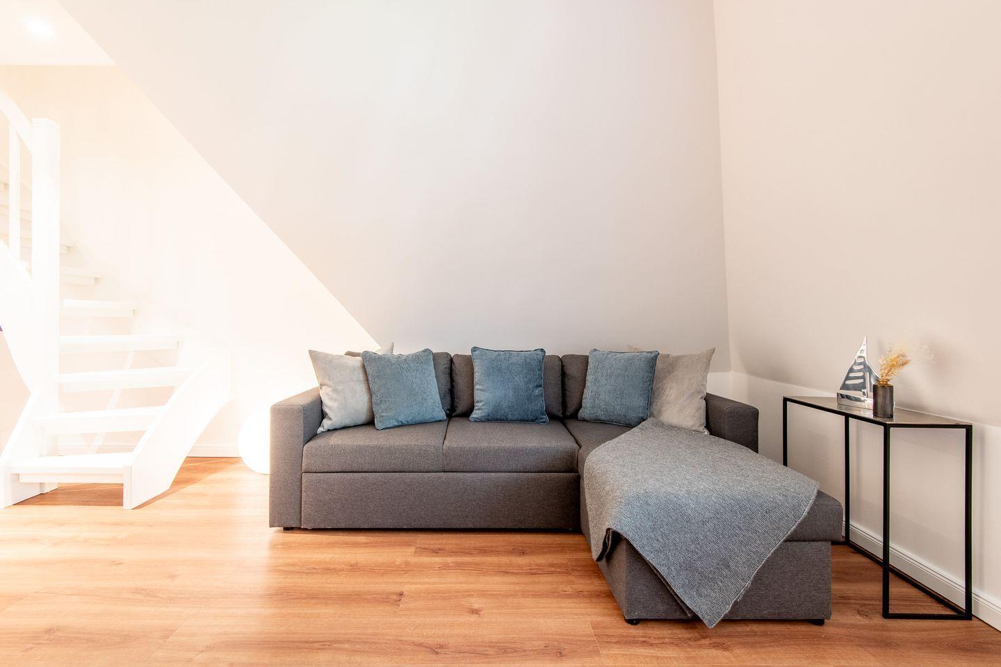Der gemütliche Wohnbereich lädt zum Entspannen ein und bietet ein komfortables Schlafsofa sowie einen Essbereich für gemeinsame Mahlzeiten. Große Fenster lassen viel Tageslicht herein und schaffen eine helle und freundliche Atmosphäre. Die offene Küche ist voll ausgestattet und verfügt über moderne Geräte wie eine Spülmaschine, einen Backofen und eine Mikrowelle – ideal für die Zubereitung köstlicher Mahlzeiten in gemütlicher Runde.