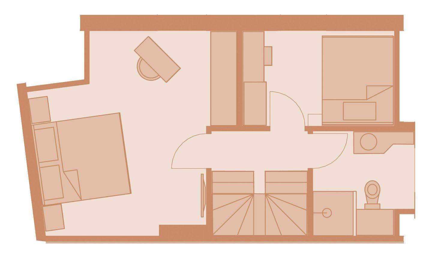 Obergeschoss: 1 Doppelzimmer mit TV, 1 Einzelzimmer mit TV, Badezimmer mit Dusche und WC