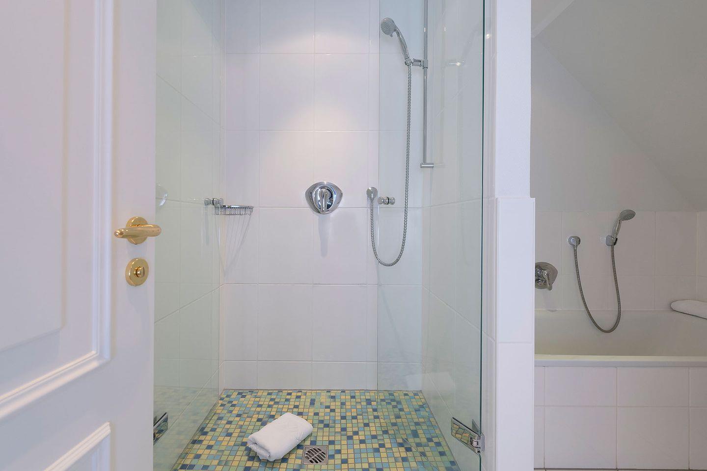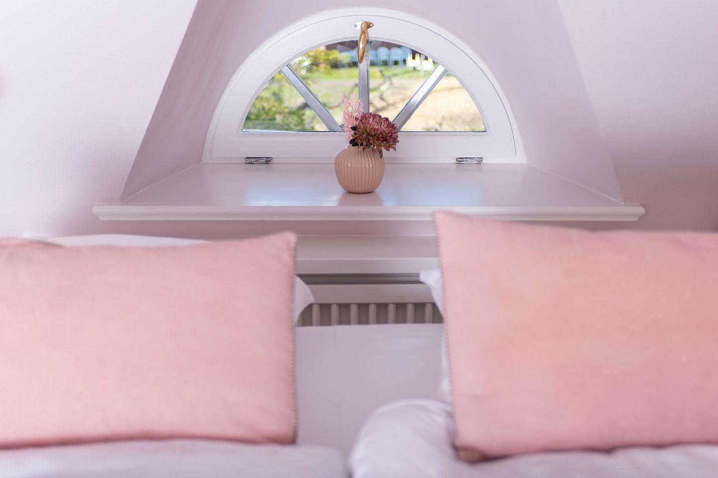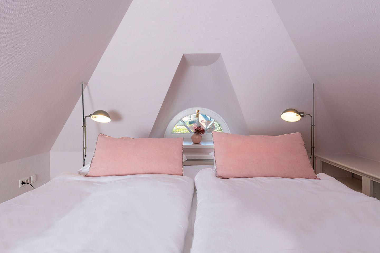 Das Ferien Domizil »Du¨nensand« befindet sich in Obergeschoss und Spitzgiebel des Groot's Hu¨s und bietet fu¨r maximal vier Personen mit 70 m² ausreichend Platz, um gemeinsam auf zwei Ebenen entspannte Urlaubstage zu verbringen. Ein wunderbarer, sonnenbeschienener Terrassenplatz im Gemeinschaftsgarten mit Strandkorb und Gartenmöbeln erweitert den Wohnbereich im Gru¨nen.
