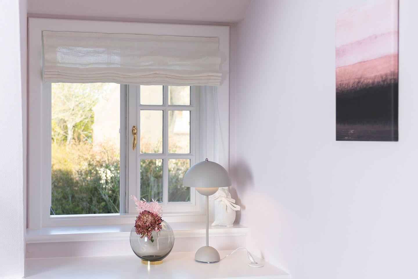 Die Farben der Inneneinrichtung verkörpern Achtsamkeit, Fu¨rsorge und Naturverbundenheit. Die nudefarbenen Wände bieten den perfekten Rahmen fu¨r minimalistisches, zeitloses Design wie z.B. fu¨r die 1968 vom dänischen Designer Verner Panton entworfene Tischleuchte »Flowerpot« und die von Broberg & Ridderståle fu¨r das Interior-Label Muuto designte filigrane »Leaf LED« Tischleuchte. Leben im Ferien Domizil »Du¨nensand« verspricht Wohnen in luftigen Räumen mit zwei Schlafräumen und zwei Bädern. Es bietet den perfekten Rahmen fu¨r ein gemu¨tliches Miteinander von Familie und Freunden. Der Wohn- und Essbereich ist mit einer modernen, kompakten Ku¨chenzeile ausgestattet.