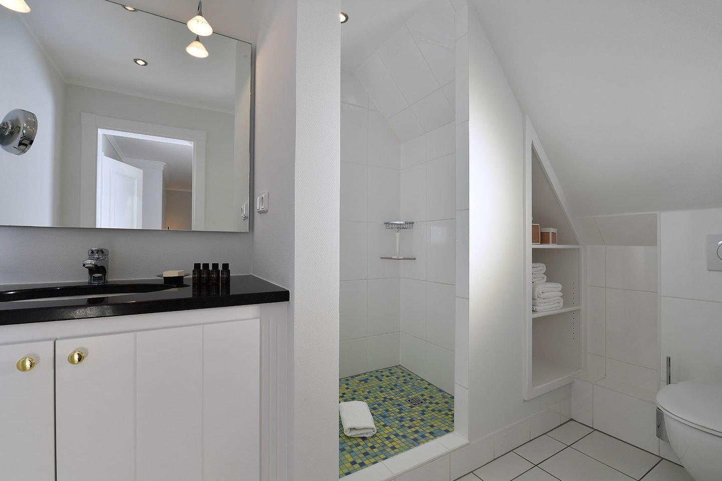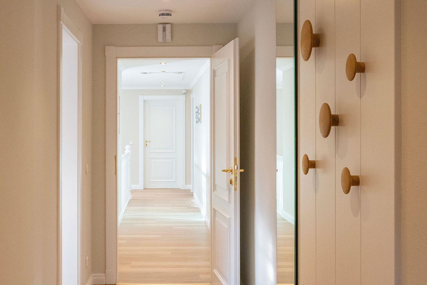 Obergeschoss: Flur, 1 Doppelzimmer mit angrenzendem Bad mit Dusche und WC, Ess- und Wohnbereich im skandinavisch-modernem Stil mit TV, offene Küche mit Nespressomaschine, ein weiteres Bad mit Badewanne, Dusche und WC