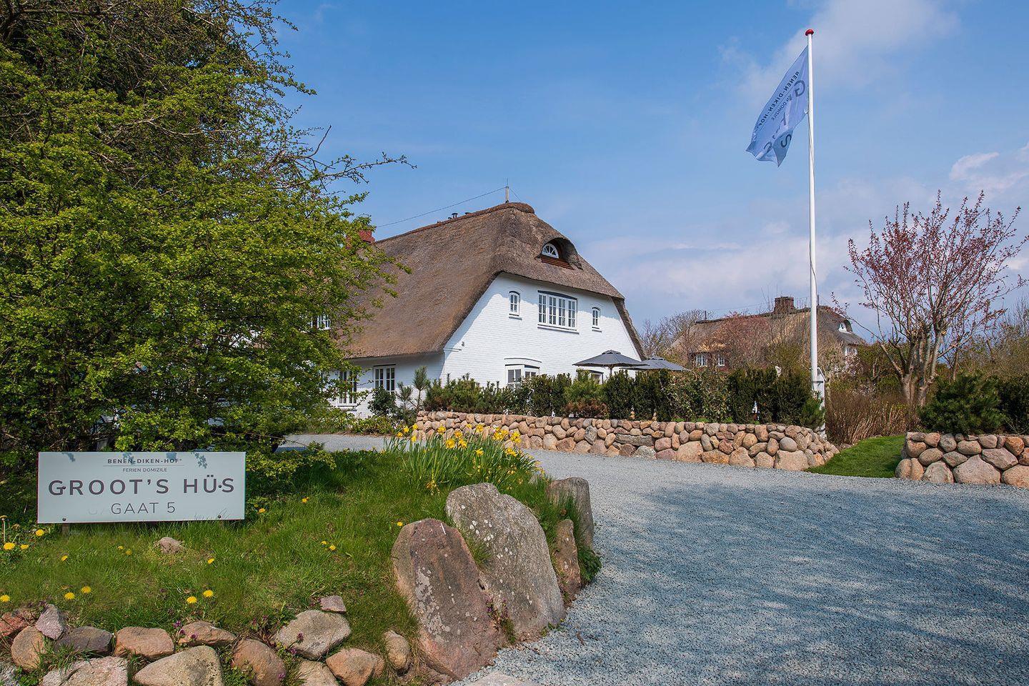 Das Groot‘s Hu¨s Mitten im Herzen des idyllischen Kapitänsdorfes Keitum, auf einem großen Grundstu¨ck mit altem Baumbestand, befinden sich die im Fru¨hjahr 2021 vollständig renovierten und im »Nordisch-Skandi-Style« eingerichteten Ferien Domizile des Groot‘s Hu¨s. In unmittelbarer Nähe gibt es eine Vielzahl attraktiver Geschäfte, Boutiquen und Kunsthandwerker. Auf einem Spaziergang durch das schöne Keitum erreicht erreicht man die nur 500 m entfernte Wattseite der Insel innerhalb weniger Minuten.