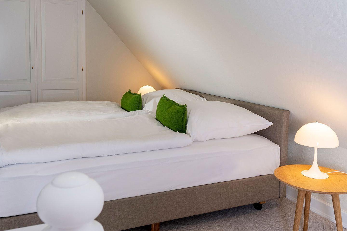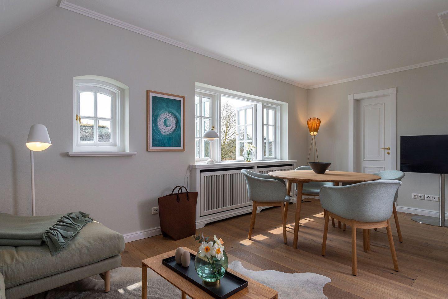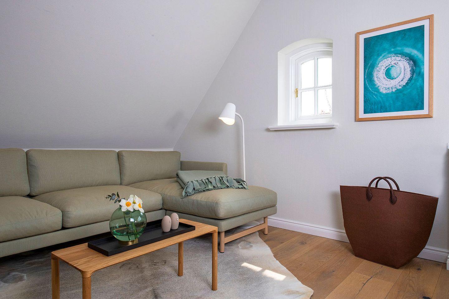Das Ferien Domizil »Meeresrauschen« befindet sich in Obergeschoss und Spitzgiebel des Groot‘s Hu¨s und bietet fu¨r maximal vier Personen mit 84 m² ausreichend Platz, um gemeinsam auf zwei Ebenen entspannte Urlaubstage zu verbringen. Ein wunderbarer sonnenbeschienener Terrassenplatz im Gemeinschaftsgarten mit Strandkorb und Gartenmöbeln erweitert den Wohnbereich im Gru¨nen. Die minimalistische Inneneinrichtung und die Farben von »Light Sand« bis »Ocean« vermitteln eine Stimmung von Ruhe und Wohlbehagen. Neben nordischen Designklassikern wie z.B. die 1968 vom dänischen Designer Verner Panton entworfene Tischleuchte »Flowerpot« wurden moderne Klassiker wie der »Calmo Seater Chaise« von Hugo Passos ausgewählt. Der Wohn-Essraum ist mit einer modernen, kompakten Ku¨chenzeile ausgestattet. Leben im Ferien Domizil »Meeresrauschen« verspricht Wohnen in luftigen Räumen mit zwei Schlafräumen und zwei Bädern.