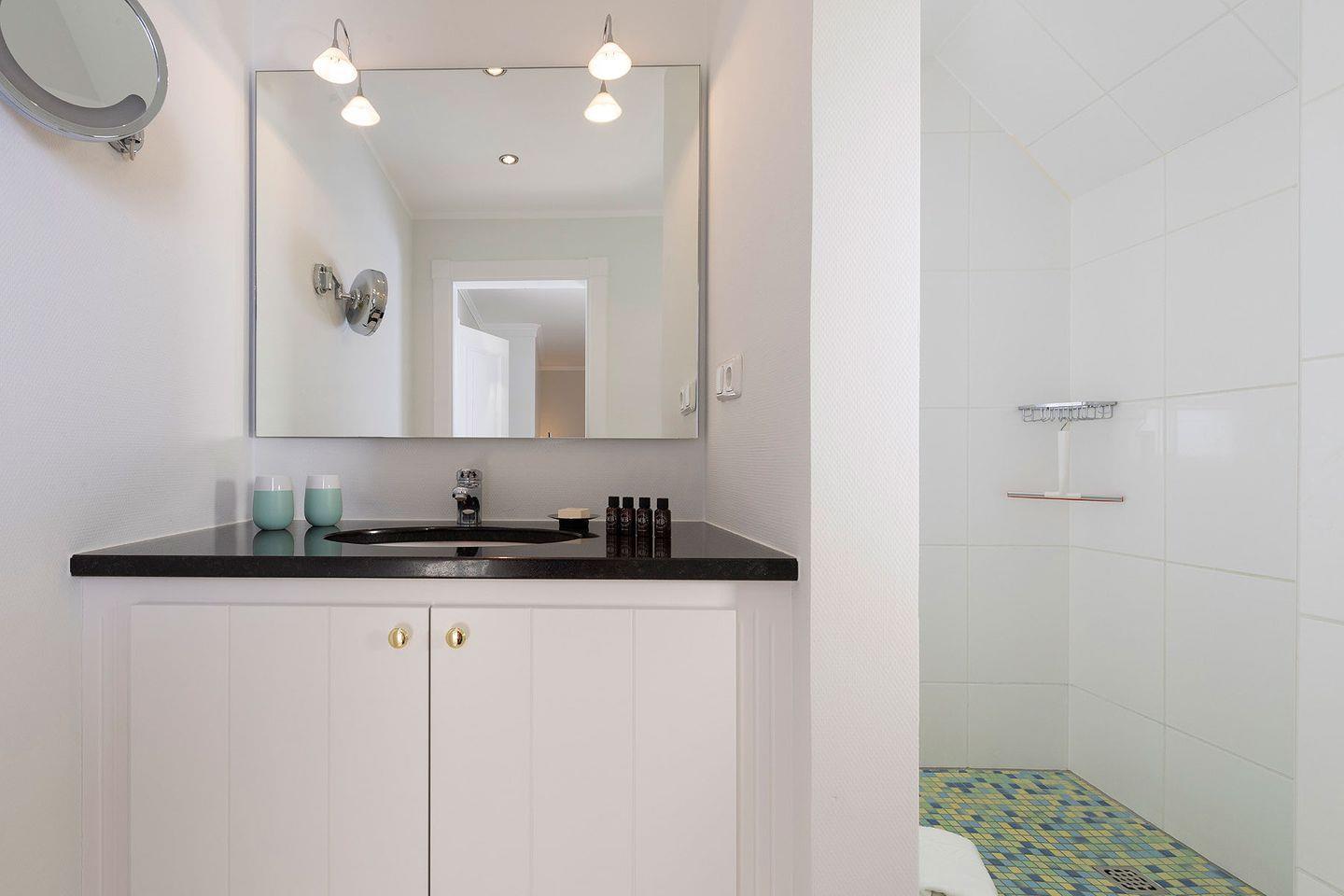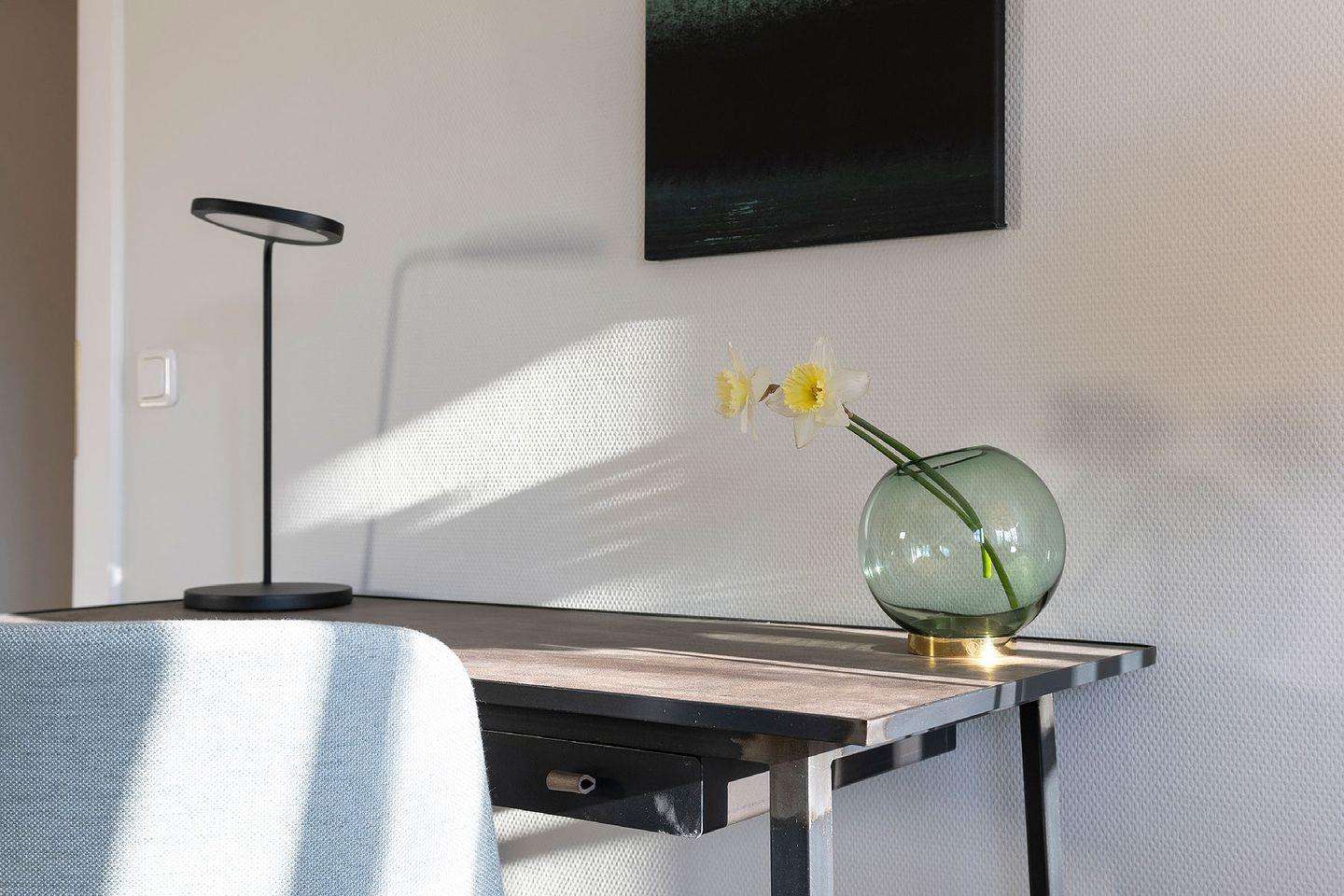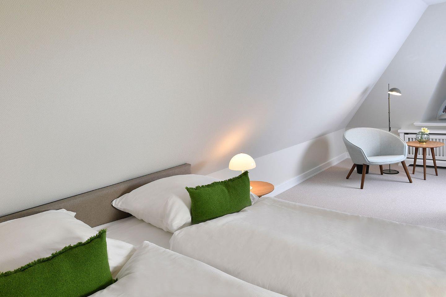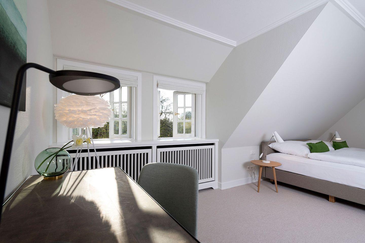 Das Ferien Domizil »Meeresrauschen« befindet sich in Obergeschoss und Spitzgiebel des Groot‘s Hu¨s und bietet fu¨r maximal vier Personen mit 84 m² ausreichend Platz, um gemeinsam auf zwei Ebenen entspannte Urlaubstage zu verbringen. Ein wunderbarer sonnenbeschienener Terrassenplatz im Gemeinschaftsgarten mit Strandkorb und Gartenmöbeln erweitert den Wohnbereich im Gru¨nen. Die minimalistische Inneneinrichtung und die Farben von »Light Sand« bis »Ocean« vermitteln eine Stimmung von Ruhe und Wohlbehagen. Neben nordischen Designklassikern wie z.B. die 1968 vom dänischen Designer Verner Panton entworfene Tischleuchte »Flowerpot« wurden moderne Klassiker wie der »Calmo Seater Chaise« von Hugo Passos ausgewählt. Der Wohn-Essraum ist mit einer modernen, kompakten Ku¨chenzeile ausgestattet. Leben im Ferien Domizil »Meeresrauschen« verspricht Wohnen in luftigen Räumen mit zwei Schlafräumen und zwei Bädern.