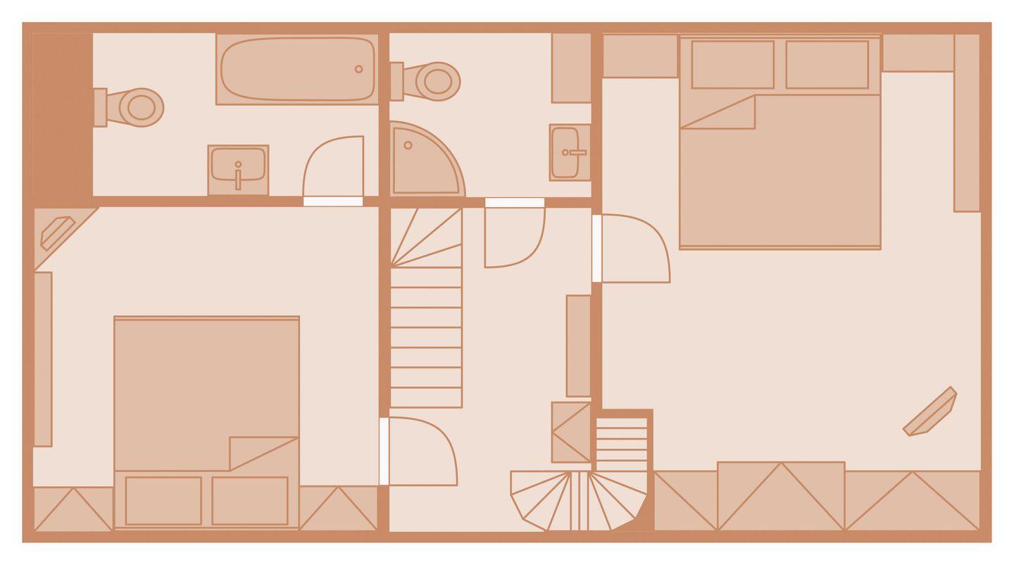 Obergeschoss: 2 Doppelzimmer mit TV, 1 ensuite Badezimmer mit Duschwanne und WC, 1 Badezimmer mit Dusche und WC